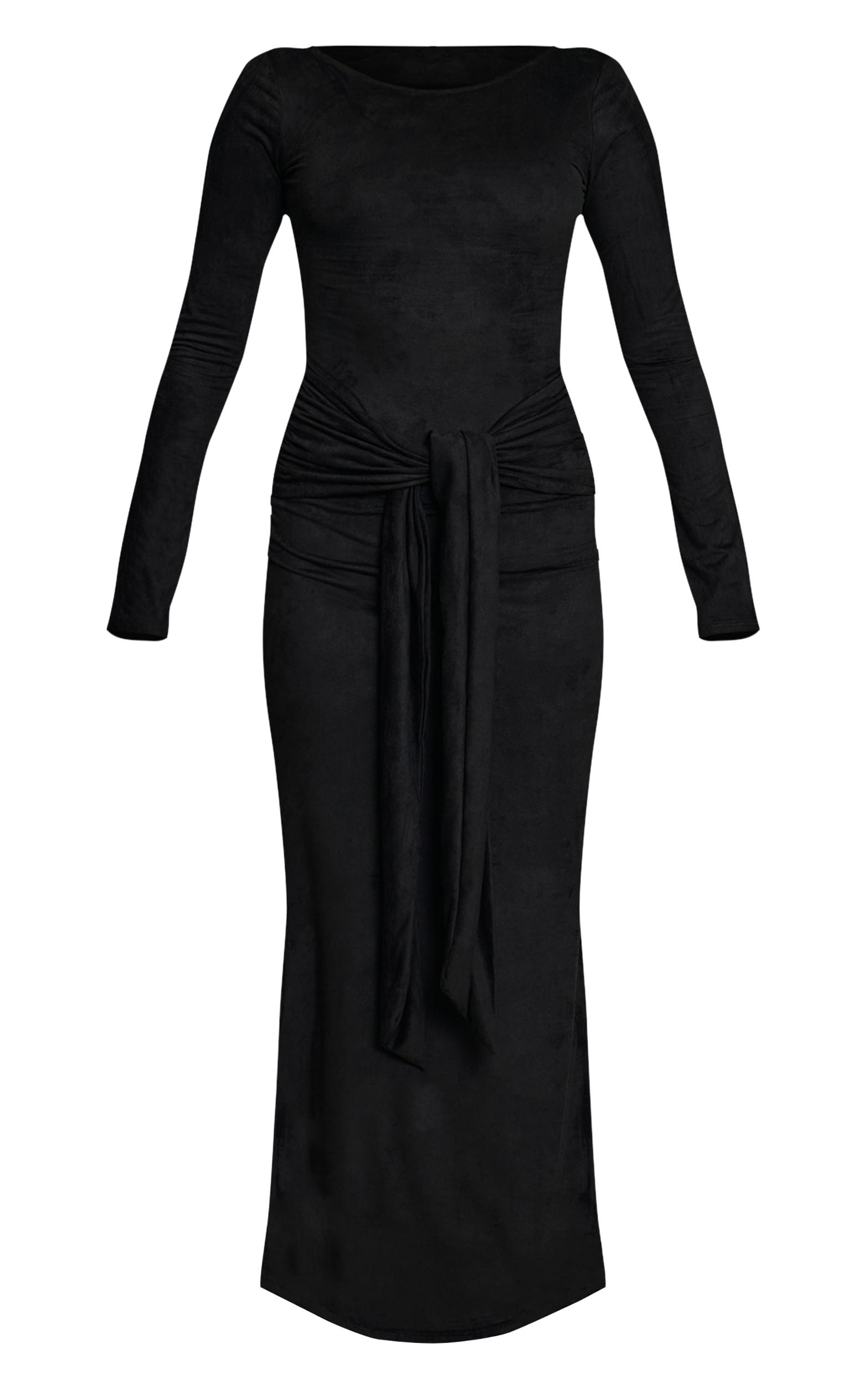 Command attention in the artful black faux suede knot detail long sleeve maxi dress. Presented in black faux suede, this bodycon maxi dress boasts a sophisticated scoop neckline and an artful knot detail at the waist with an extended sash. This sophisticated piece is perfect for curating an elevated day look, from city explorations to refined daytime events. Refine this artful design with heeled boots, a tailored longline coat, and elegant drop earrings for a curated chic ensemble.Length approx 155cm/61inch (Based on sample size US 4)Model wears size UK 8/ EU 36/ AUS 8/ US 4Model Height - 5ft 9inchp]:!mb-4inch>Brand: PrettyLittleThingCategory: DressesProduct type: Bodycon DressColor: BlackMaterial: Single JerseySleeves: LongOccasion: Day