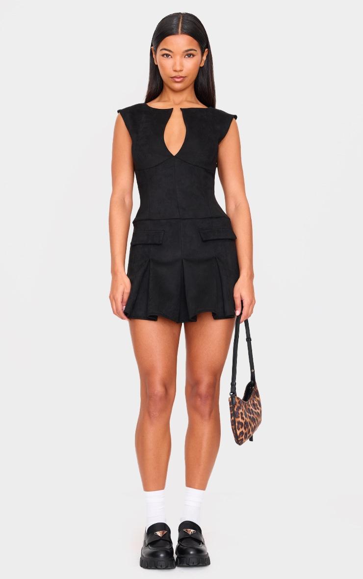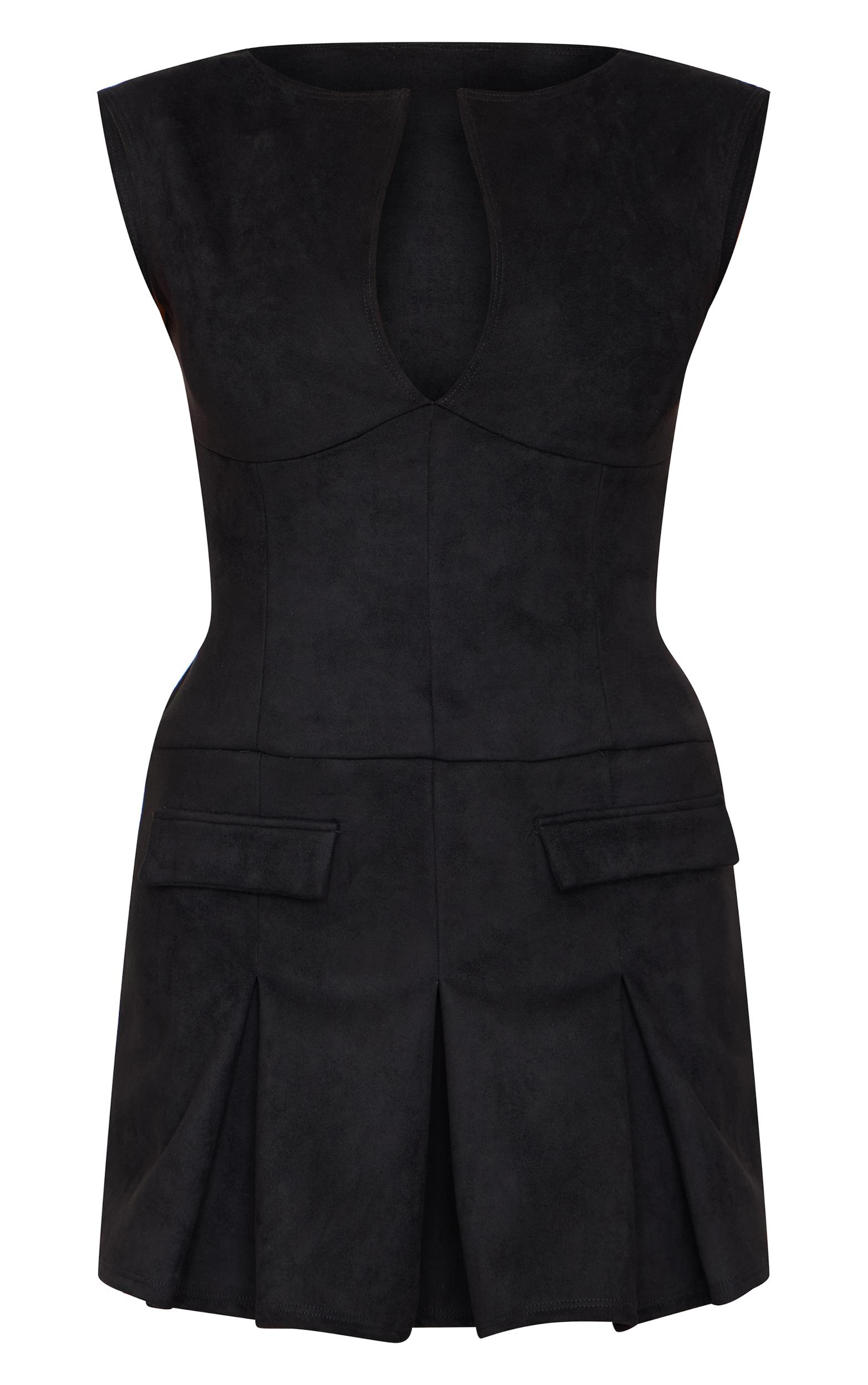 Make an entrance in this black faux suede pleated pocket detail shift dress. Brought to you in black faux suede, this dress has pleat detailing, pockets and a cut out detail at the neckline. Pair it with black barely-there stiletto heels and simplistic jewelry for a sophisticated finish. Model Height - 5ft 6inchp]:!mb-4inch>Brand: PrettyLittleThingCategory: DressesProduct type: Shift DressColor: BlackMaterial: Faux SuedeDesign: PlainNeckline: PlungeSleeves: SleevelessOccasion: Day