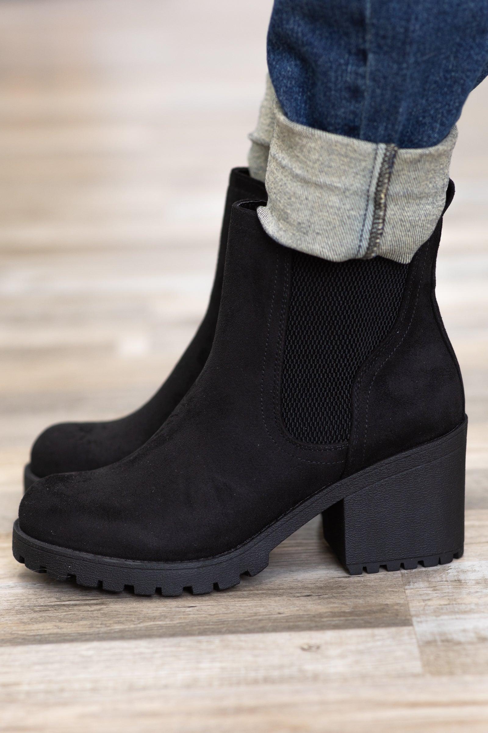 Product Details Colors: Black Print: Solid Heel: 2.5" Other Details: Elastic Side Panels Brand: Soda Size and Fit True to Size