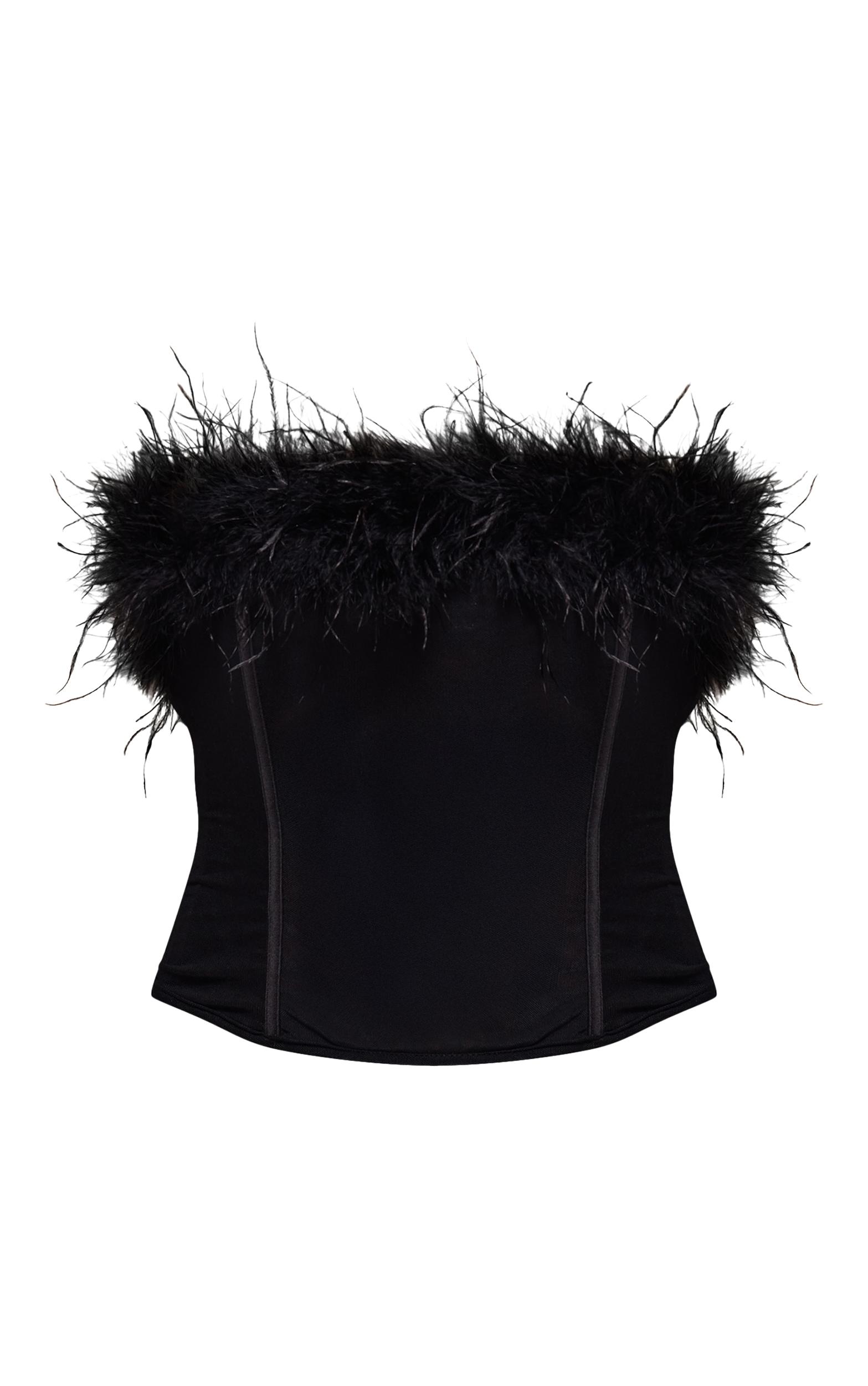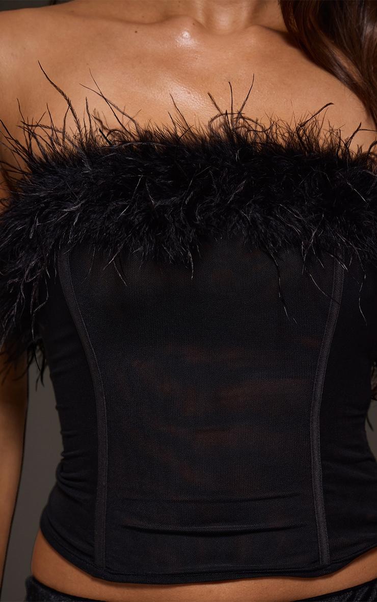 Master after-dark allure with a piece that redefines the statement top. The black feather mesh boned corset delivers instant impact, featuring a striking strapless neckline crowned by a dramatic feather trim that catches the light with every move. Its artfully constructed mesh bodice, defined by sleek boning, sculpts a confident profile, while the cropped length ensures a modern finish. Pair this discerning piece with high-waisted shorts for an elevated aesthetic, grounded by sharp black heels and finished with delicate stud earrings to complete your knowing ensemble.Length approx 34.5cm/13.5inch (Based on sample size US 4)Model wears size UK 8/ EU 36/ AUS 8/ US 4Model Height - 5ft 8inchp]:!mb-4inch>Brand: PrettyLittleThingCategory: TopsProduct type: CorsetColor: BlackMaterial: MeshOccasion: Evening