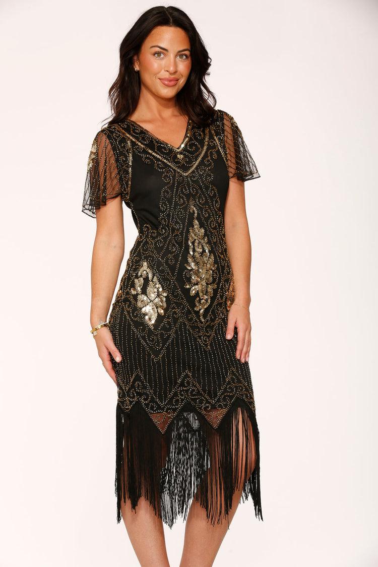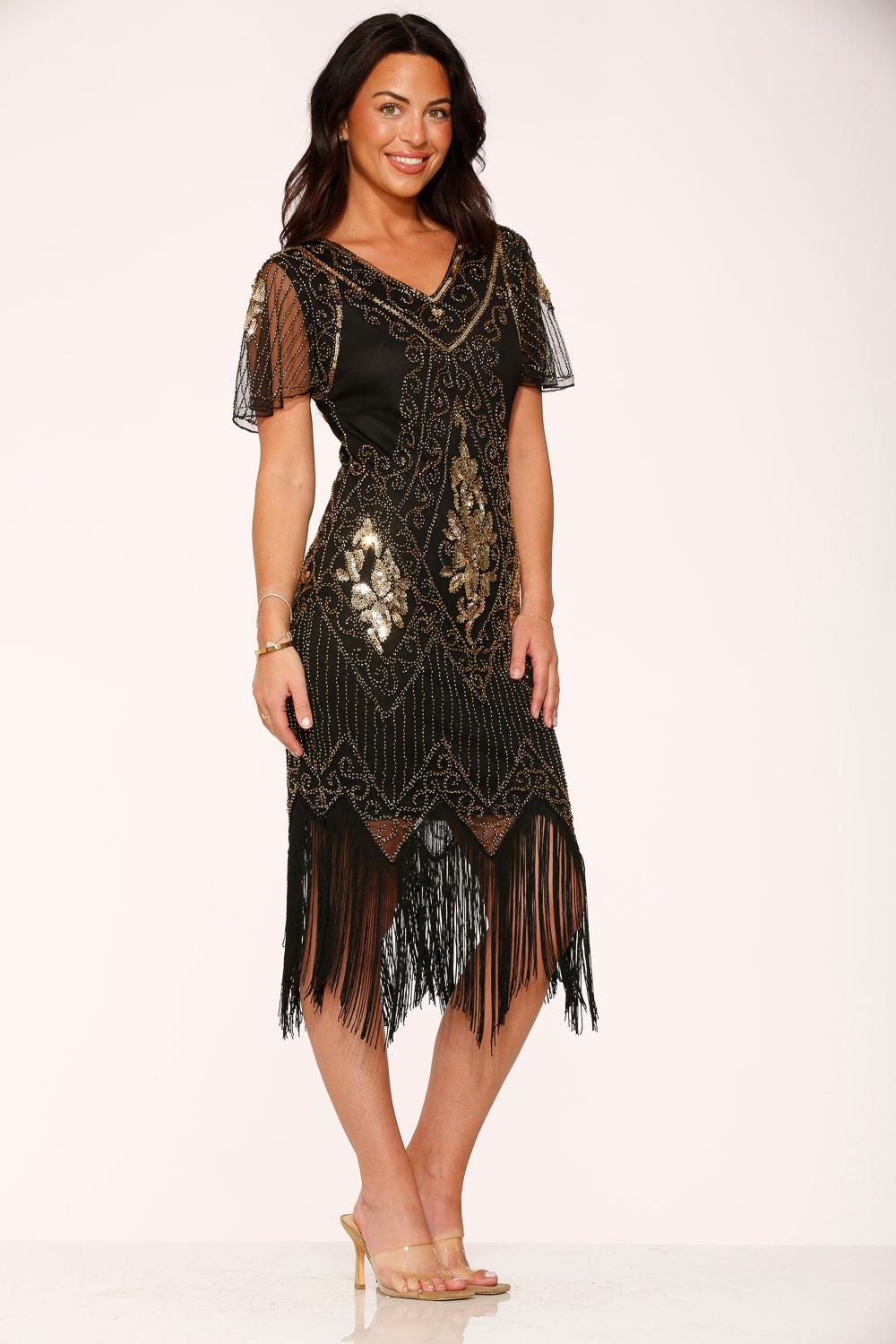 Step into vintage elegance with this stunning black and gold flapper dress from Orchid Bloom. Adorned with ornate beading and sequins in art deco patterns, this showpiece features a V-neckline, flutter sleeves, and dramatic fringe for head-turning movement. Perfect for Gatsby parties or any night worth celebrating.97% Polyester, 3% SpandexFabric provides comfortable stretchSide zipper closureApprox. length: 41"Imported