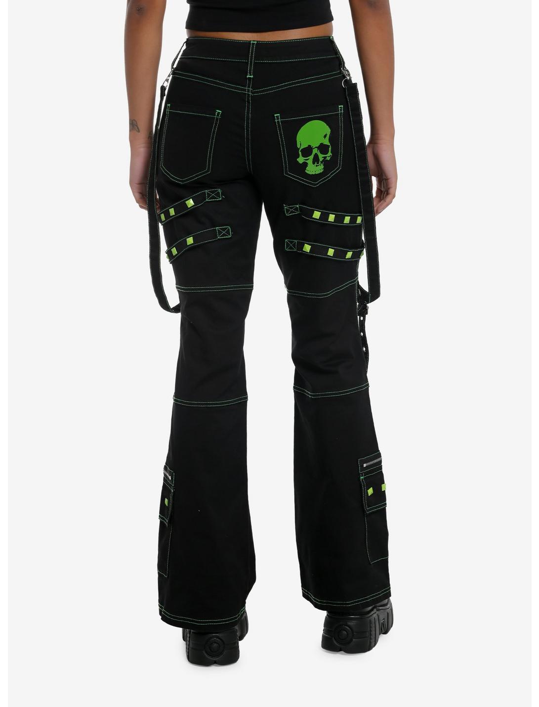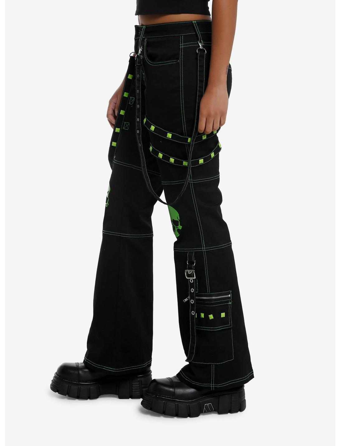 Grunge up your look with these killer pants! They have a low rise, flare fit and feature lime green skulls printed at the knees. Comes with removable suspenders and strap detailing on the thighs with green studs. Comes with front, back and cargo pockets.Please note: Style is fitted with no stretch; size up for a looser fit.98% cotton; 2% spandexWash cold; dry flatNon-stretch materialRise: 12''Inseam: 32''ImportedListed in junior sizesModel is 5'9''Model wears size 3