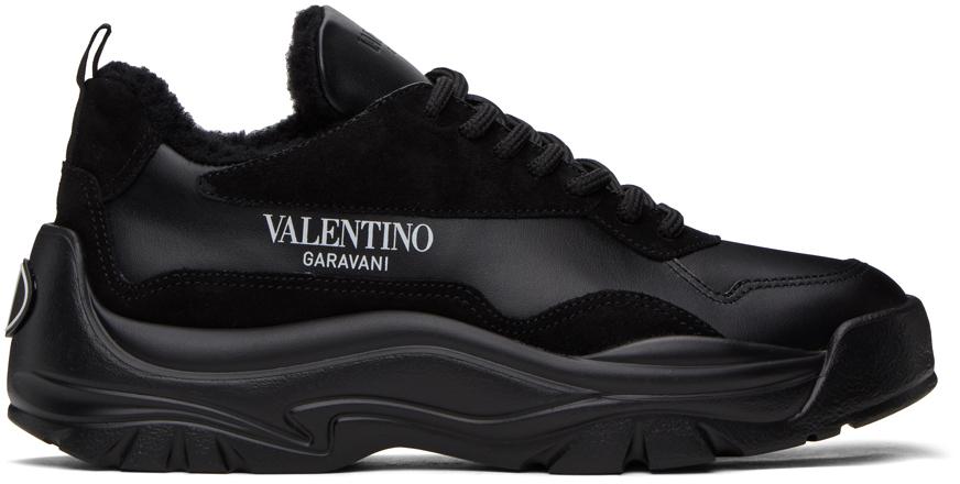 Low-top buffed calfskin and suede sneakers in black.