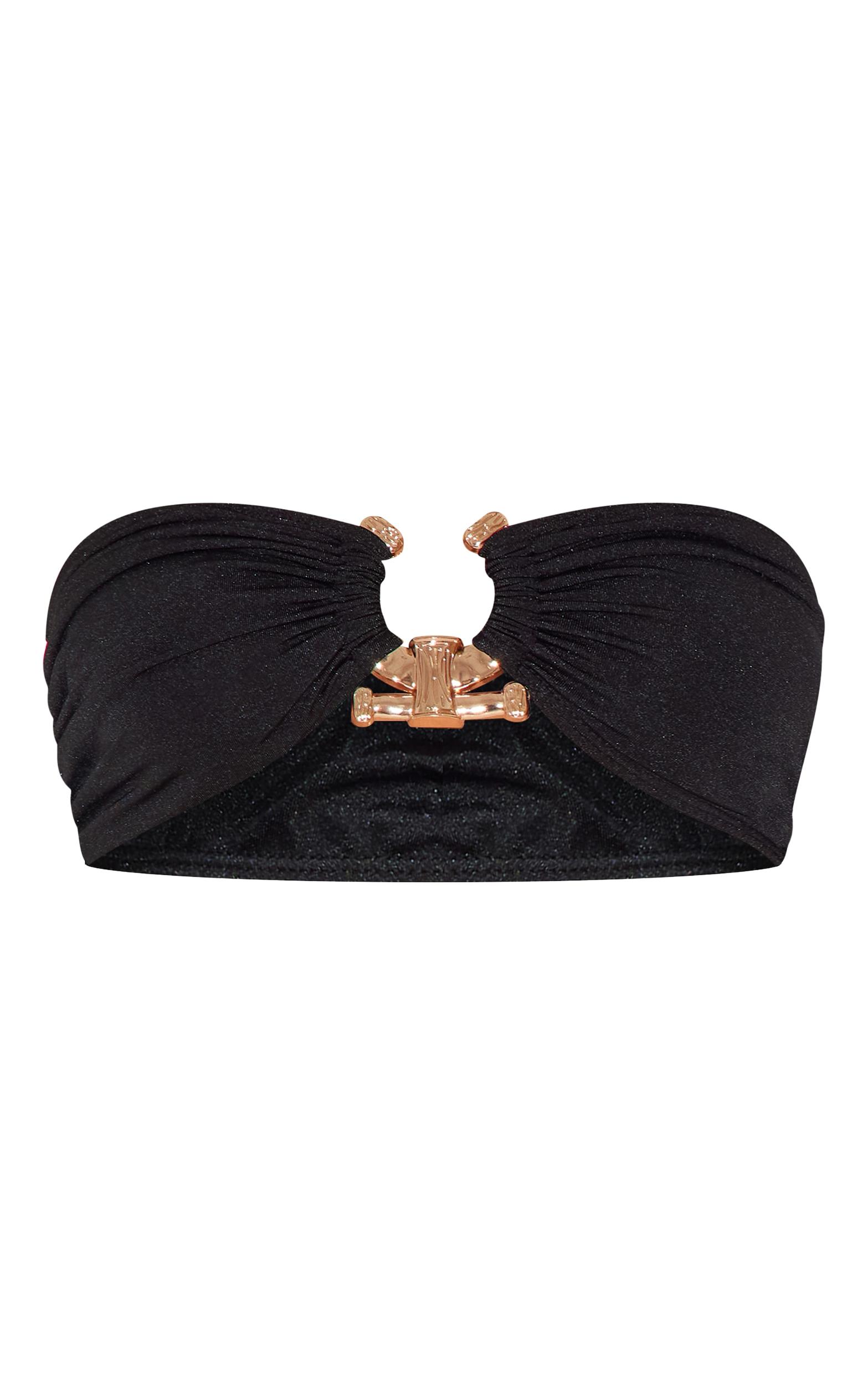 Refine your swimwear edit with this bandeau bikini top. Cut from a sculpting black fabric, the minimalist silhouette is punctuated by a considered hammered gold-tone trim. Style yours with high-waisted tailored pants for an elevated poolside aesthetic. Length approx 16.5cm/6.5inch (Based on a sample size UK 8)Model wears size UK 8/ EU 36/ AUS 8/ US 4Model Height - 5ft 9inchp]:!mb-4inch>Brand: PrettyLittleThingCategory: SwimwearProduct type: Bandeau Bikini TopColor: BlackMaterial: SwimDesign: PlainNeckline: Bandeau