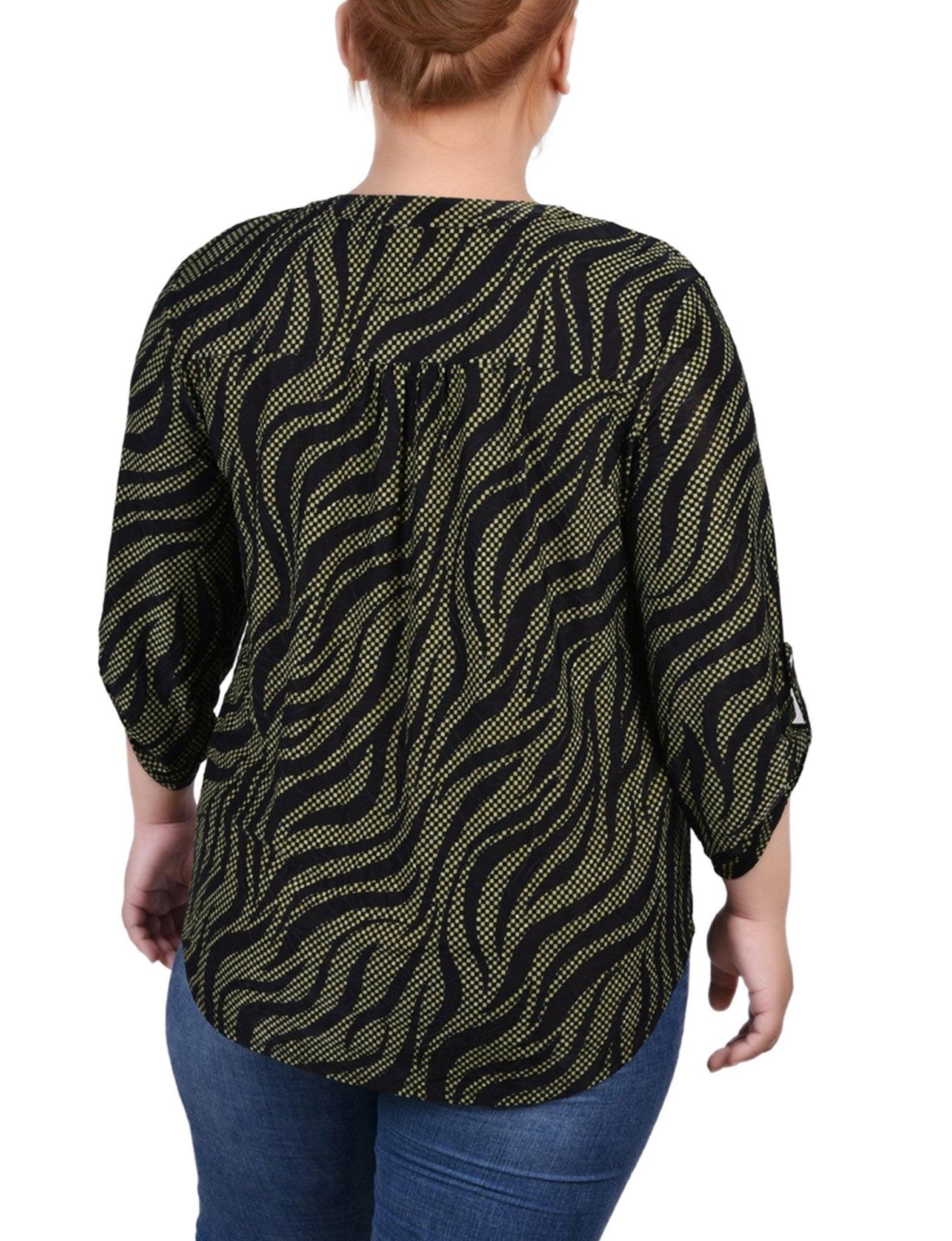 Khaki Animal 3/4 Sleeve Roll Tab Y Neck Top - Plus