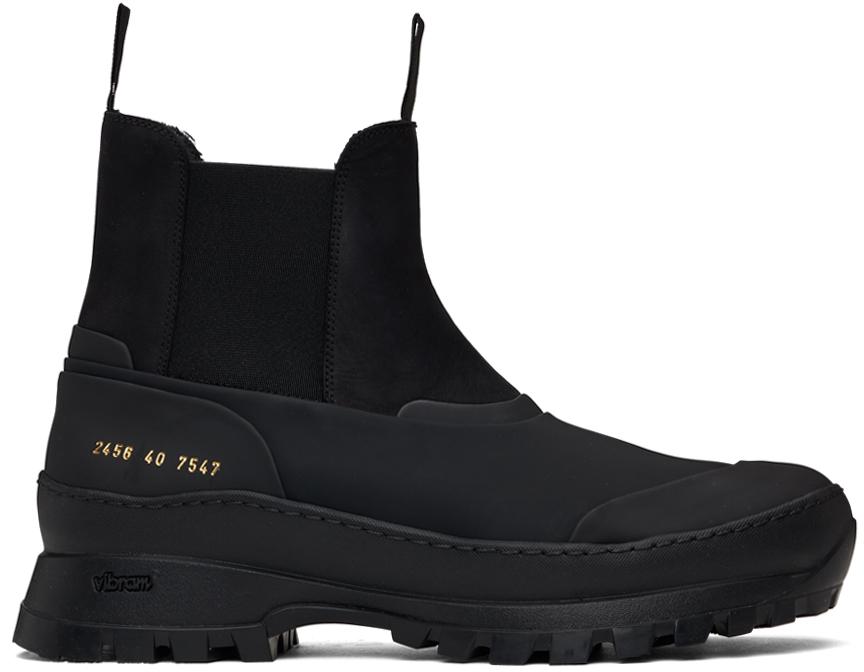 Ankle-high paneled suede and rubber Chelsea boots in black.