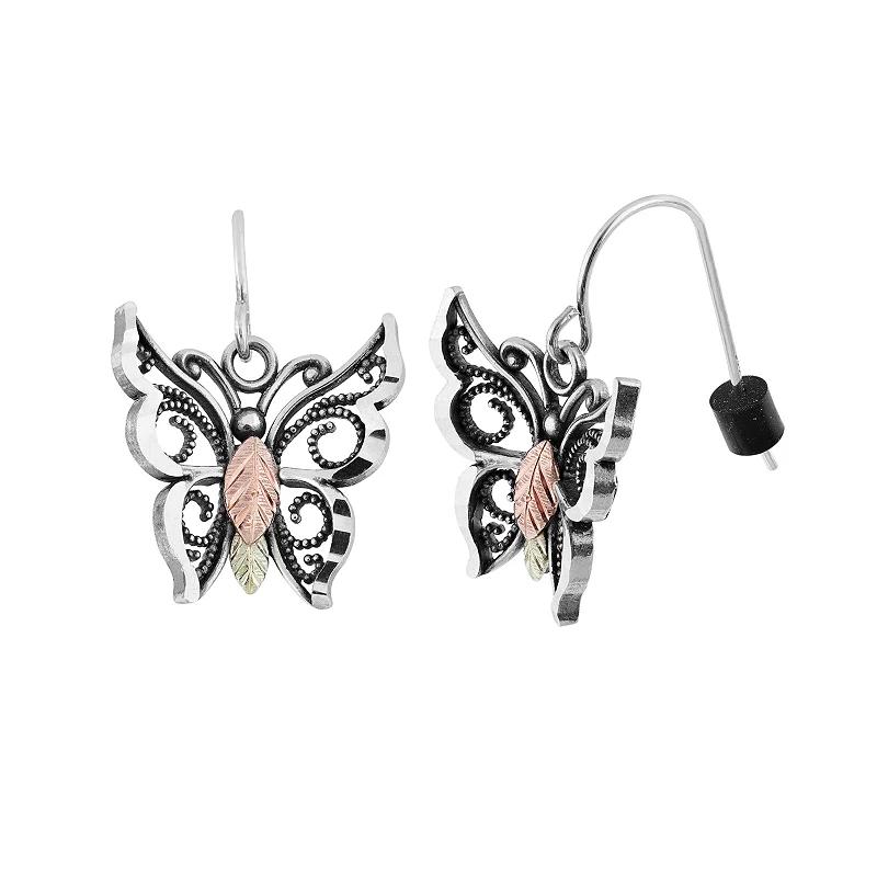 Perfect your look when you add these striking Black Hills Gold butterfly drop earrings to your favorite ensembles.EARRING DETAILS Length: 1.02 in. Backings: French wire Metal: sterling silver, 12k green gold, 12k rose gold Plating: rhodium Finish: satin Packaging: boxed Size: One Size. Color: Grey. Gender: female. Age Group: adult.