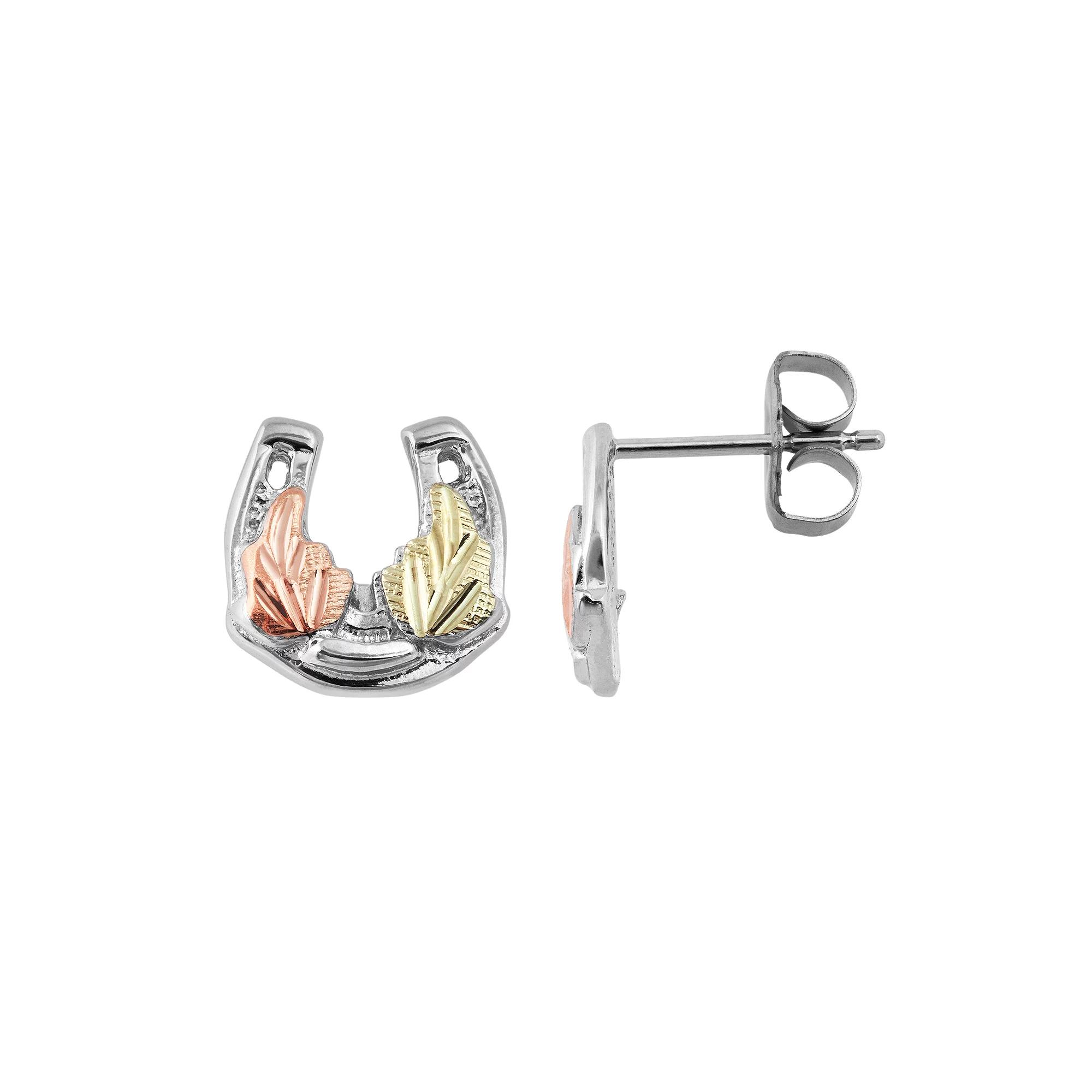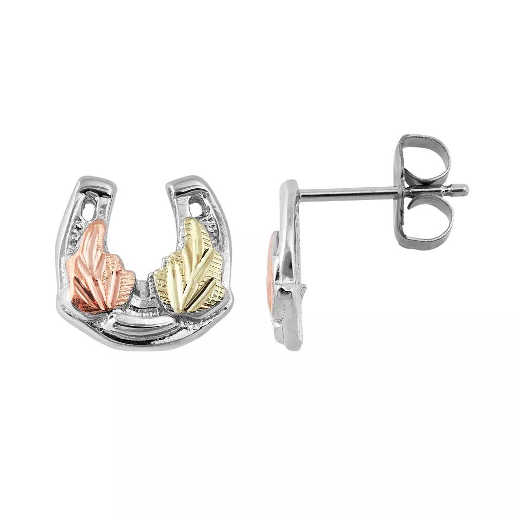 Symbolic of good fortune, these tri-tone leaf horseshoe stud earrings are a delightful addition to your look.EARRING DETAILS Length: .37 in. Backings: post Metal: sterling silver, 12k green gold, 12k rose gold Plating: rhodium Finish: polished, satin Packaging: boxed Size: One Size. Gender: female. Age Group: adult.