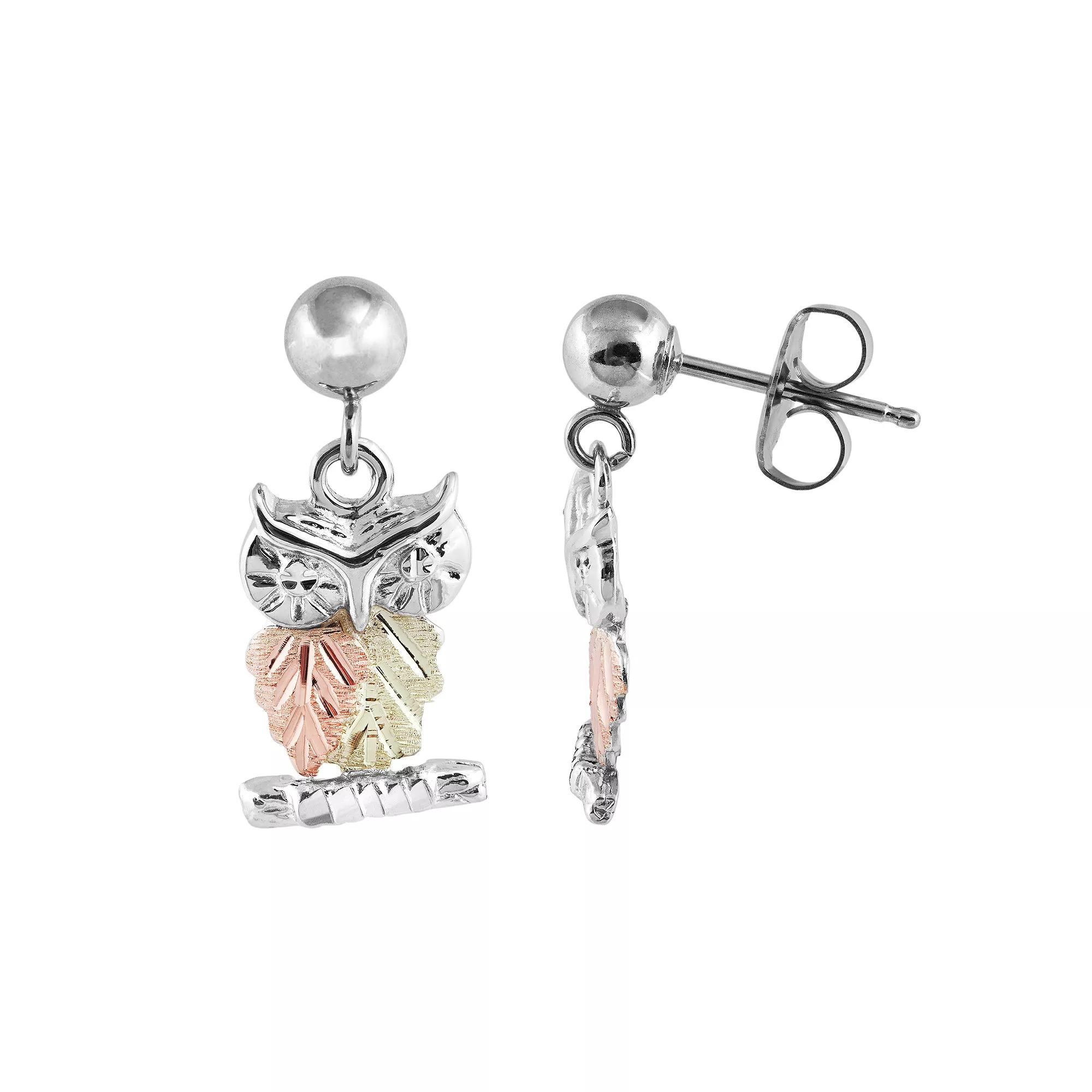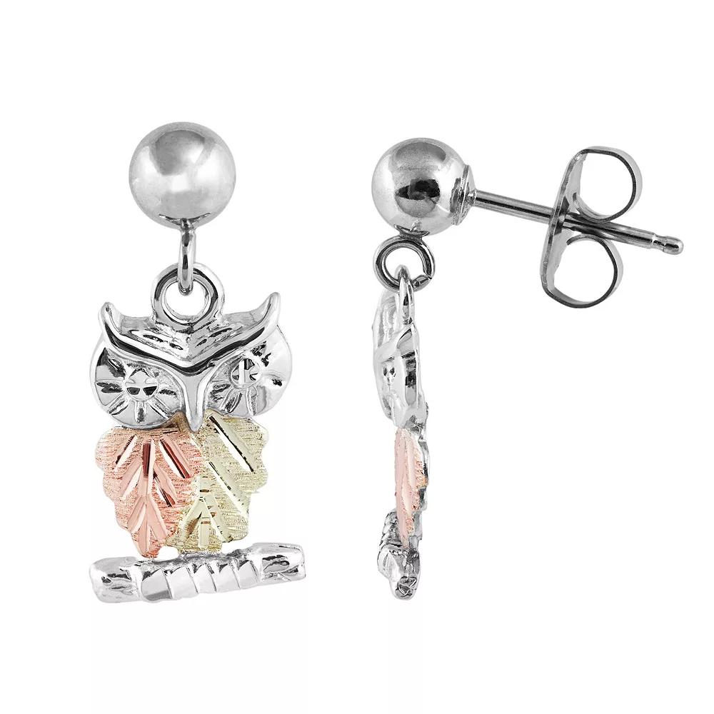 An owl motif adorned with leaf details makes these tri-tone drop earrings a charming choice.EARRING DETAILS Length: .5 in. Backings: post Metal: sterling silver, 12k green gold, 12k rose gold Plating: rhodium Finish: polished, satin Packaging: boxed Size: One Size. Gender: female. Age Group: adult.