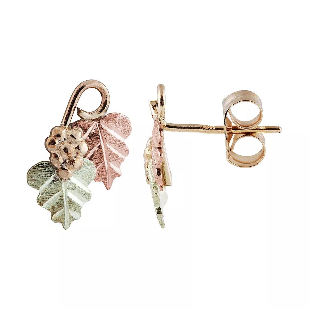 The Womens Black Hills Gold 10kt. yellow gold vine and grape cluster earrings arw accented with 12kt. pink & green leaves and 14kt. post and earbacks. These dainty traditional earrings measure approx. .45HX.30W and includes a complimentary gift box.