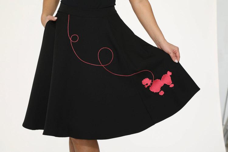 Classic cool meets bold charm in the Orchid Bloom Black & Hot Pink Embroidered Poodle Swing Skirt! With its vivid poodle patch and full swing silhouette, this retro gem brings serious sock hop energy. Crafted from a soft and stretchy blend, it’s perfect for twirling through diner dates, dance floors, or vintage fairs with flair.Details:95% Polyester, 5% SpandexImportedMachine wash cold, tumble dry low or hang to air-dry