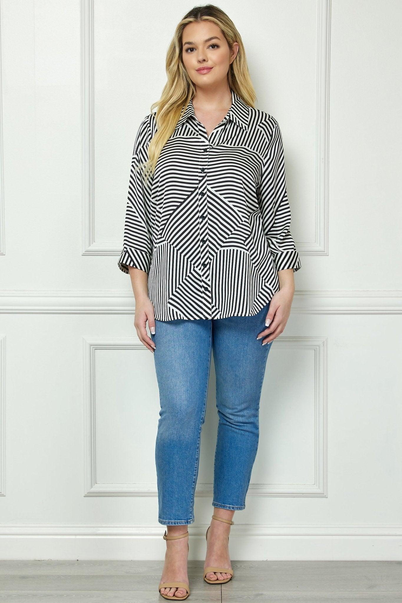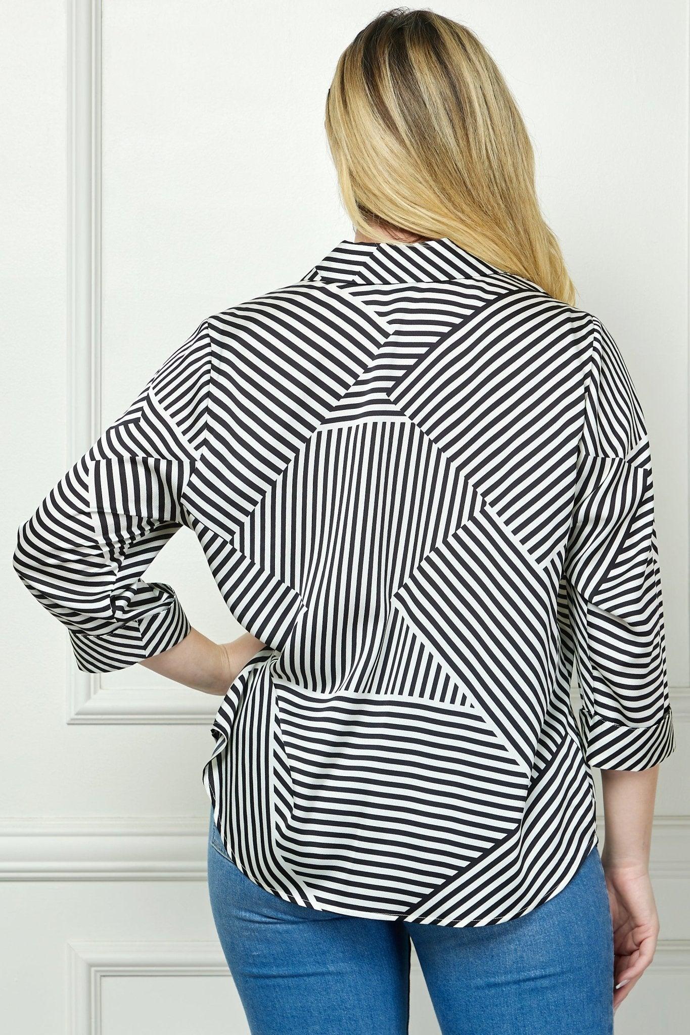A modern black-and-white striped blouse featuring an eye-catching geometric pattern, perfect for casual or office wear. Button-down front closure 3/4 sleeves with cuffed hems Relaxed fit for added comfort Bold geometric striped print Length 30"