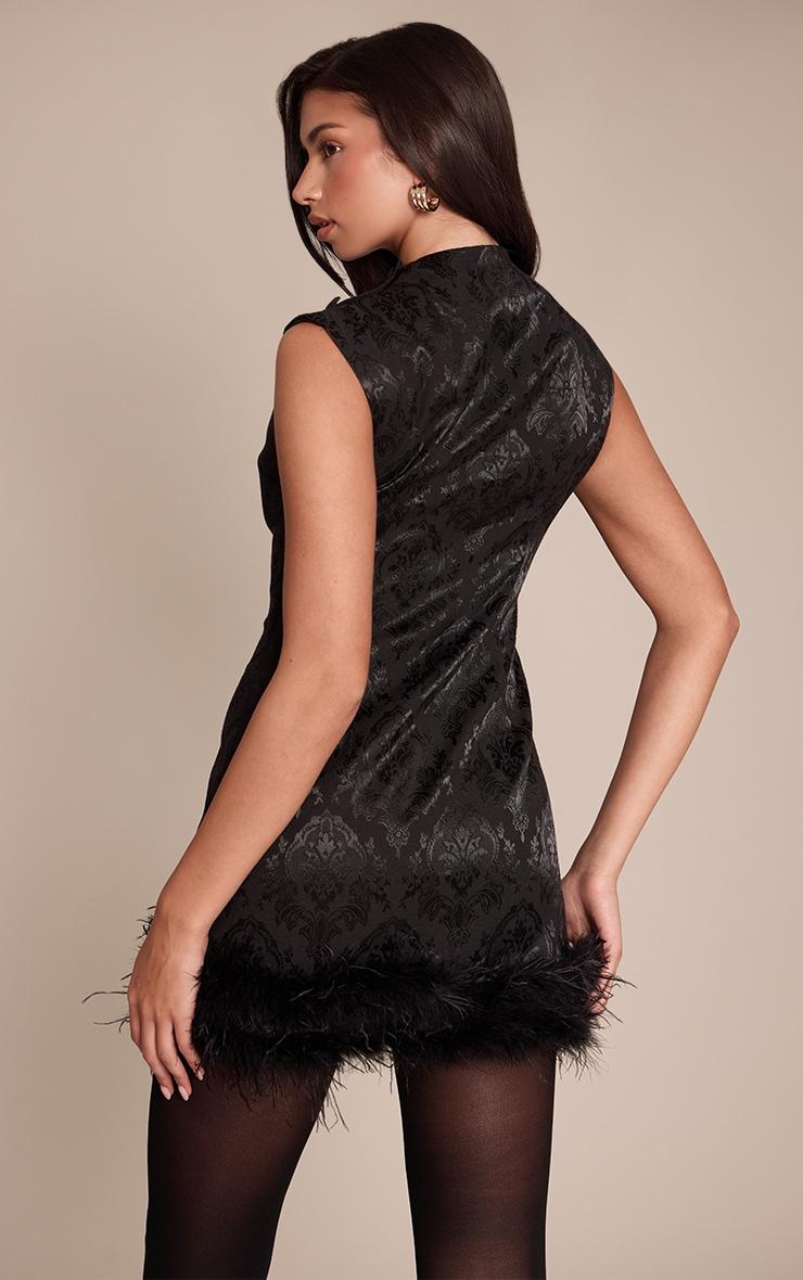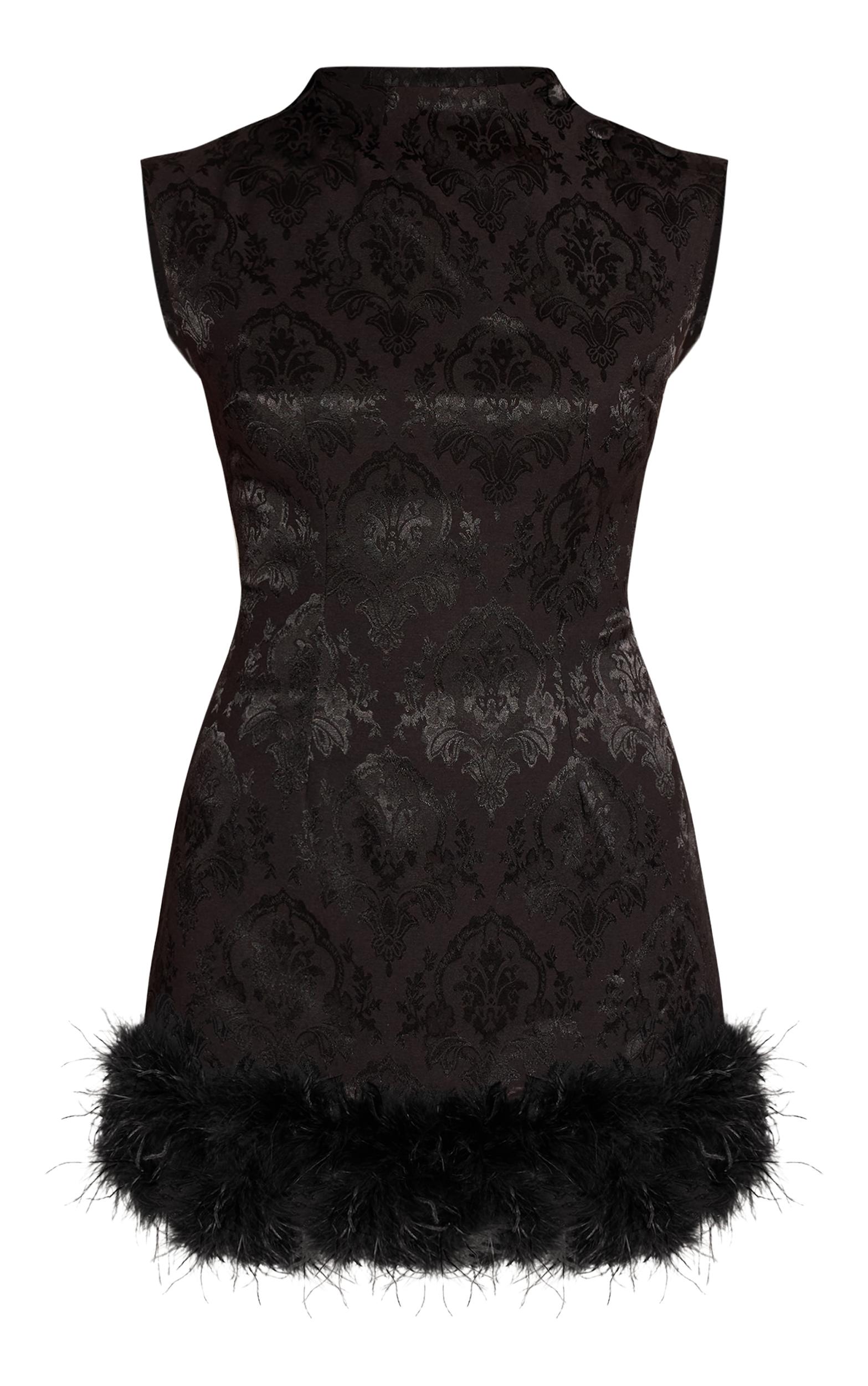 Make an entrance in this black jacquard high neck cap sleeve mini feather trim dress. The sophisticated jacquard pattern, sleek high neck, and cap sleeves define its modern bodycon fit, finished with a playful feather trim. Perfect for your most anticipated evening events or exclusive nights out. Complete your confident aesthetic with bold cowboy boots and a chic black clutch bag.Length approx 81.5cm/32inch (Based on sample size US 4)Model wears size UK 8/ EU 36/ AUS 8/ US 4Model Height - 5ft 8inchp]:!mb-4inch>Brand: PrettyLittleThingCategory: DressesProduct type: Bodycon DressColor: BlackMaterial: Woven CrepeOccasion: Evening