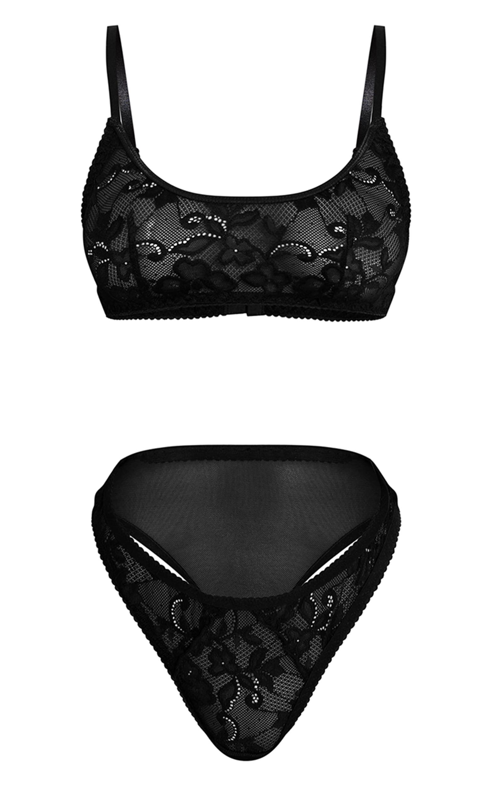 Indulge in elegance with the black lace detail scoop neck bra & panties set. Designed with intricate lace detailing and a scoop neckline, this matching set offers both comfort and allure. Pair with a silky nightdress for a touch of luxury. Top length approx 29cm/11.5inch Bottoms length approx 29cm/11.5inch (Based on sample size S)Model wears size SModel Height - 5ft 6inchp]:!mb-4inch>Brand: PrettyLittleThingCategory: Lingerie & NightwearProduct type: 2 PieceColor: BlackMaterial: MeshOccasion: Day