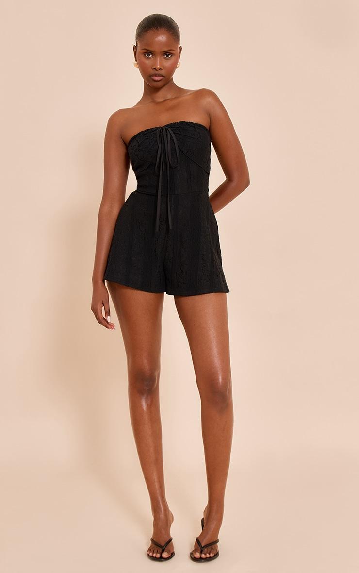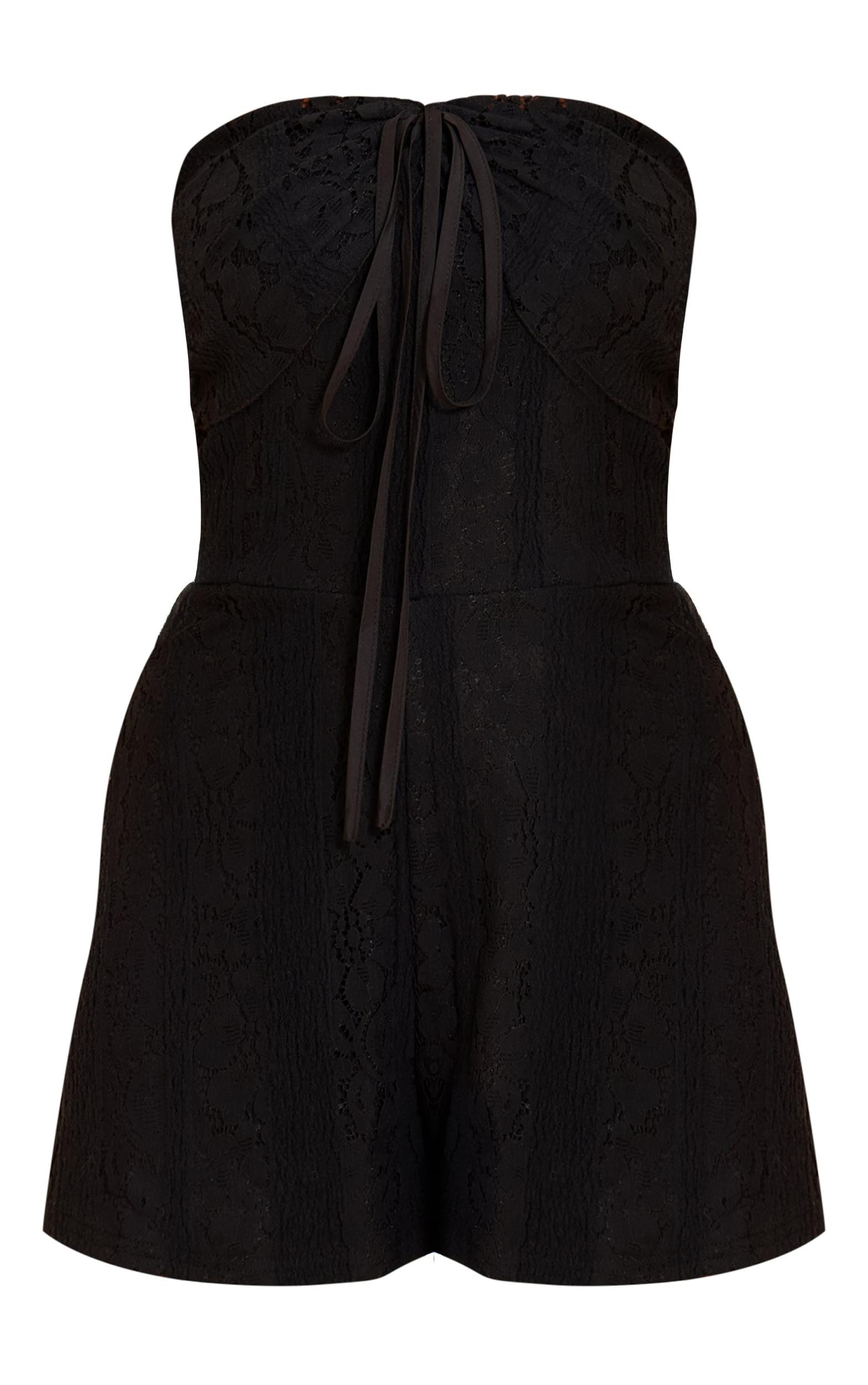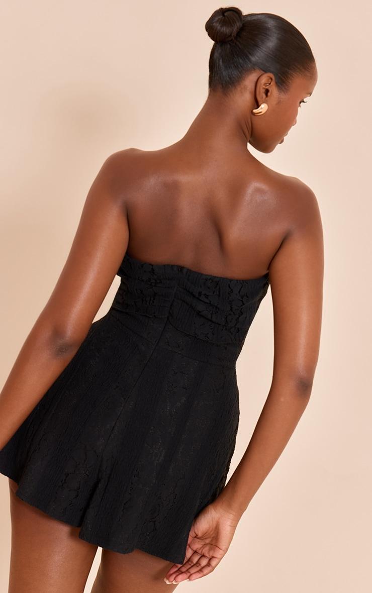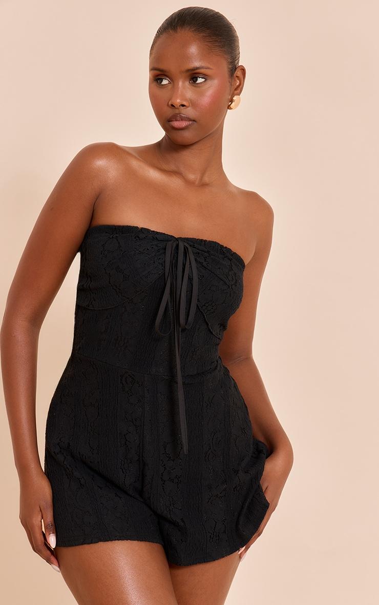 The black lace fold over romper blends playful charm with sultry detailing. Crafted with delicate lace, it features a fold-over neckline and a fitted waist, balanced by relaxed shorts. Chic and versatile, it’s an elevated take on evening rompers. Style with ankle-strap heels and a structured clutch for night outs, or add a blazer and boots for a sleek transitional look.Length approx 58.5cm/23inch (Based on sample size US 4)Model wears size UK 8/ EU 36/ AUS 8/ US 4Model Height - 5ft 9inchp]:!mb-4inch>Brand: PrettyLittleThingCategory: DressesProduct type: Floaty PlaysuitColor: BlackMaterial: Stretch LaceOccasion: Evening