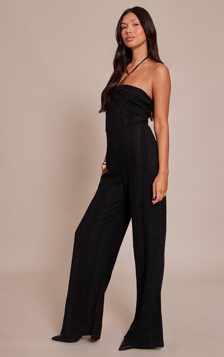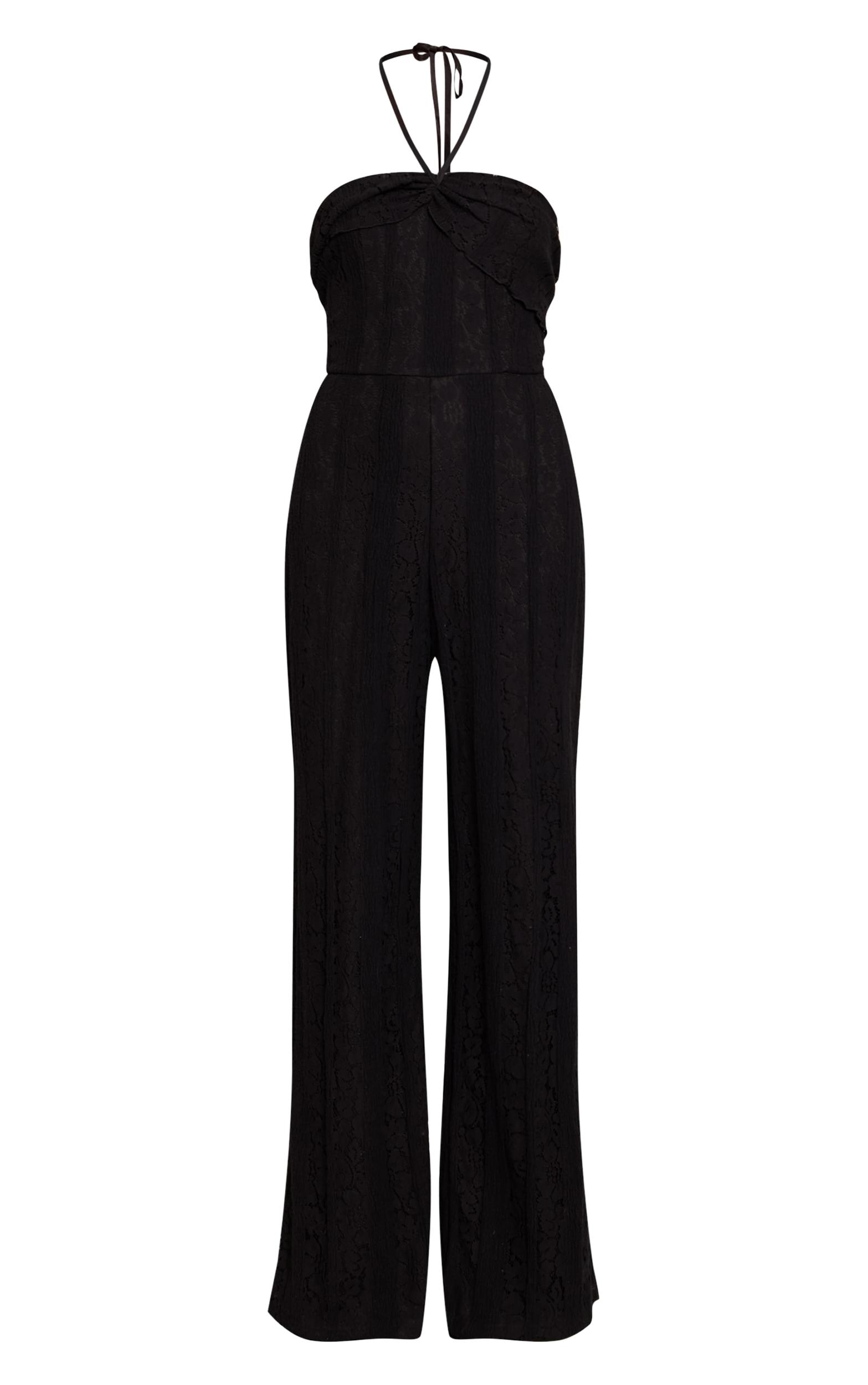Make your evening statement without uttering a word. This black lace fold over straight leg jumpsuit is defined by its elegant halter-neck design over a bandeau bust, featuring intricate lace detailing throughout its flowing, contemporary straight-leg silhouette, perfect for any occasion that calls for elevated style. Pair it with sleek ankle boots for an unexpected edge, adding a structured clutch bag to complete an assertive, self-aware look.Length approx 155cm/61inch (Based on sample size US 4)Model wears size UK 8/ EU 36/ AUS 8/ US 4Model Height - 5ft 9inchp]:!mb-4inch>Brand: PrettyLittleThingCategory: DressesProduct type: Skinny JumpsuitColor: BlackMaterial: Stretch LaceOccasion: Evening