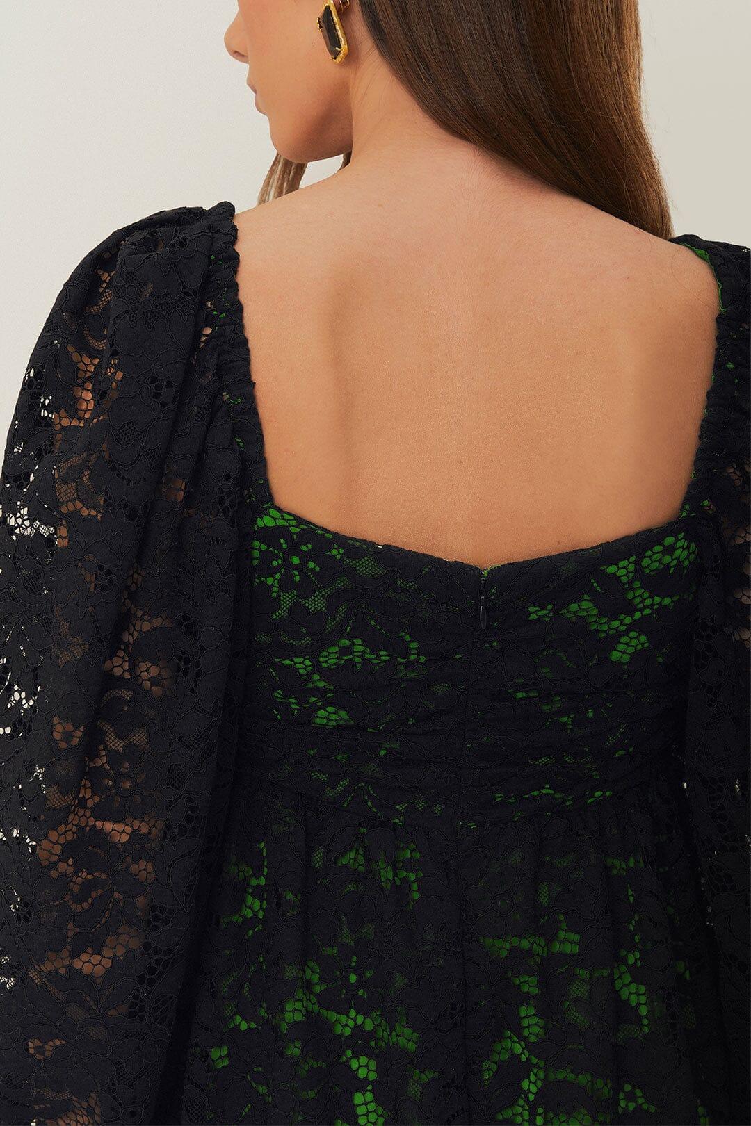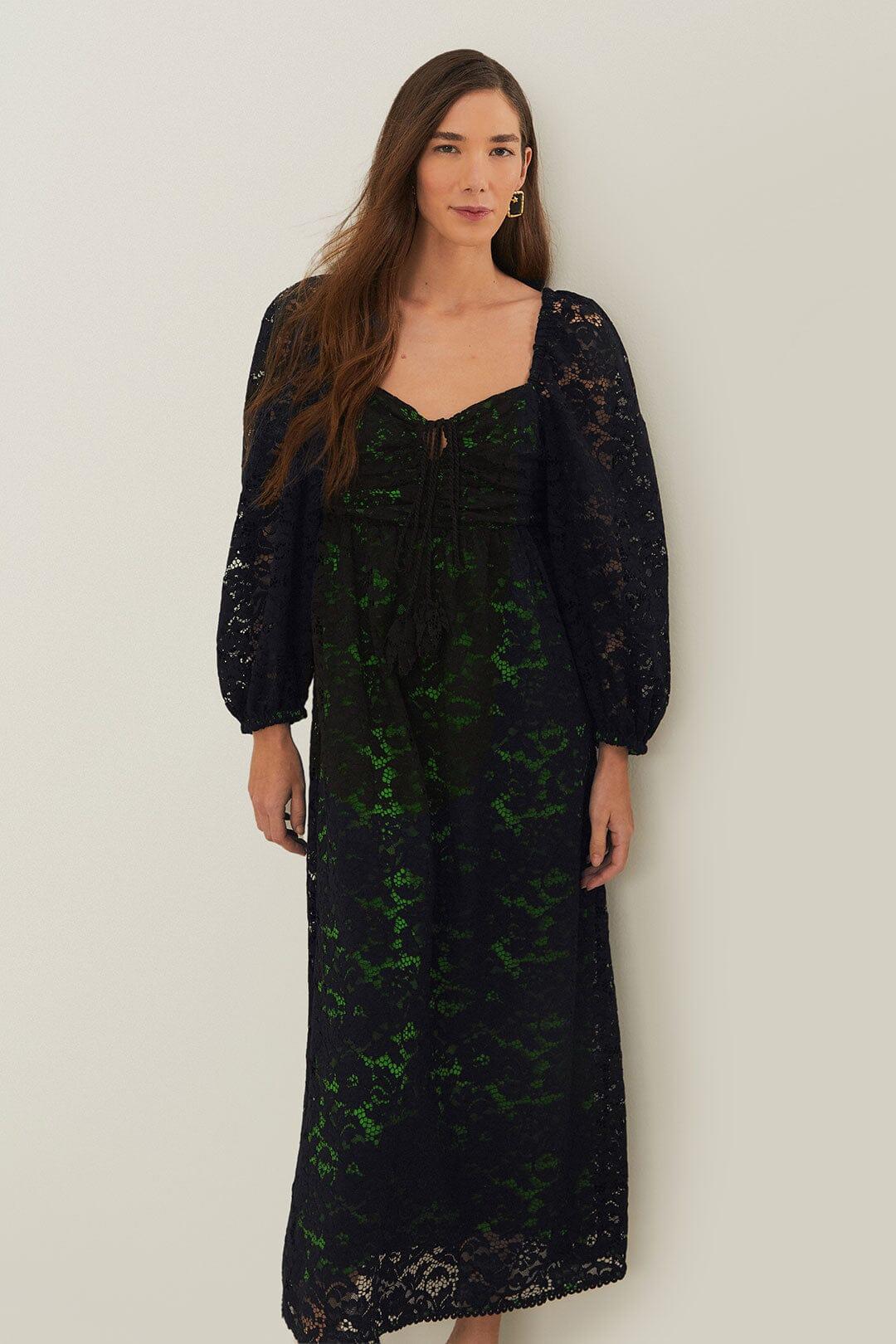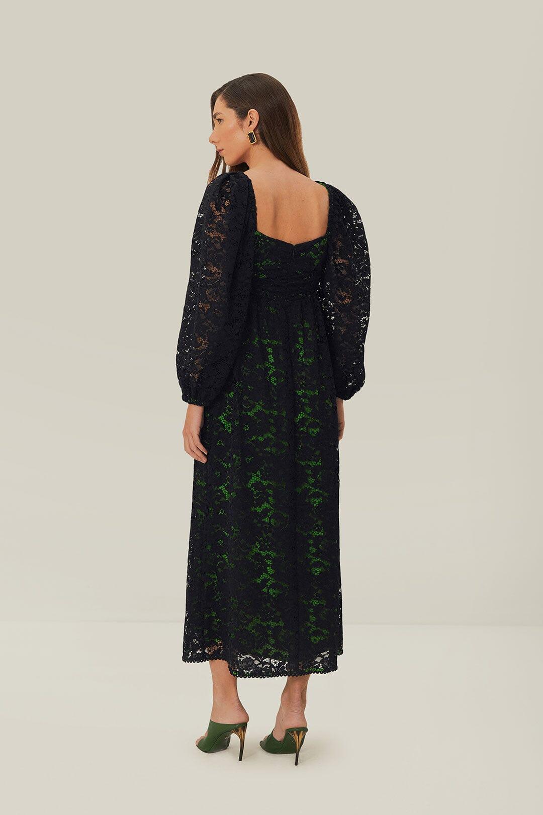 Embrace elegance with the Black Lace Long Sleeve Midi Dress by FARM Rio. This enchanting piece features a charming square neckline and intricate lace detailing that overlays a playful green leafy pattern. The soft silhouette is cinched delicately at the waist, flowing gracefully to midi length. Long, sheer sleeves add a touch of sophistication, making it the perfect ensemble for a warm, magical evening.Composition 41% NYLON 40,2% COTTON 18,8% RAYONCare Instructions MACHINE WASH, GENTLE CYCLE, DO NOT BLEACH, DO NOT TUMBLE DRY, LINE DRYING, IRON AT LOW HEAT, DRY CLEAN WITH ANY SOLVENT EXCEPT TRICHLOROETHYLENESize and Fit Inches XXS XS S M L XL Bust 27 2/4 29 2/4 31 2/4 33 2/4 36 2/4 39 3/4 Waist 24 3/4 26 3/4 28 3/4 30 3/4 33 3/4 37 Length 42 3/4 43 2/4 44 44 3/4 45 2/4 46 Hip N/A N/A N/A N/A N/A N/A