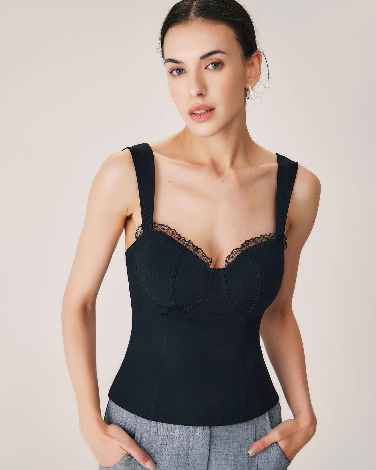 Fabric:This Sweetheart Neck Camis is made of Polyester. Polyester is an artificial fiber that feels soft, looks lustrous, and dries fast. It's also durable, with good resistance to wrinkles, stains, and sunlight. Description:Featuring a flattering sweetheart neckline, it enhances your silhouette with a touch of romance. Delicate lace splicing adds texture and sophistication, making it perfect for both casual and dressy occasions. Crafted from a soft, stretchy fabric, this camisole offers a comfortable, figure-hugging fit. Details:- Occasion: Daily- Top Length: Hip- Fabric Stretch: No Stretch- Embellishment: Zipper, Lace, Splicing- Neckline: Sweetheart Neck- Fit: Slim- Fabric: Polyester