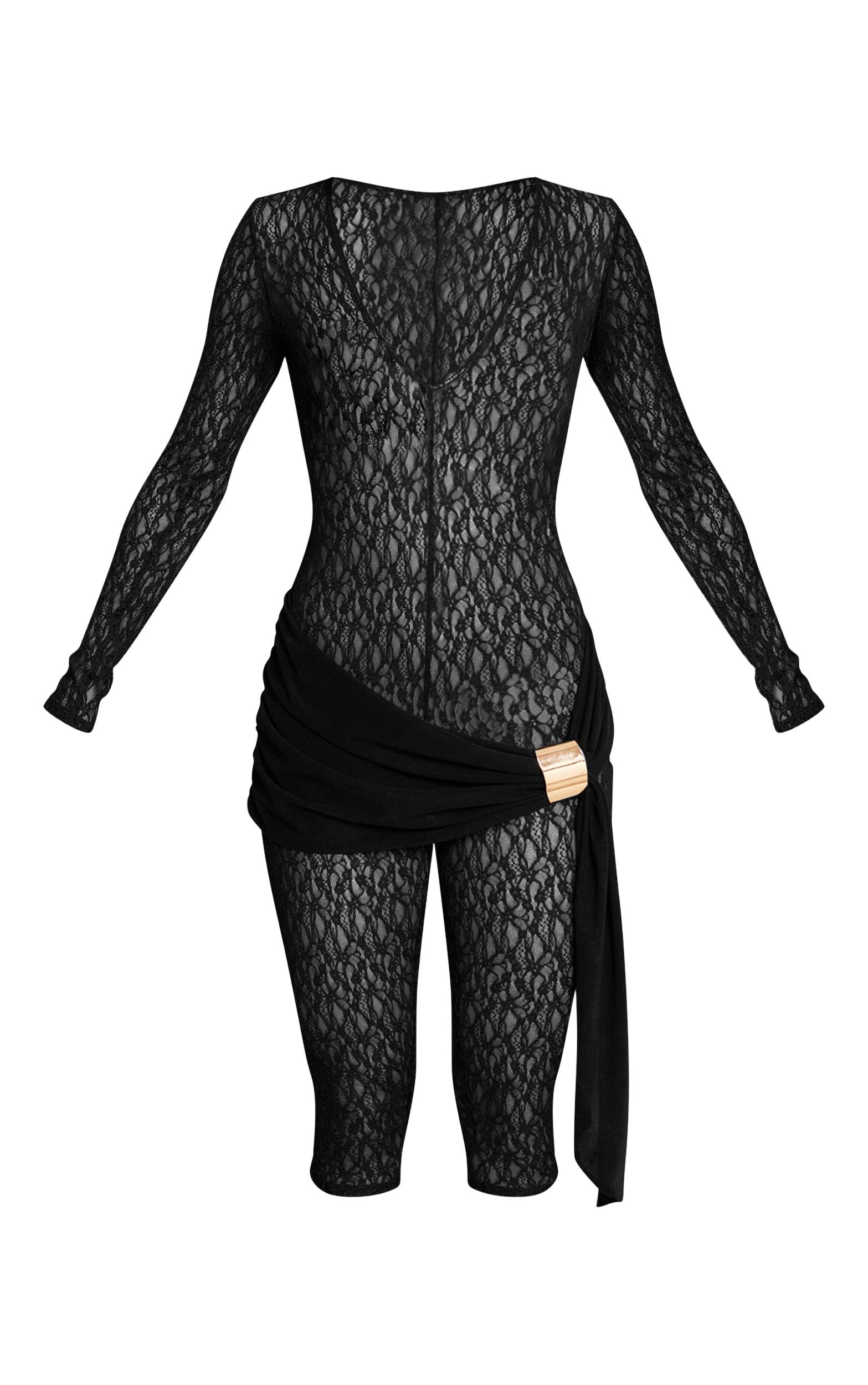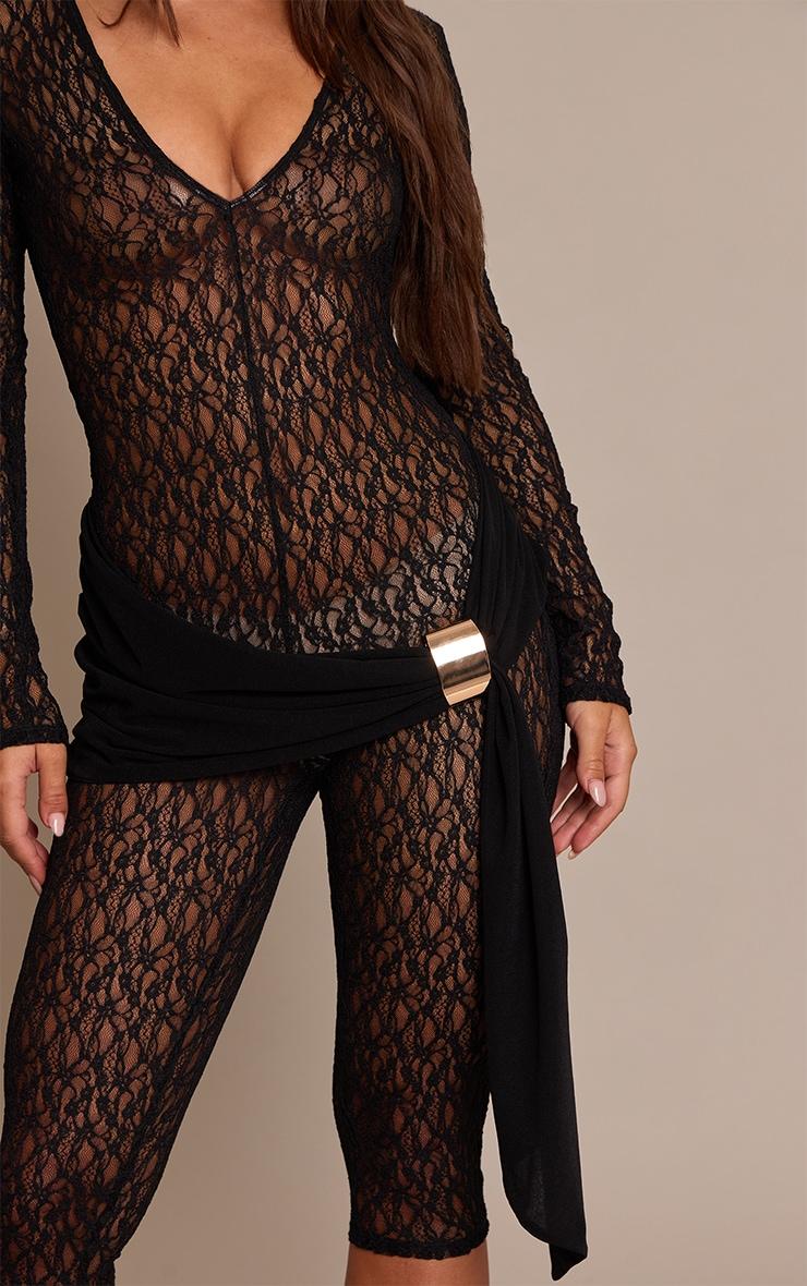 An artful take on after-dark dressing unfolds with intricate detail. The black lace wrap detail capri jumpsuit presents a confident, all-over lace design, featuring a plunging V-neckline and elegant long sleeves, flowing into a modern capri length. A distinctive wrap detail, cinched by a polished gold-tone buckle, artfully sculpts the waist, creating a refined outline perfect for evening. Anchor this bold aesthetic with sleek black high heels and minimalist gold jewelry to complement the buckle. It's the ultimate piece for a confident look that defines modern allure.Length approx 134.5cm/53inch (Based on sample size US 4)Model wears size UK 8/ EU 36/ AUS 8/ US 4Model Height - 5ft 8inchp]:!mb-4inch>Brand: PrettyLittleThingCategory: DressesProduct type: Skinny JumpsuitColor: BlackMaterial: Stretch LaceSleeves: LongOccasion: Evening