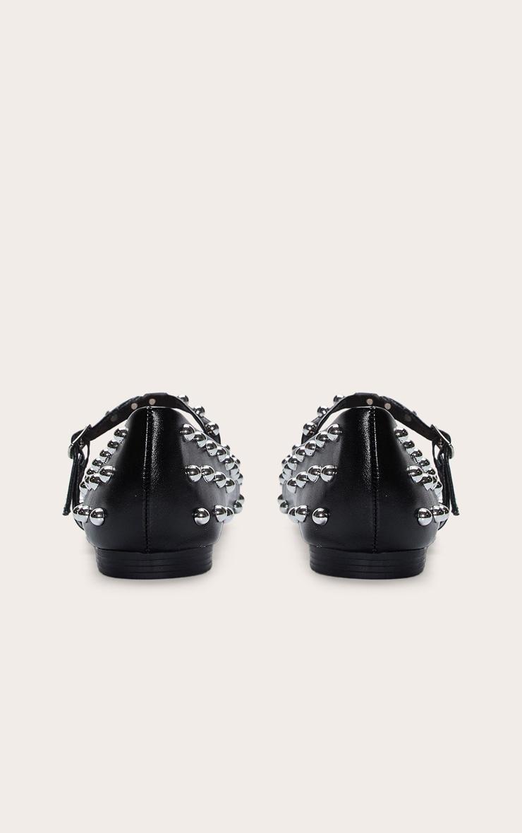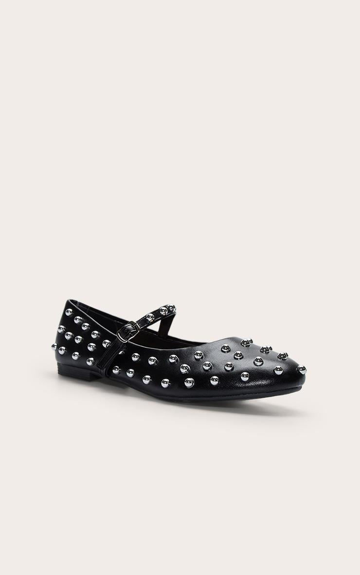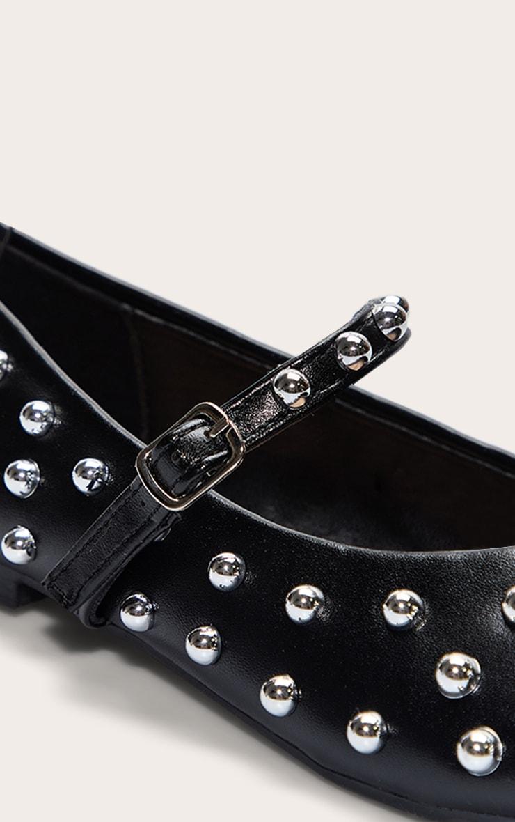 Step up your footwear game with the black leather ballet pump with stud detail. These sleek ballet pumps are crafted from faux leather and feature metallic stud accents for an edgy twist on a classic. Wear them with tailored pants or a midi skirt for a look that’s both sharp and feminine.p]:!mb-4inch>Brand: PrettyLittleThingCategory: FootwearProduct type: Flat ShoesColor: BlackOccasion: Day