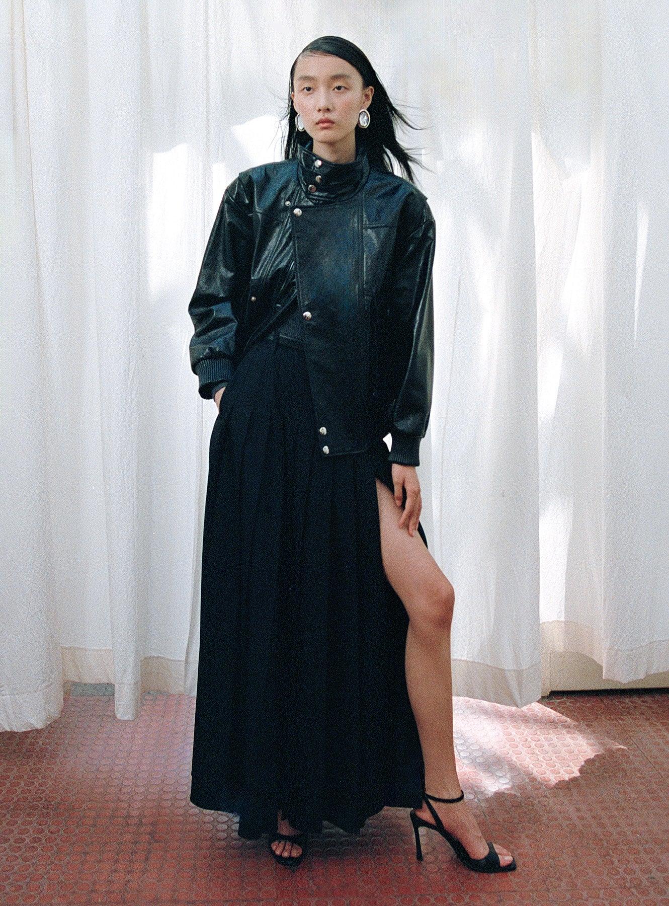 From day to night, this black leather jacket injects cool girl attitude into every look. Cut with a relaxed fit, a buckle fastening on its high neck and gunmetal buttons add street-ready hardware. True to sizeRelaxed fitPopper closure with concealed zip at frontLarge functional pocketsRib detail at hem and sleevesModel is 5ft10/178cm and wears a size UK 6