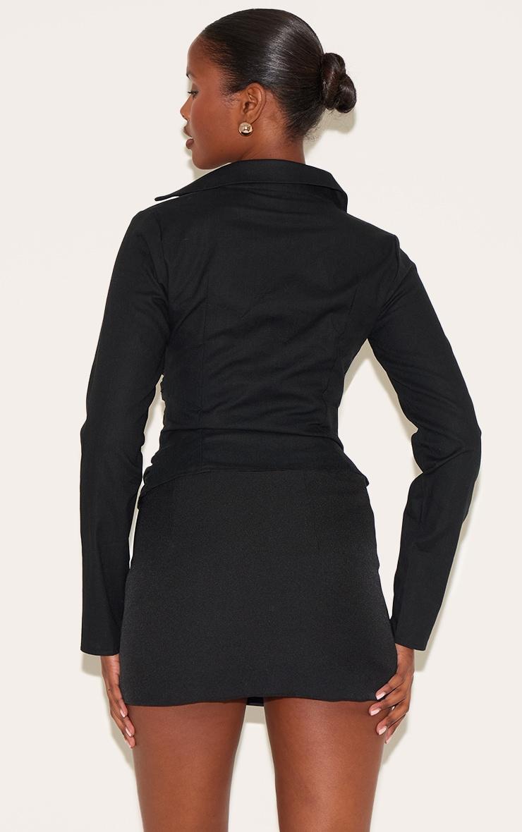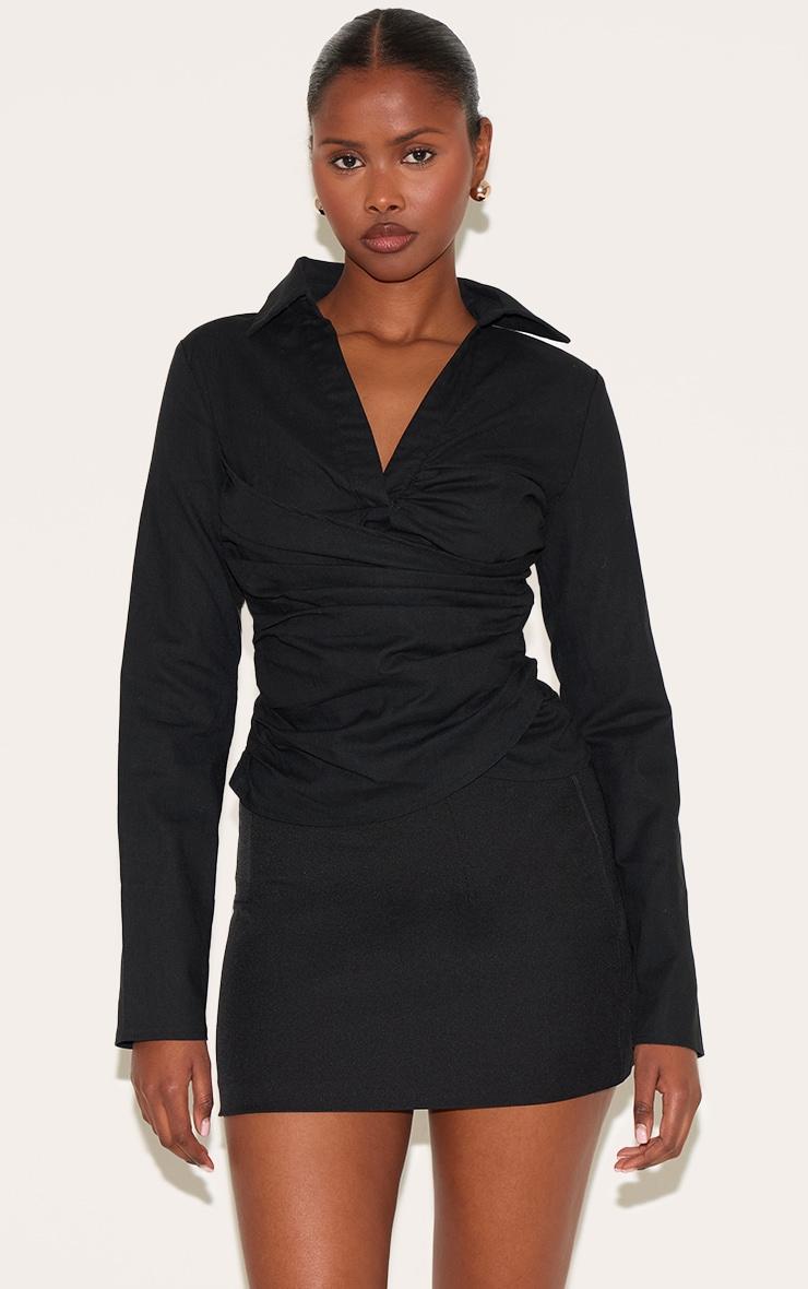 Brought to you in black linen blend material with a structured collar, chic v neck and wrap detailing. Pair this black linen blend fitted wrap detail shirt with a chic mini skirt, classic gold earrings and simplistic black stiletto heels.Length approx 48.5cm/19inch (Based on sample size US 4)Model wears size UK 8/ EU 36/ AUS 8/ US 4Model Height - 5ft 9inchp]:!mb-4inch>Brand: PrettyLittleThingCategory: TopsProduct type: ShirtColor: BlackMaterial: Faux LinenDesign: PlainNeckline: ShirtSleeves: LongOccasion: Day