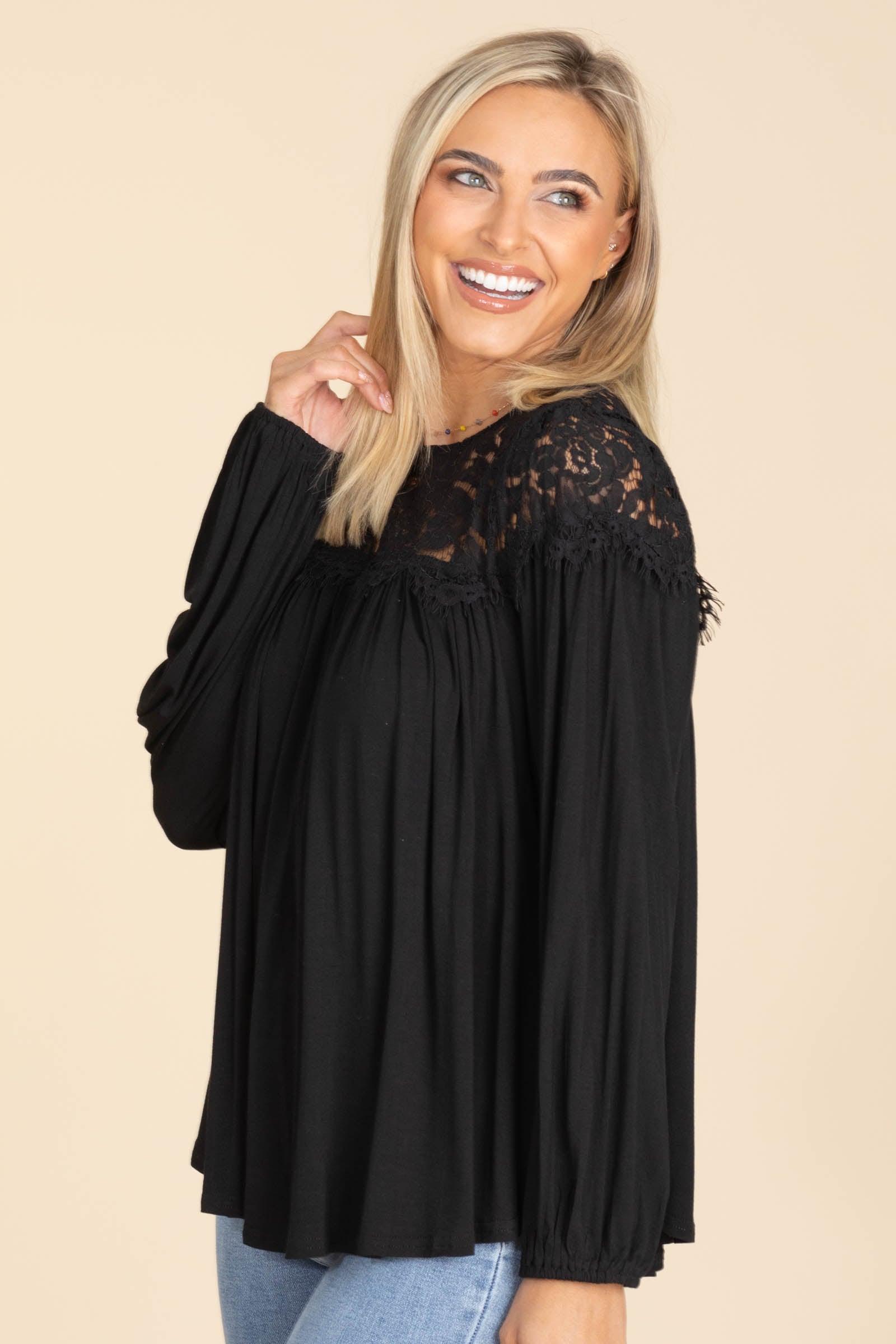 Product Details Colors: Black Print: Solid With Lace Neckline: Round Sleeve: Long Sleeve Hemline: Round Brand: Allie Rose Material and Care Self: 95% Rayon 5% Spandex Contrast: 100% Polyester Hand Wash Cold Hang/ Line Dry Size and Fit Small: Bust 36" Waist 40" Length 26.5" Medium: Bust 38" Waist 42" Length 27" Large: Bust 40" Waist 44" Length 27.5" Sarah is 5’8” and wearing her true size small