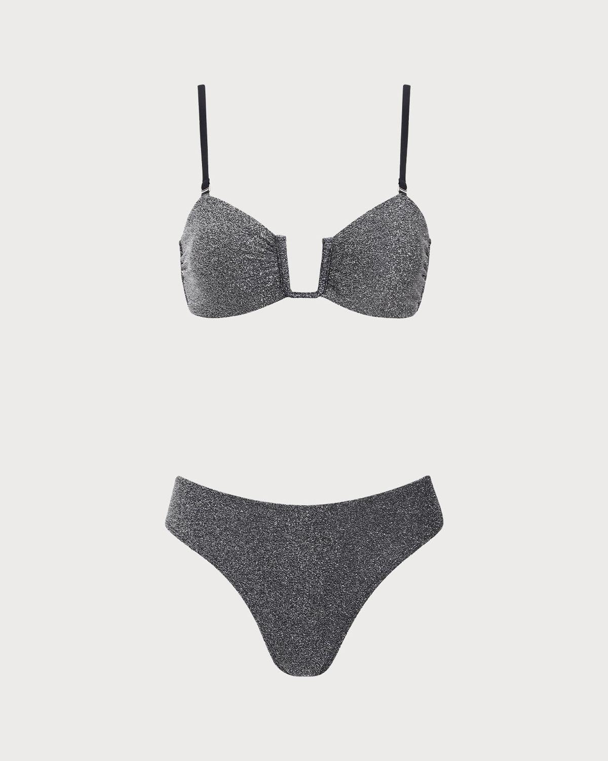 Back Neckline: Strap Fabric Stretch: High Stretch Waist: Low Waisted Closure Type: Elastic Waist Pattern Type: Solid Embellishment: Knot, Tie, Textured, Sparkly, Lurex, V-notch Neckline: Square Neck Fabric: Polyester 57.0%,Metallic 34.0%,Spandex 9.0% Lining: Polyester 90.0%, Spandex 10.0% Leg Opening: Mid-Cut Leg Padding: Removable Soft Cups Bottom Coverage: Moderate Bottom Coverage Bra Coverage: Demi
