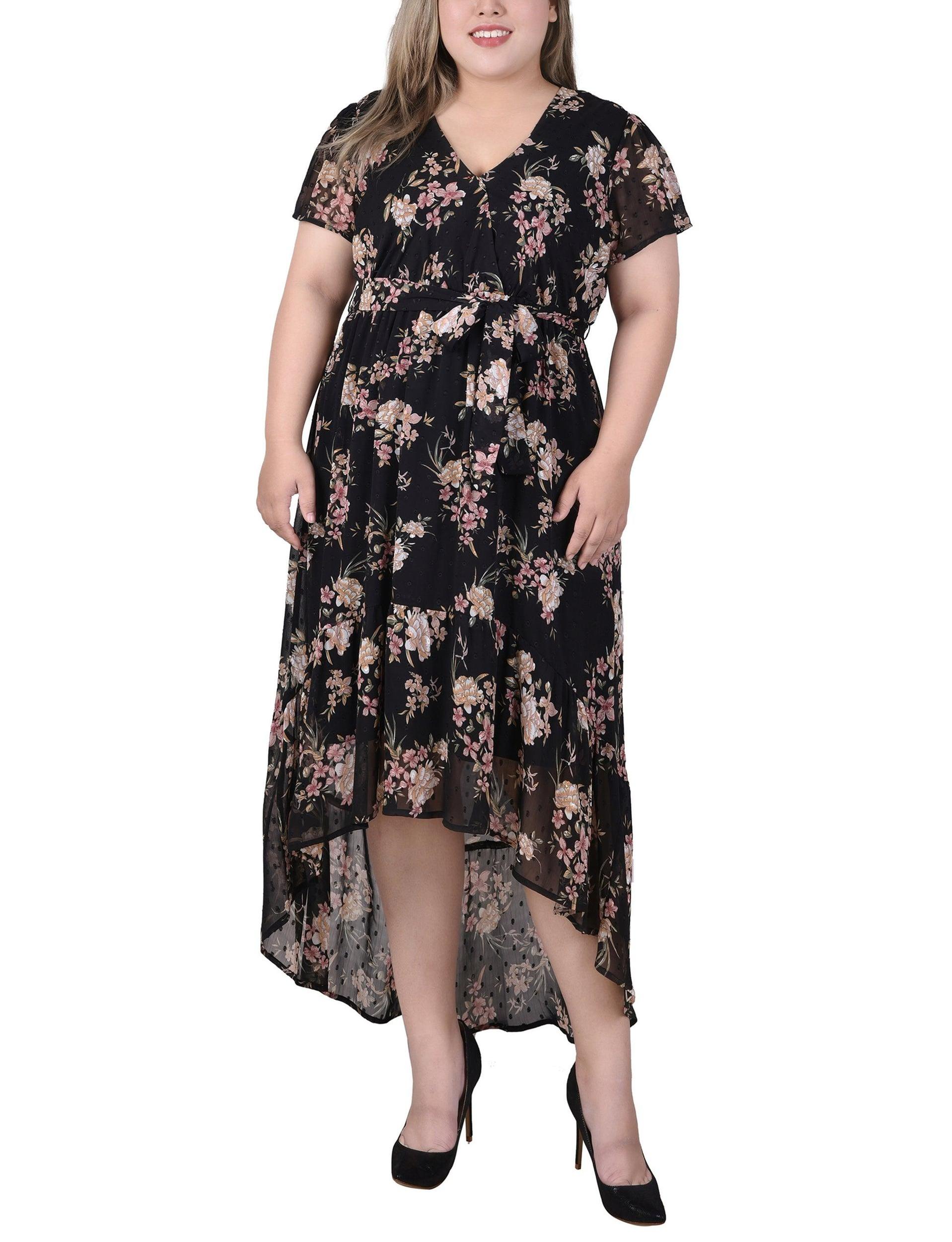 Black Mauve Floral Short Sleeve Hankerchief Hem Chiffon Dress - Plus