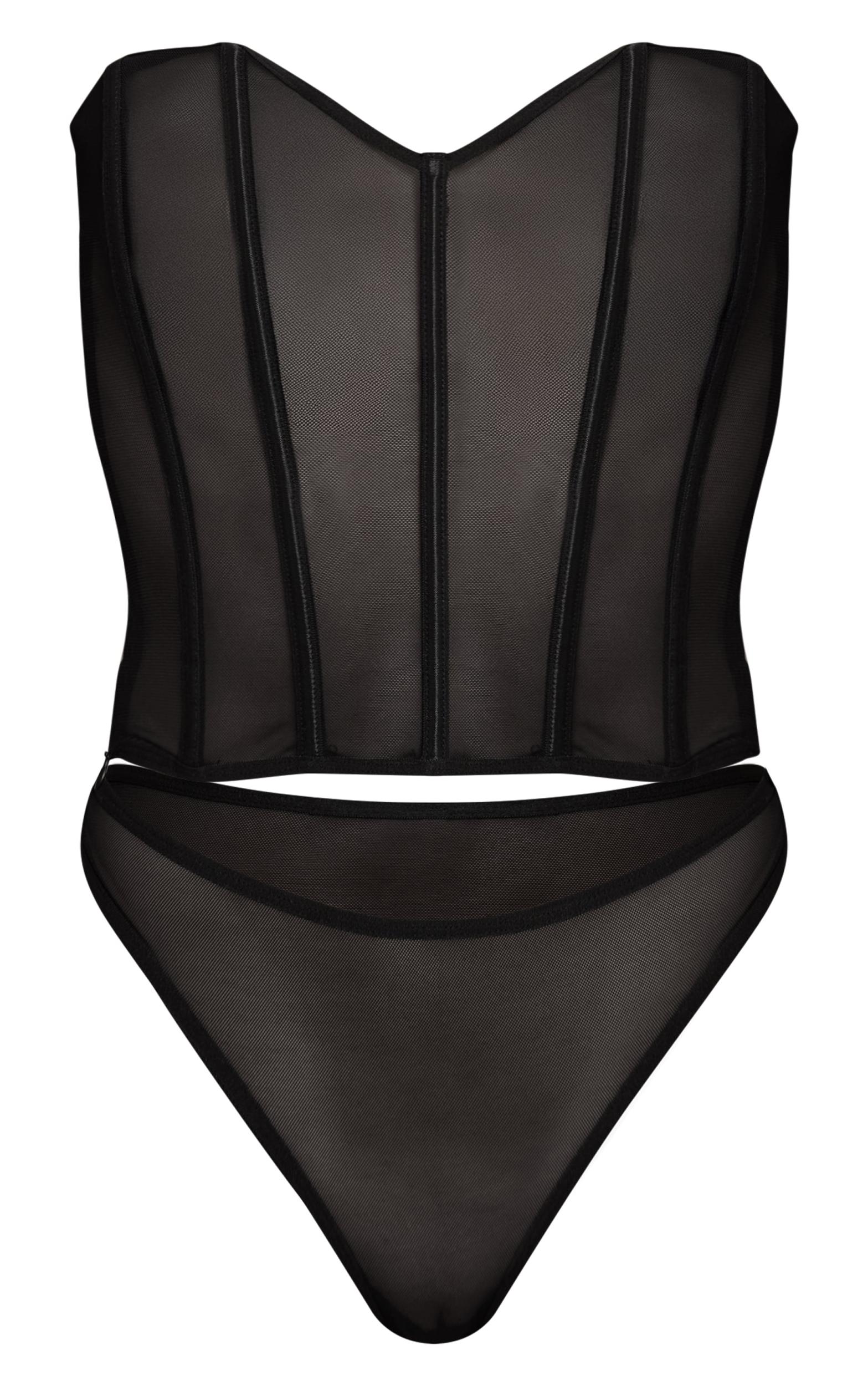 Unveil your confidence with the black mesh corset and panties set. Crafted from sheer black mesh, this set features a structured corset with boning detail and a sweetheart neckline, paired with flattering high-leg panties. This lingerie set is perfect for building an artful foundation for your confident day looks. It's a bold foundation for any look, asserting quiet confidence. Top length approx 38cm/13.5inch Bottoms length approx 29cm/11.5inch (Based on sample size S)Model wears size SModel Height - 5ft 9inchp]:!mb-4inch>Brand: PrettyLittleThingCategory: Lingerie & NightwearProduct type: 2 PieceColor: BlackMaterial: MeshOccasion: Day