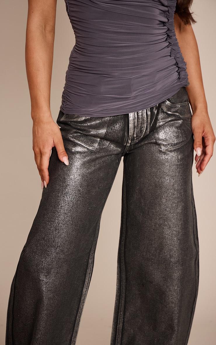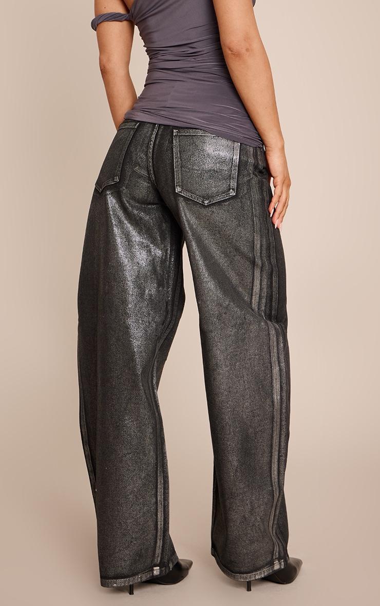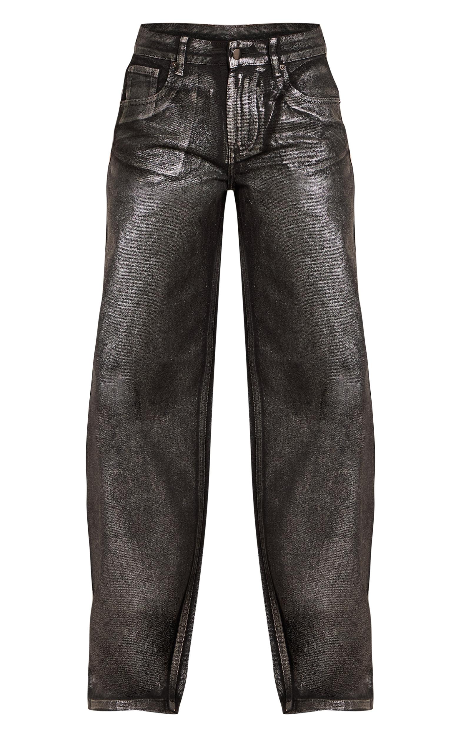 Redefine evening denim with these black metallic coated mid rise barrel jeans. This pair features a striking metallic coating, a confident mid-rise, and a contemporary barrel leg silhouette. Set the tone for a memorable night out with this statement piece. Team yours with a sleek bandeau top, elegant kitten heels, and a chic clutch bag to complete the look.Length approx 76cm/30inch (Based on sample size US 4)Model wears size UK 8/ EU 36/ AUS 8/ US 4Model Height - 5ft 8inchp]:!mb-4inch>Category: DenimProduct type: Wide Leg JeansColor: BlackMaterial: Rigid DenimOccasion: Evening