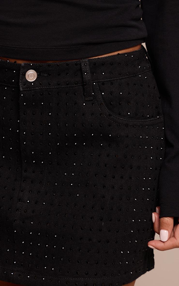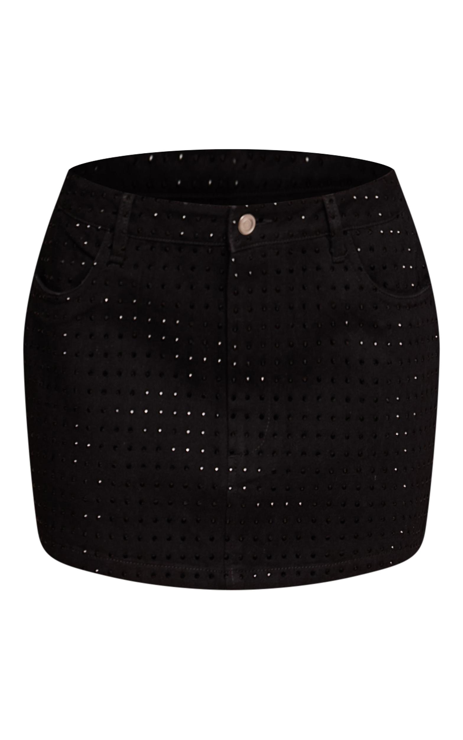 Own the evening in the black mid rise hotfix micro mini denim skirt. This mid-rise micro mini cut is detailed with shimmering hotfix embellishments. It’s the ultimate choice for evening plans. Pair it with a long sleeve top, gold heels, and a black bag for a look that turns heads.Length approx 33cm/13inch (Based on sample size US 4)Model wears size UK 8/ EU 36/ AUS 8/ US 4Model Height - 5ft 6inchp]:!mb-4inch>Category: DenimProduct type: Denim Mini SkirtColor: BlackMaterial: Rigid DenimOccasion: Evening