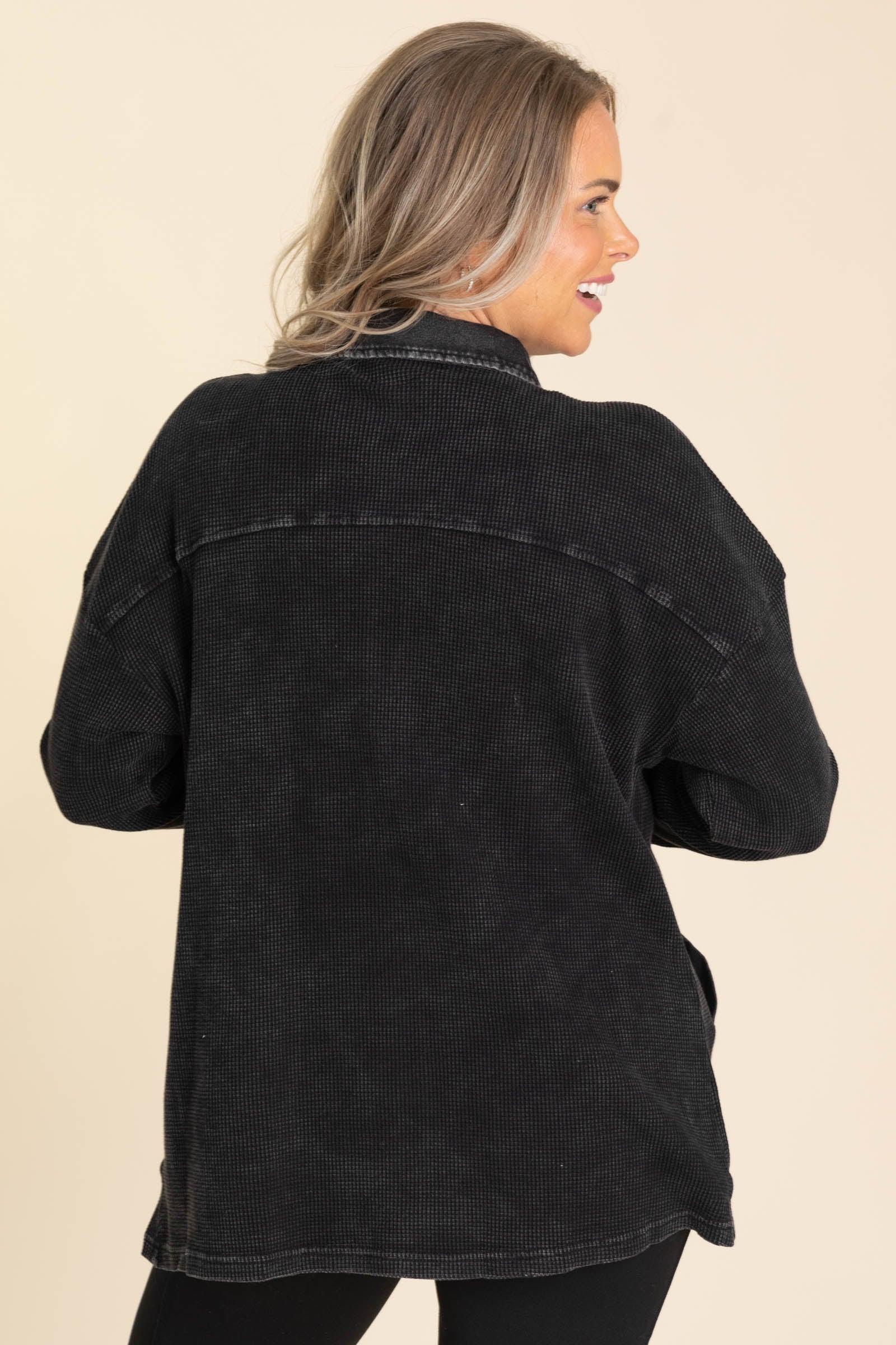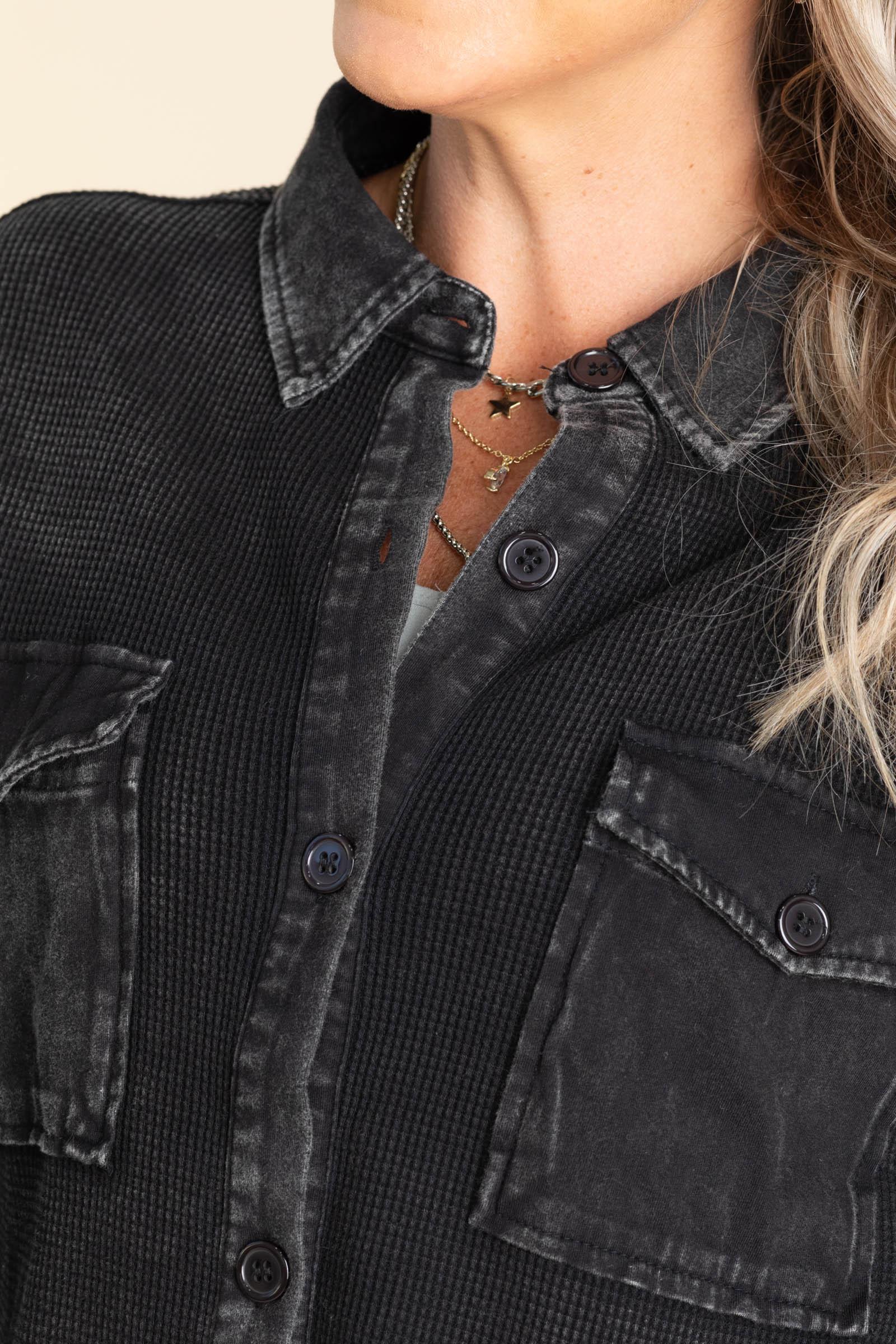 Product Details Colors: Black Print: Mineral Washed Neckline: Button Down Sleeve: Long Sleeve Hemline: Straight Brand: Timing Material and Care Self: 100% Cotton Contrast: 100% Cotton Hand Wash Cold Hang/ Line Dry Size and Fit Small: Bust 40" Waist 38" Length 28" Medium: Bust 42" Waist 40" Length 28.5" Large: Bust 44" Waist 42" Length 29" Erica is 5’7” and wearing her true size small