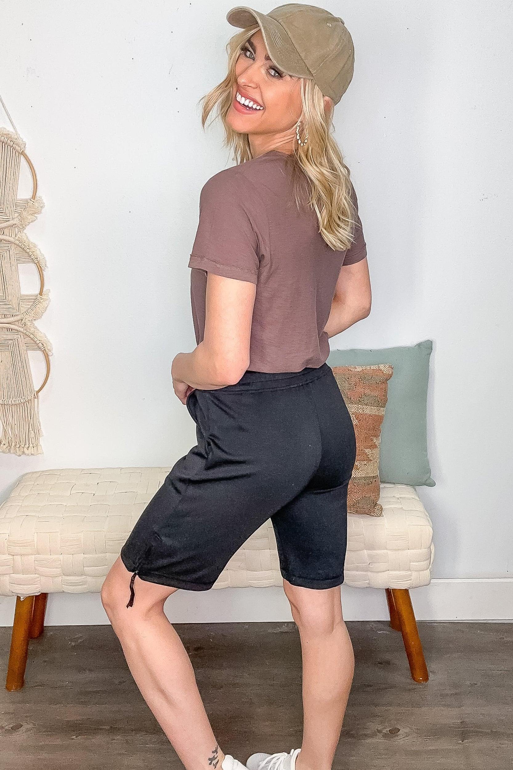 Product Details Color/Wash: Black Rise: High Rise Style: Boyfriend Fit With Adjustable Drawstring Brand: Mono B Material and Care 51% Modal 44% Polyester 5% Spandex Machine Wash Cold Tumble Dry Low Size and Fit Small: Waist 28" Rise 12.5" Inseam 9" Medium: Waist 30" Rise 12.5" Inseam 9" Large: Waist 32" Rise 13.5" Inseam 9" Video model is 5’8 and wearing size small