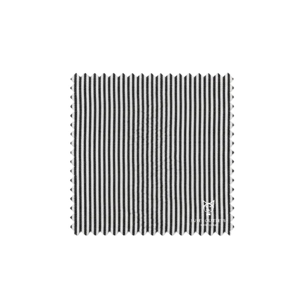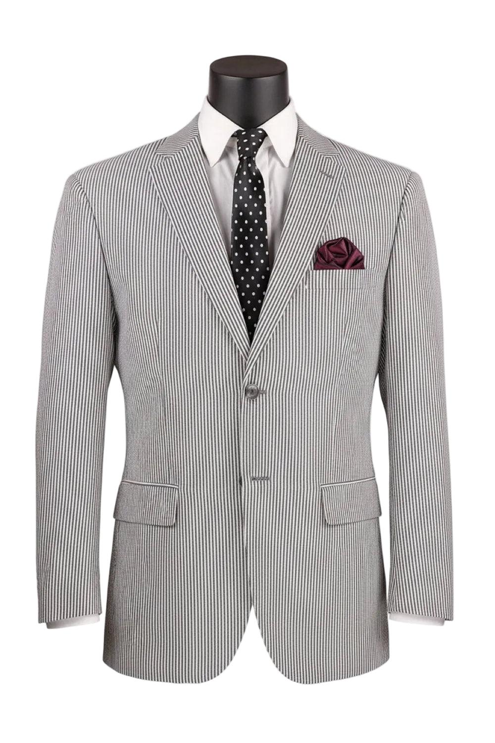 Jacket Modern Fit Single-Breasted Striped seersucker Notch Lapel 2 Button Closure Side Vents Two Front Pockets with Flap Closure Pants Flat Front Pants Un-Hemmed Bottoms Adjustable Waistband Inseam 36" Two Front Pockets Angled (Slip Pockets) Two Back Pockets (Button Closure)