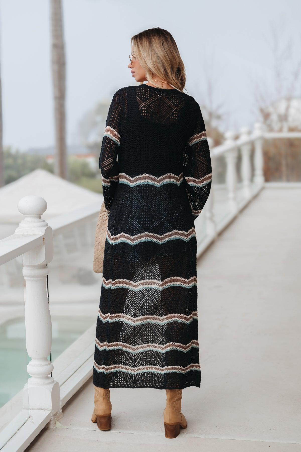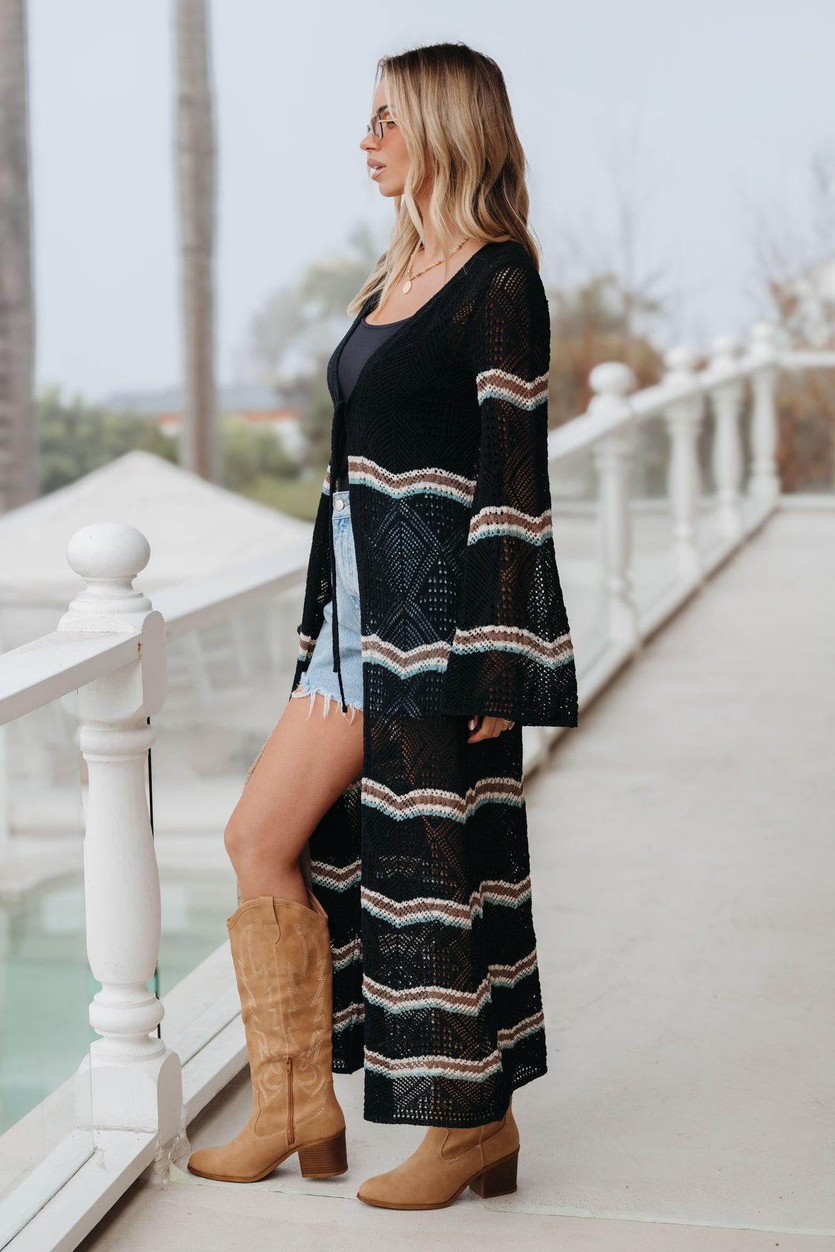 Add boho-chic charm to your wardrobe with the Black Multi Stripe Crochet Duster Cardigan! Featuring a vibrant striped pattern and intricate crochet knit detail, this ankle-length cardigan makes a bold style statement. The relaxed fit and bell shaped sleeves offer a flowy, effortless silhouette, while the open front with a tie closure provides versatile styling options. This lightweight and breathable piece is perfect for layering over casual outfits or swimwear. Elevate your look with this must-have duster cardigan for any season!