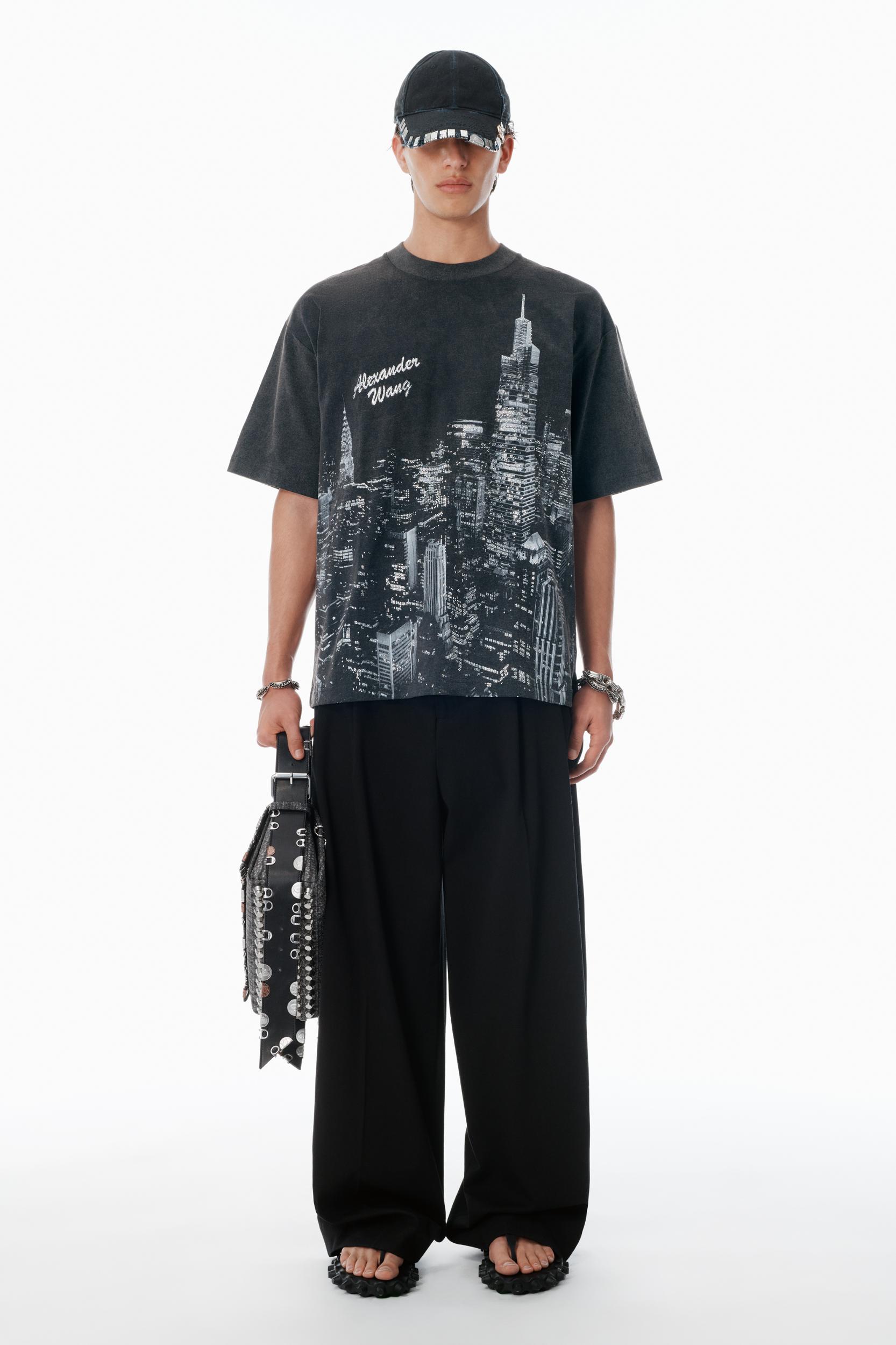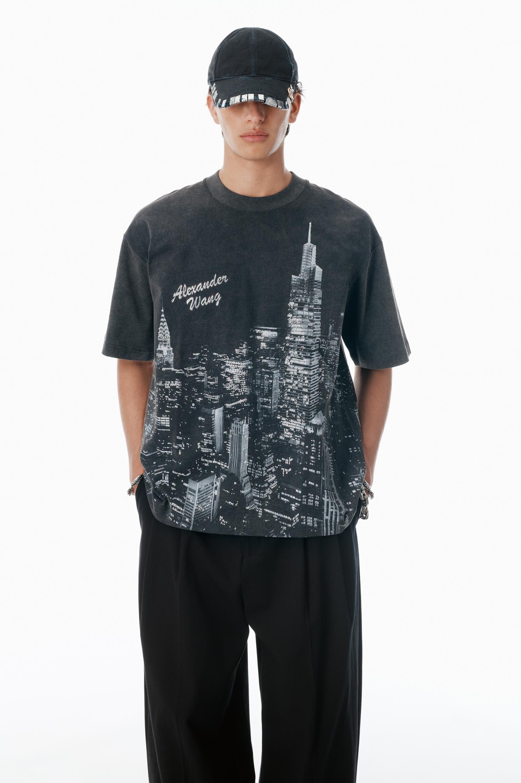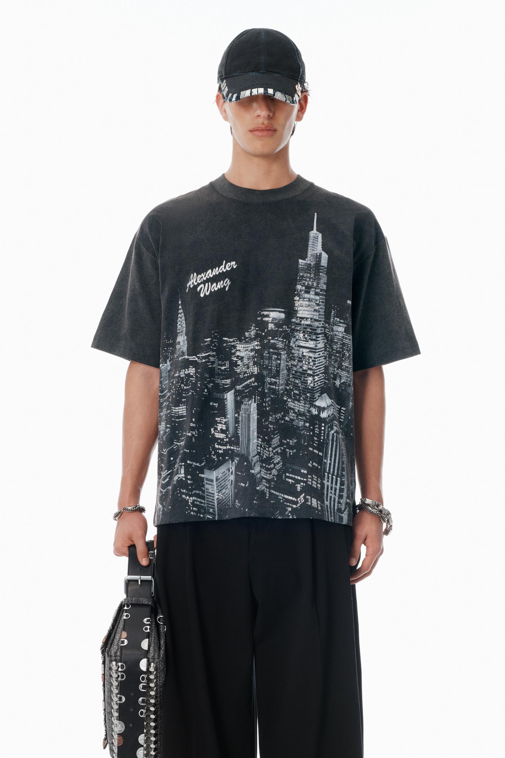 Crystal hotfix accents this boxy jersey T-shirt, featuring a New York City skyline discharge print in a faded black wash.