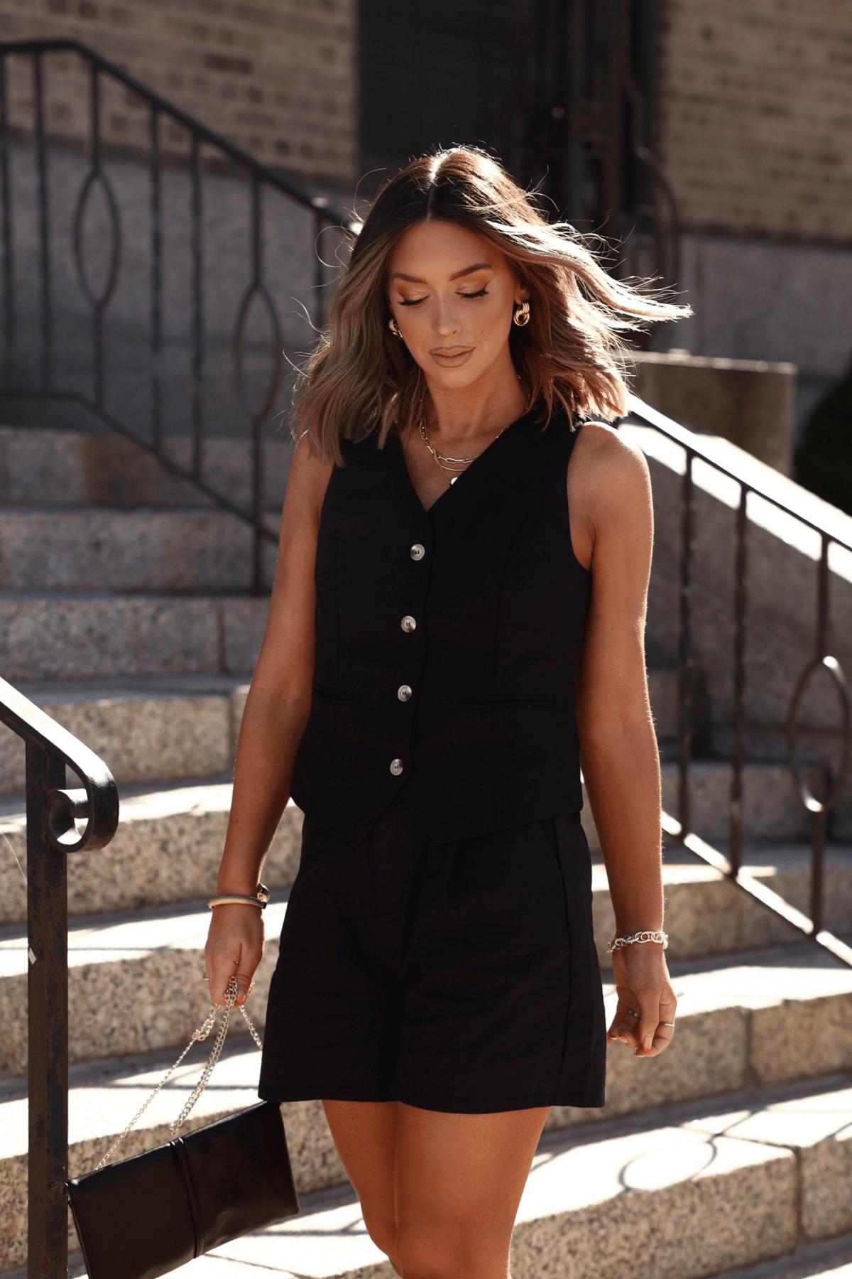 Sleek and sophisticated, the Black Sleeveless Button Down Vest is a versatile piece for chic layering or stand-alone style! Featuring a V neckline and button-down front, this vest is designed with clean lines and front welt pockets for a tailored look. Crafted from a breathable cotton/linen blend, it offers both comfort and structure. Pair it with the matching Black Pleated Linen Shorts for a polished, coordinated outfit that’s perfect for any occasion!