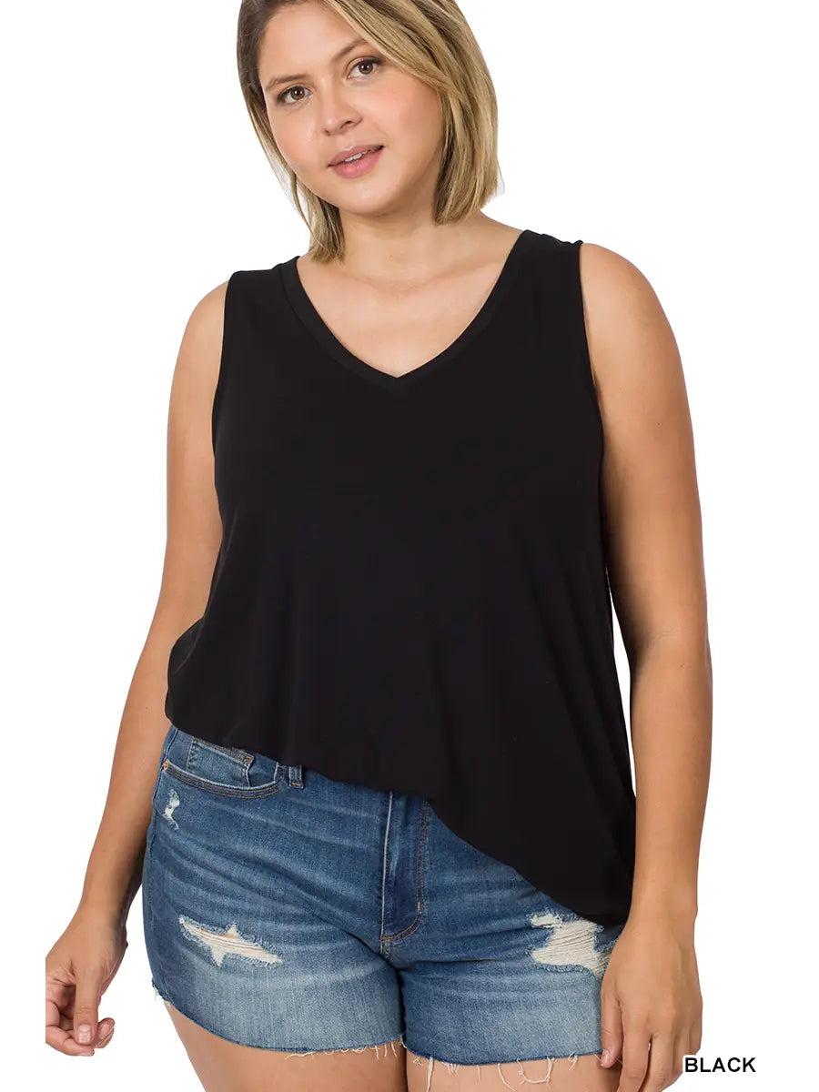 Looking for a top that's both playful and flattering? Look no further than our sleeveless V-neck top for plus size! Black in color so goes with pretty much anything! Dress this up or down! You cannot go wrong with this adorable tank!