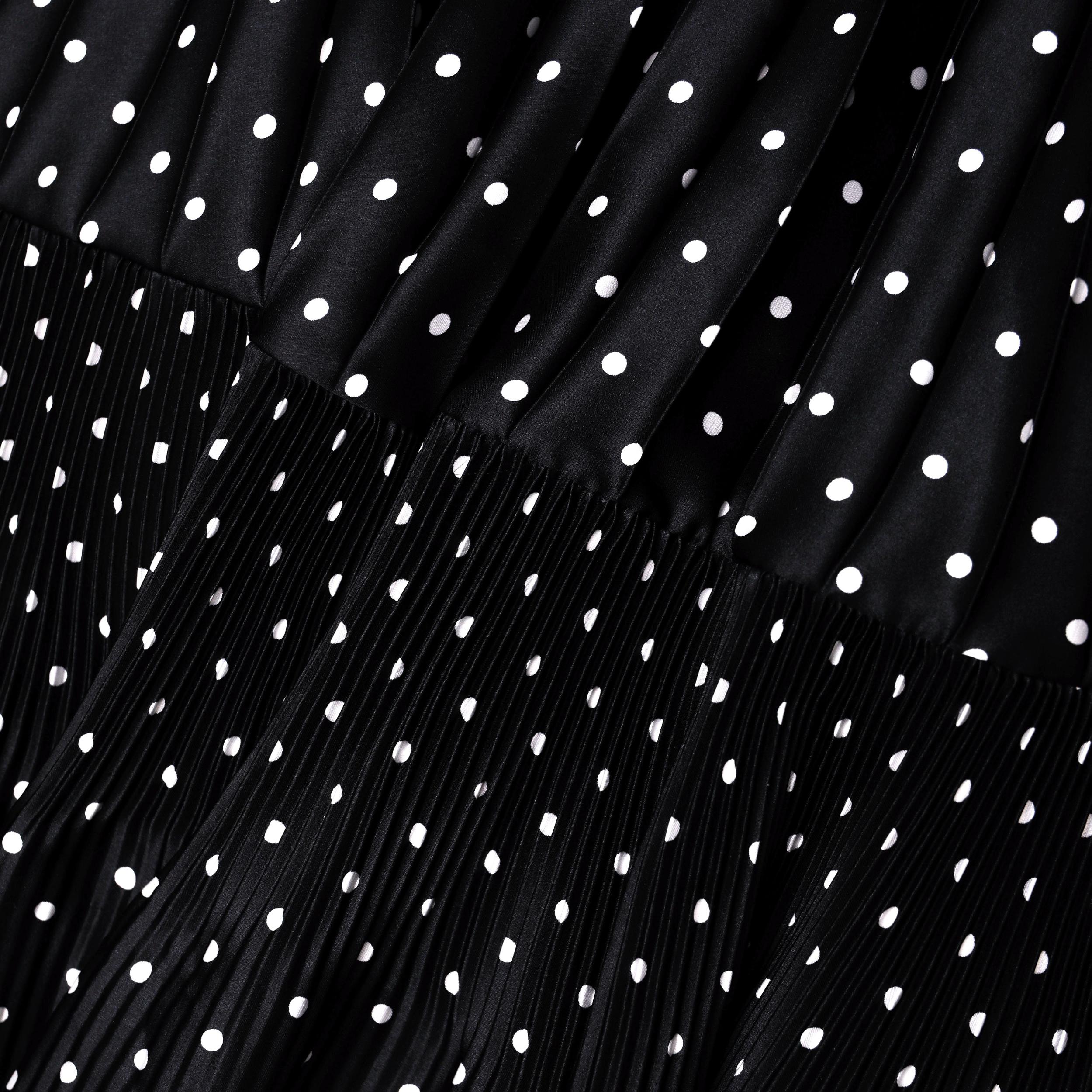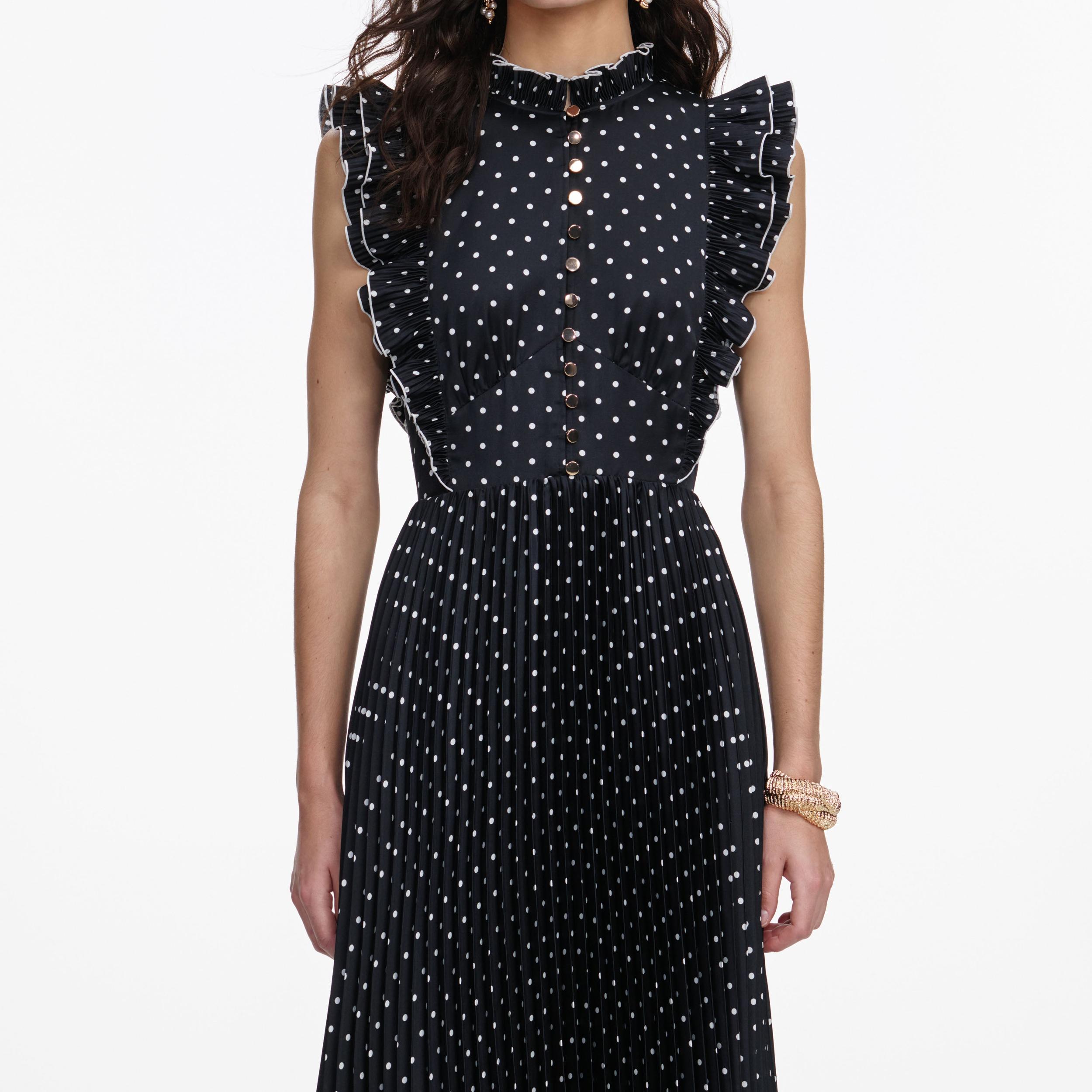 Boasting playful polka dots for a party-friendly feel, this maxi dress' ruffled bodice echoes its twirl-worthy pleats. Gold buttons nod to vintage glamour – style it with heels at your next soirée. Fitted styleThis style has minimal stretchButton closure down frontRuffle detailingHigh neckModel is 5ft10/178cm and wears a size UK 6