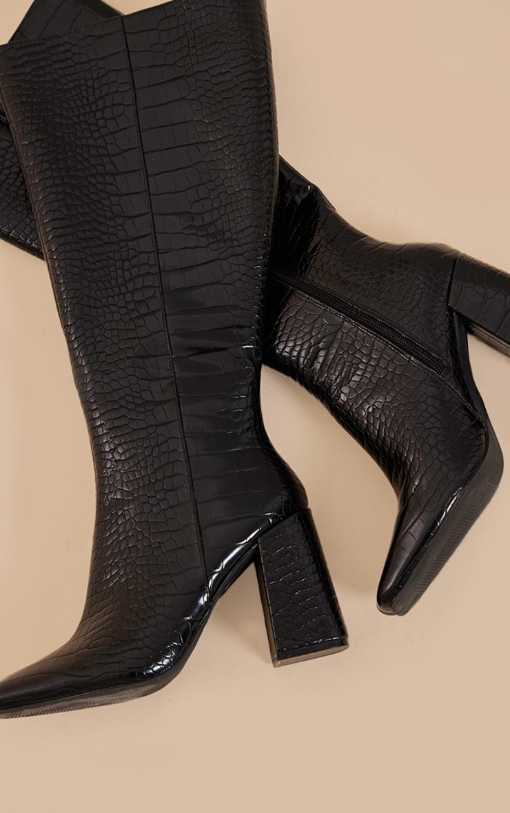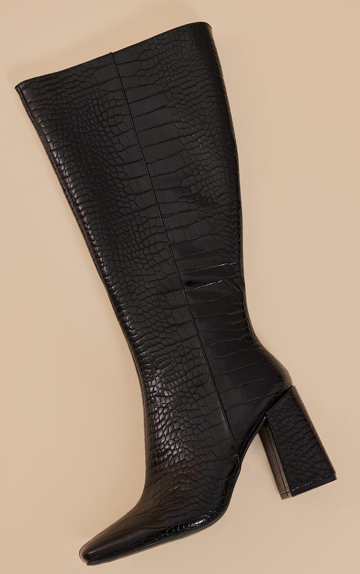 Elevate the vibe with these black PU croc square toe knee high heeled knee boots. Their black PU croc material is super chic and its square-toe design brings a touch of luxe. These knee-high boots have a block heel which make them so comfy and can be worn all night long. We're obsessed with these boots and you should be too. PU Zip fastening 4 Heel