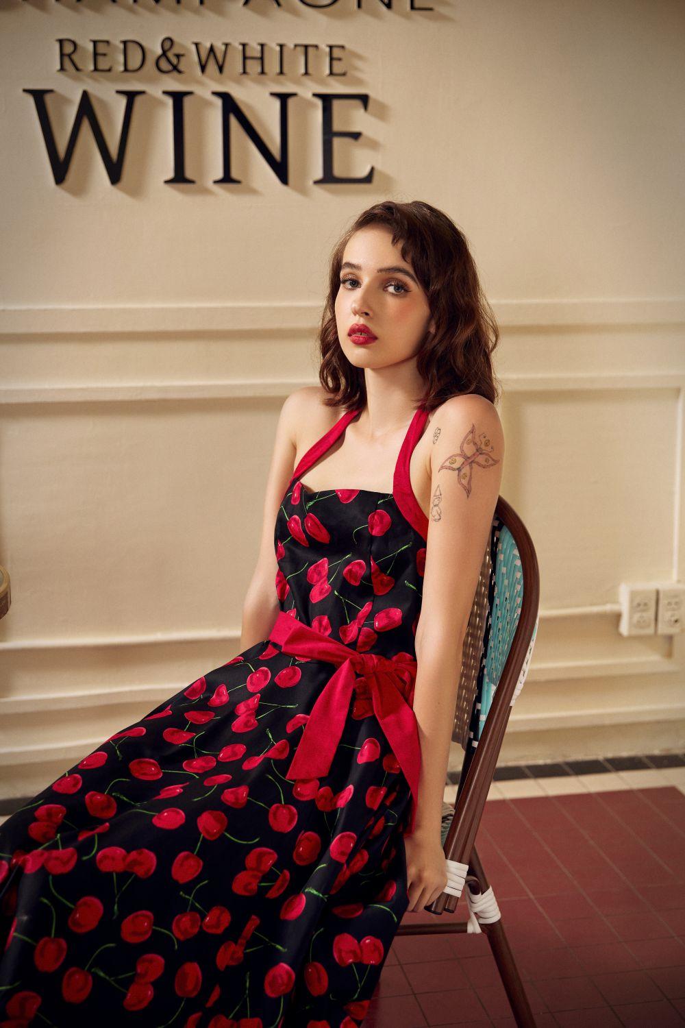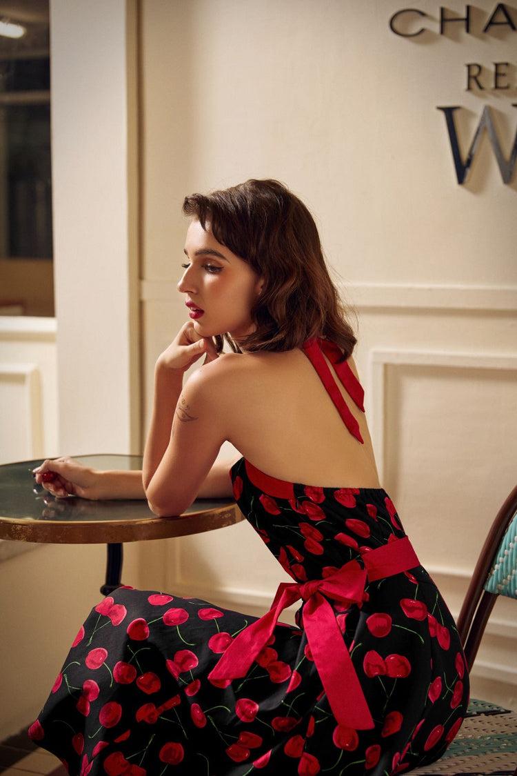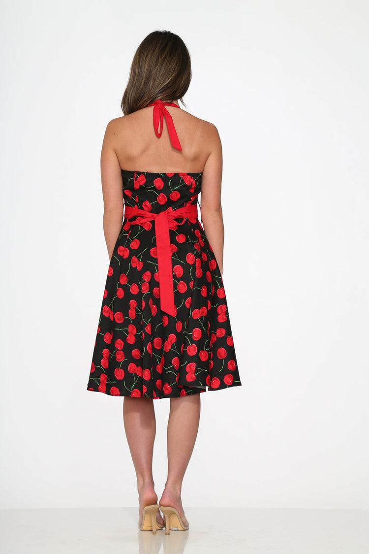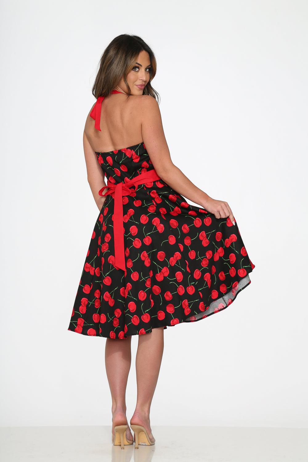 Channel classic pin-up style with the Black & Red Cherry Halter Dress by Orchid Bloom. Featuring a bold red cherry print on a sleek black background, this halter-style swing dress brings vintage flair to warm-weather days and fun nights out.Crafted from a breathable cotton-spandex blend, it offers just the right amount of stretch for a comfortable and flattering fit. Designed with a center back zipper and side pockets, this dress combines style, function, and a touch of nostalgia.Fabric Composition97% Cotton, 3% SpandexFabric provides stretchLength: 41"ImportedDesign DetailsHalter necklineCenter back zipperSide pockets