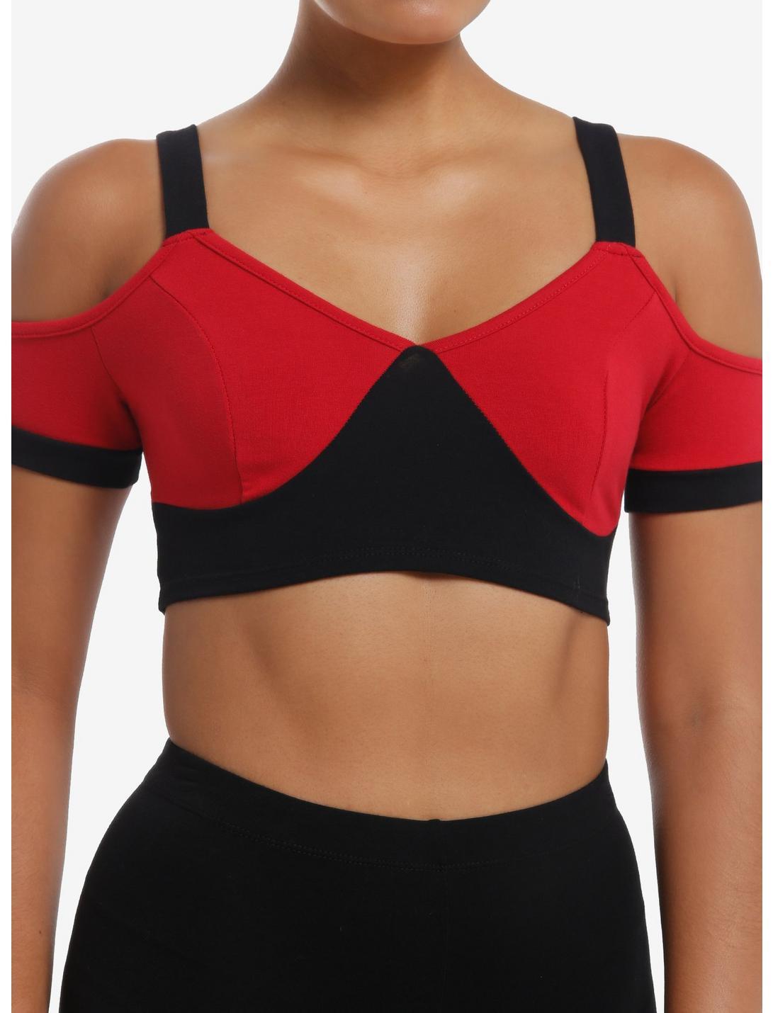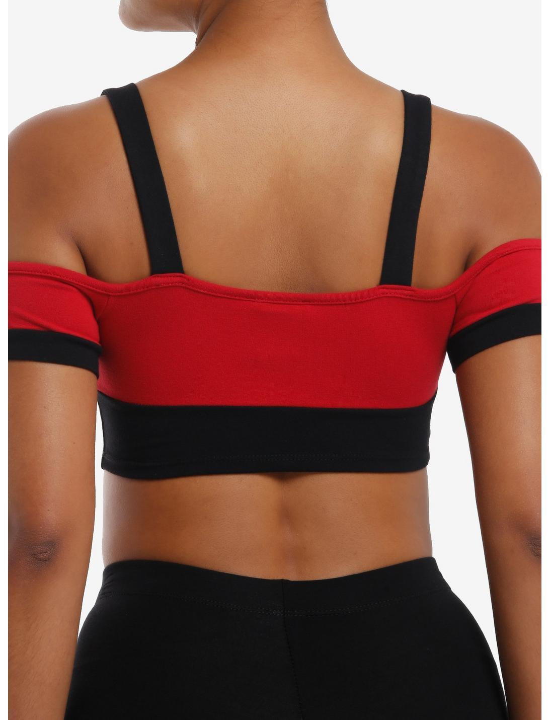 Keep it cute in this bralette! Featuring red and black color-blocking and cold shoulders.95% cotton; 5% spandexWash cold; dry lowStretchy materialLength: 12 1/2''ImportedListed in junior sizesModel wears size Small