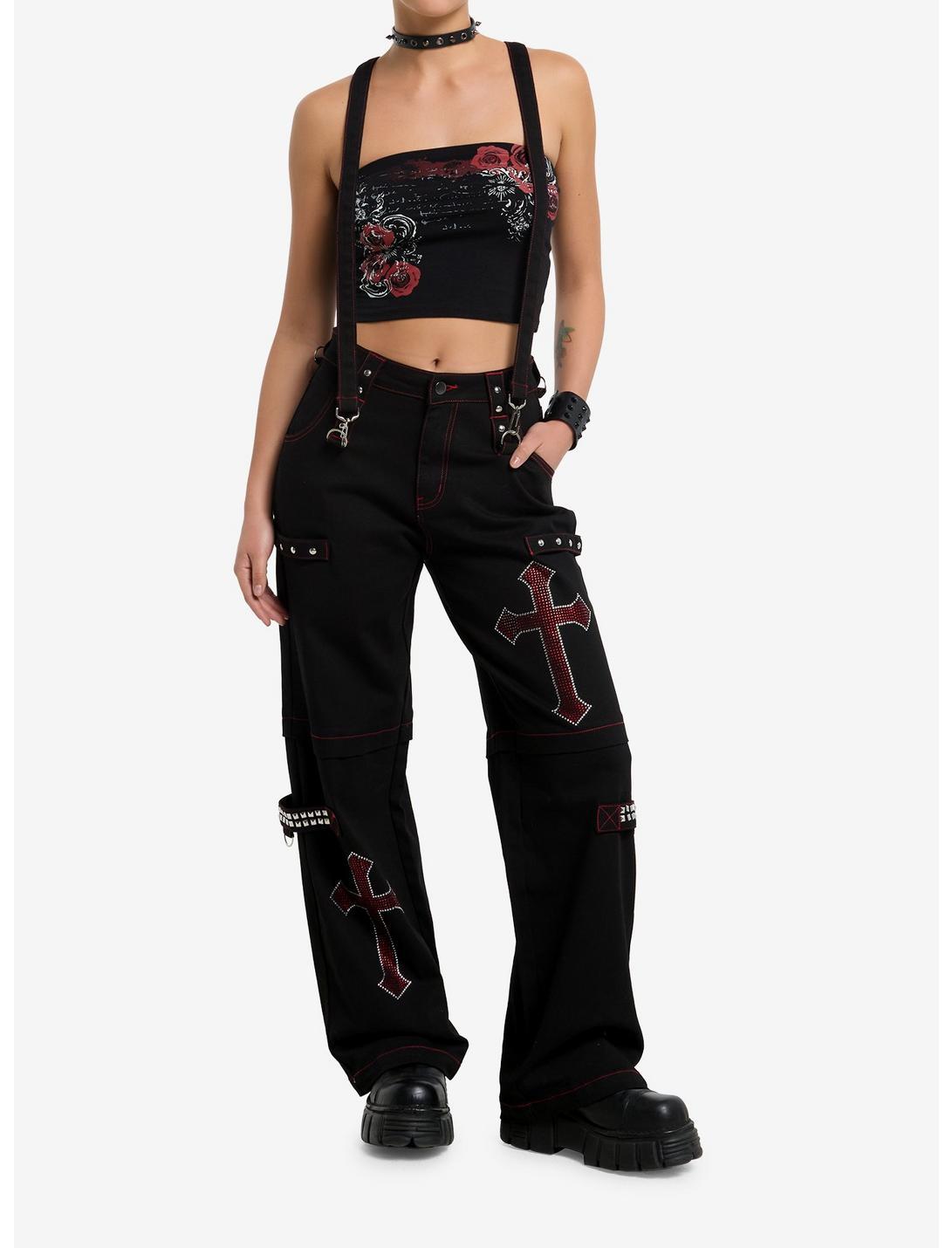 Cross the line into edgy territory with these statement pants! Featuring red rhinestone cross designs down the legs, plus strap detailing with stud accents. They have a wide leg fit and come with pockets and removable suspender straps.97% cotton; 3% spandexWash cold; dry lowRise: 13''Inseam: 30''ImportedListed in junior sizesModel is 5'7''Model wears size 3