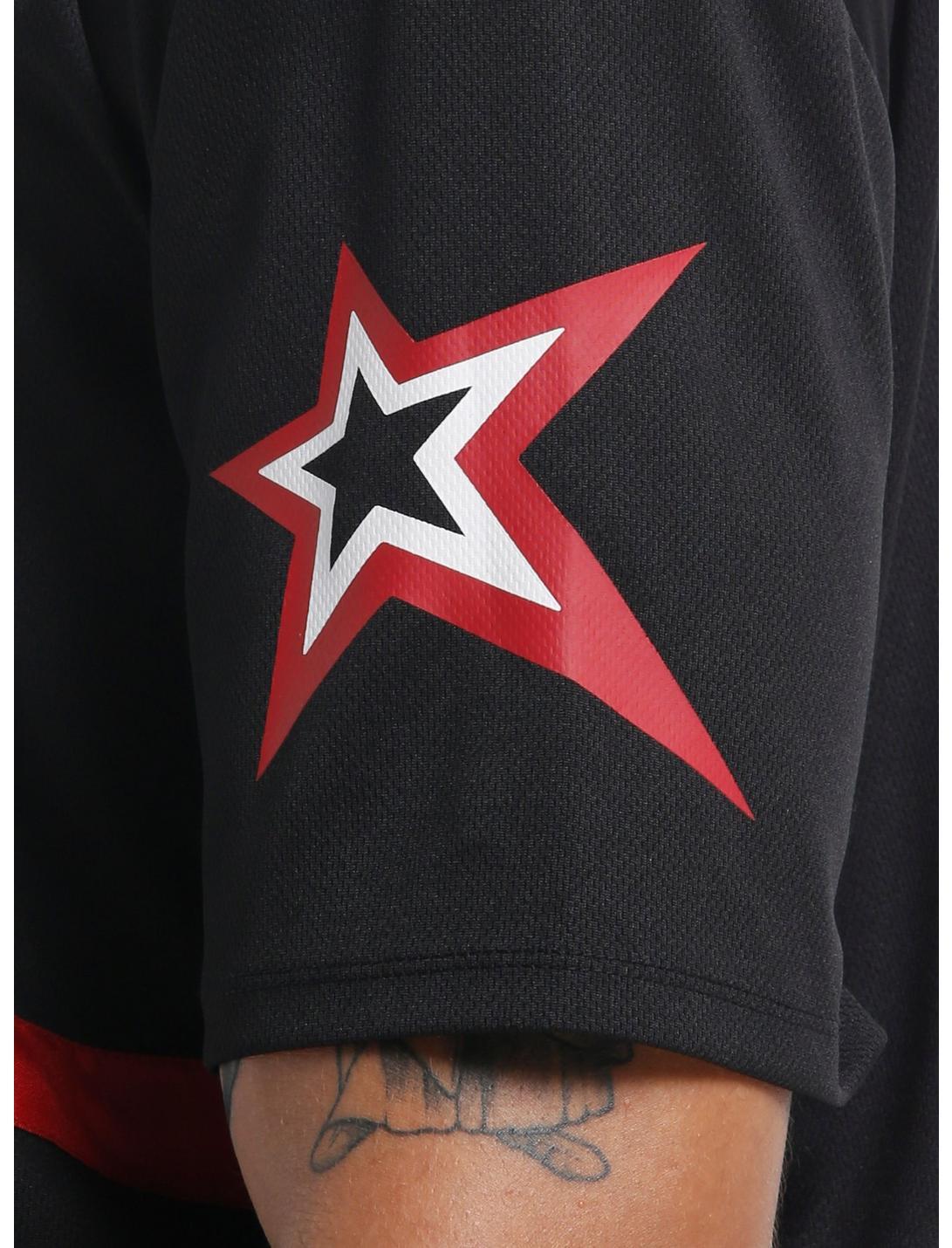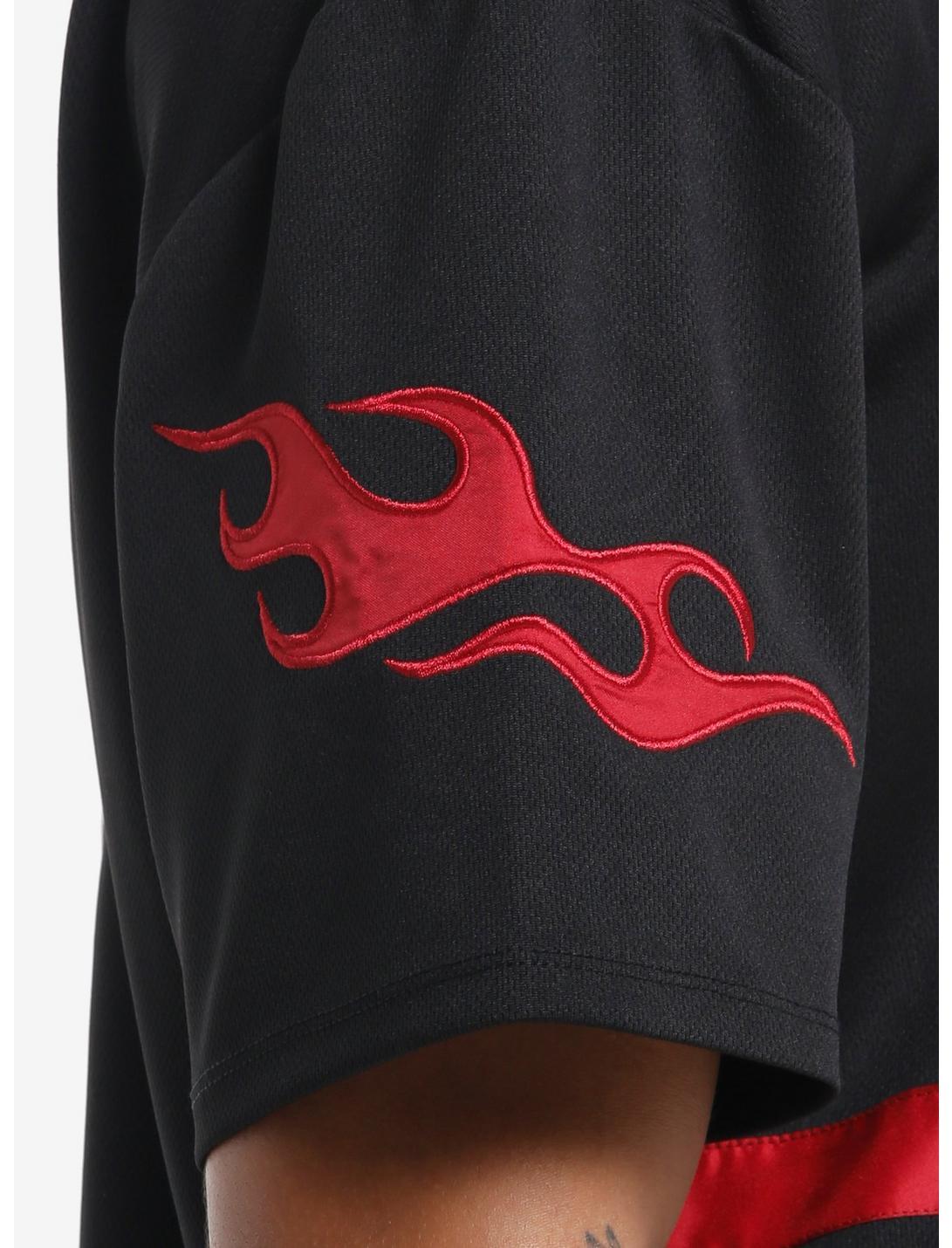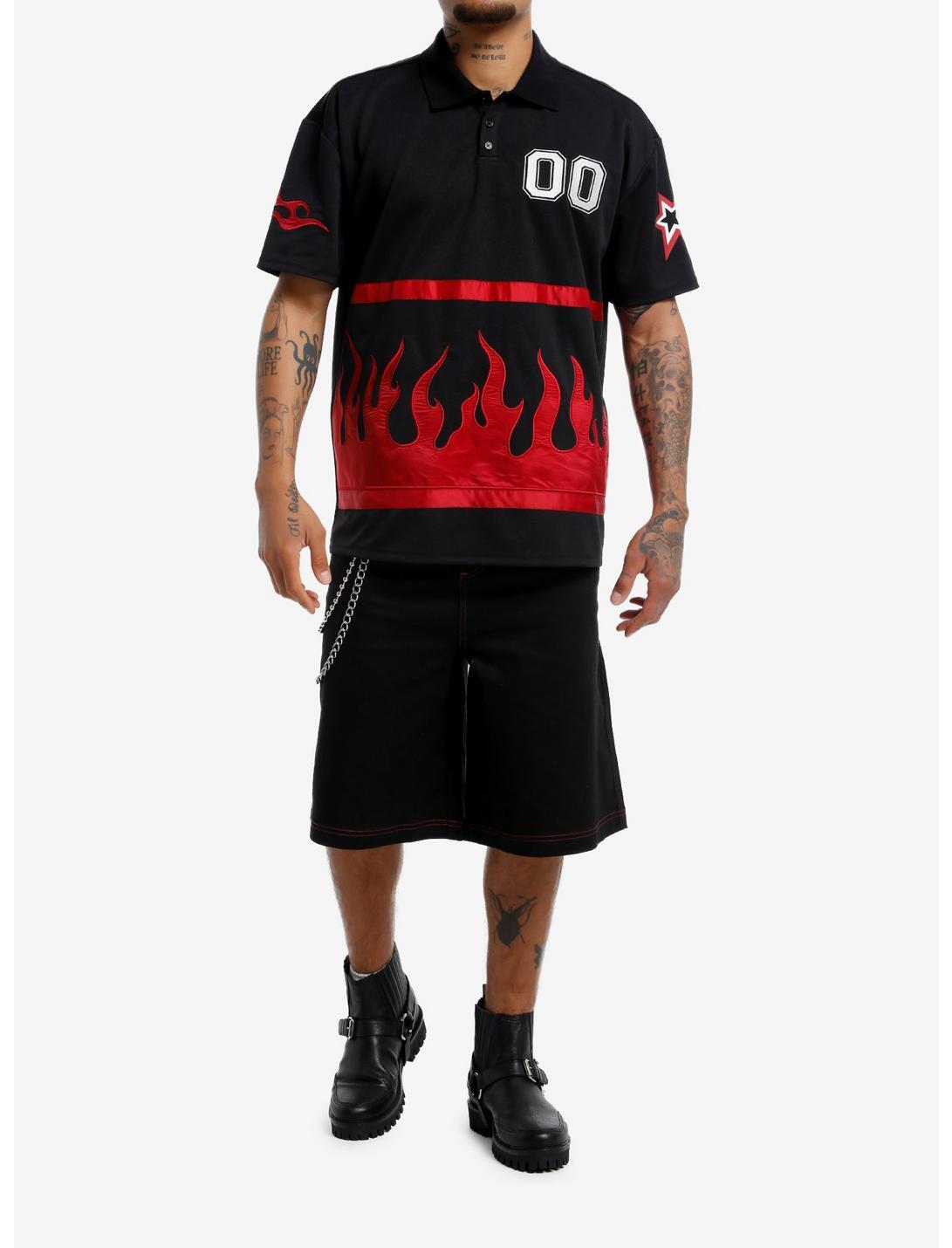 Ride or die! This black polo-style shirt is decorated with appliquéd flames across the bottom and on the right sleeve. There's a "00" embroidered on the front chest. The back is printed with "Ride or Die" text and a red circle decorated with stars and a winged skull. 95% polyester; 5% spandexWash cold; dry lowImportedListed in men's/unisex sizesModel is 6'1"Model wears size Medium