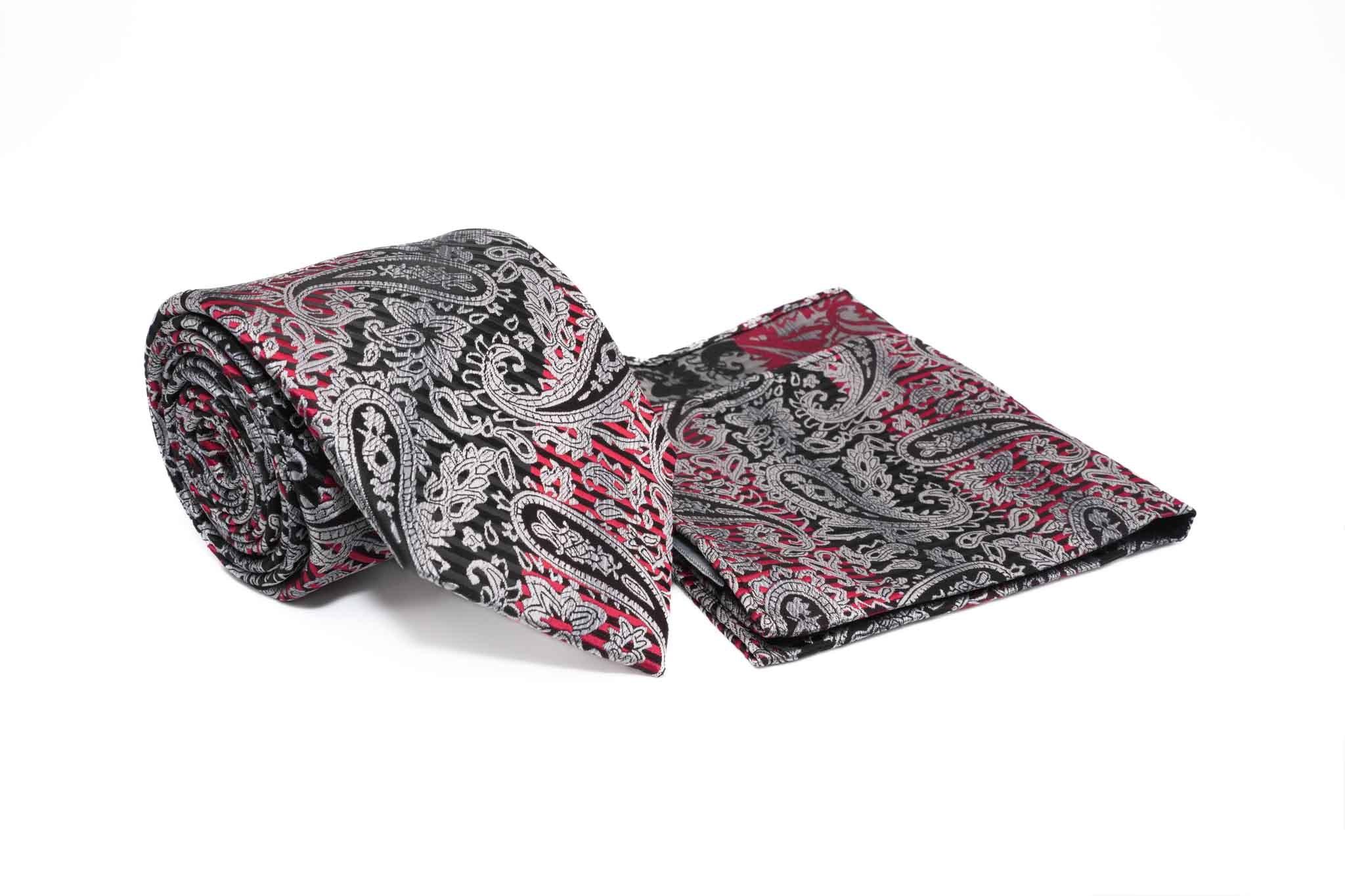 Black and Red Paisley Pattern Bold Stripe Pattern 2 Pieces Set Includes Tie and Pocket Square Tie Length. Approx. 3"×57" Pocket Square. Approx. 10"×10" Our men's tie are designed to impress in any given situation. With this classic blend of pin-stripe and paisley design creates a perfect combination of style and trend. wearing this tie is a distinct marker of your flawless taste and sophistication.