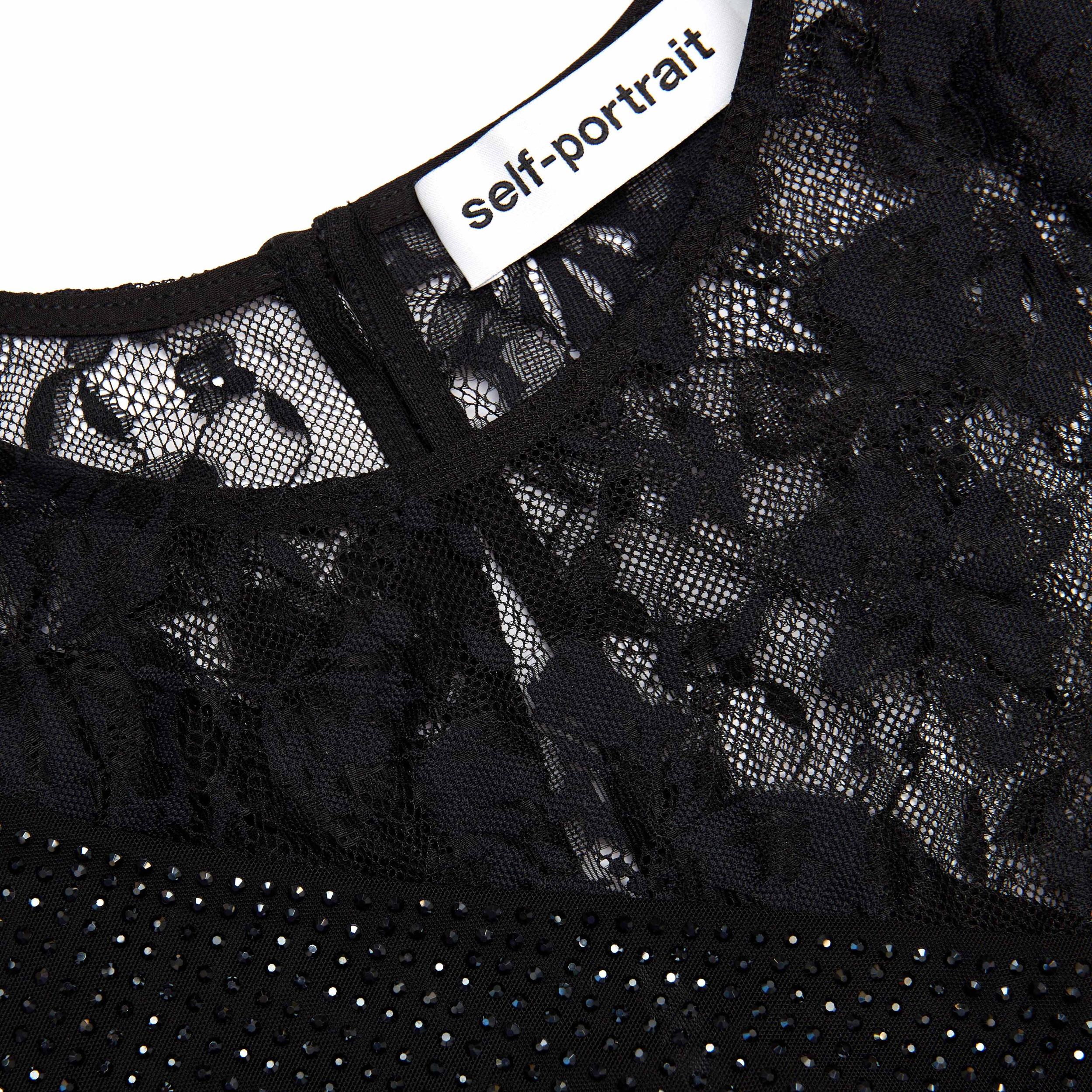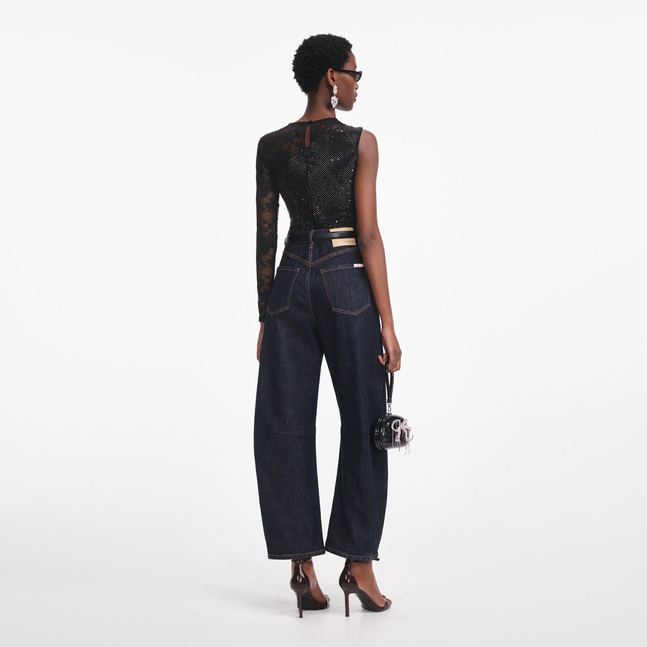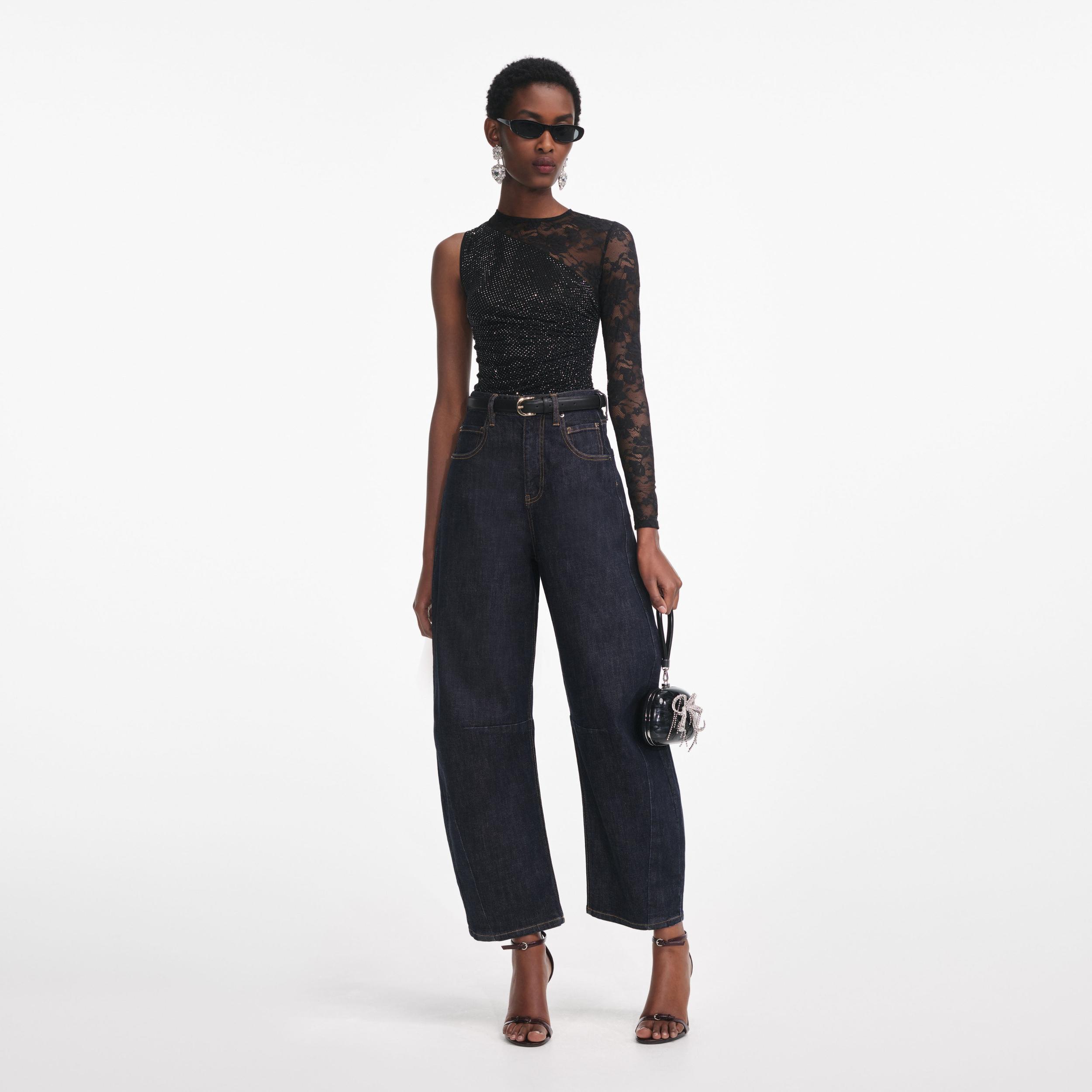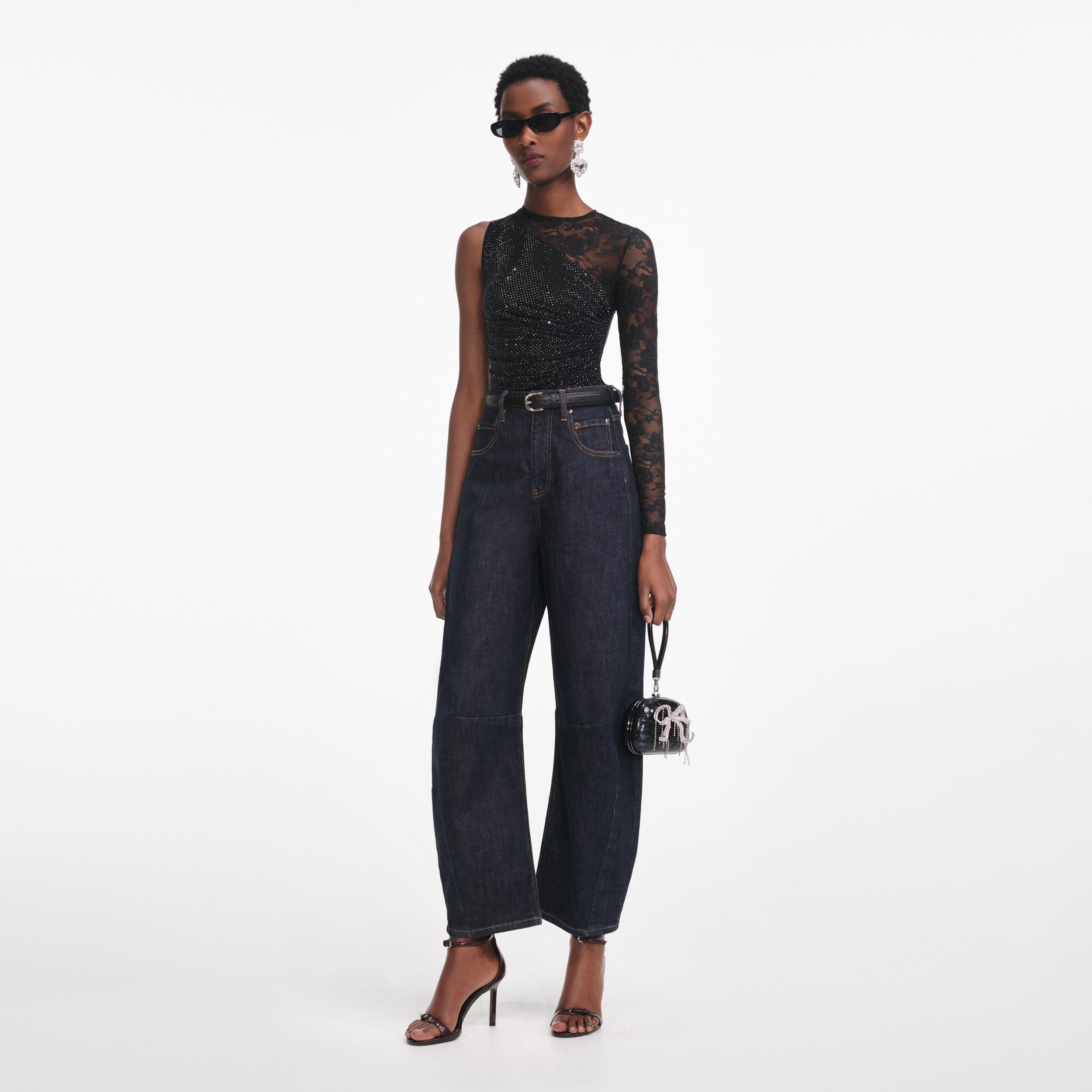 Romance and glamour make a covetable double bill in this rhinestone-studded lace top. An asymmetric cut adds extra intrigue – style with jeans and statement heels for an instant party look.Fitted style, take one size up if between sizesFabric has stretchZip closure at backLace panellingAsymmetric long sleeveModel is 5ft10/178cm and wears a size UK 6