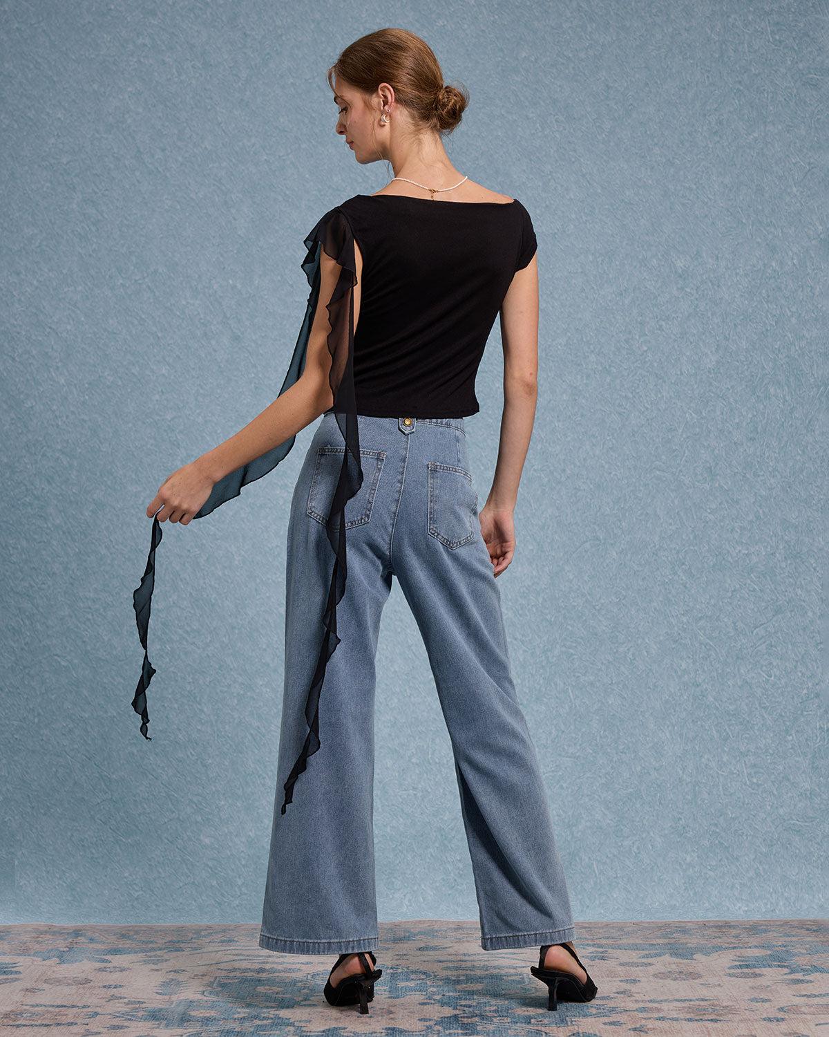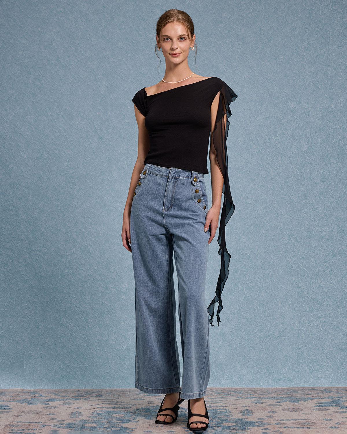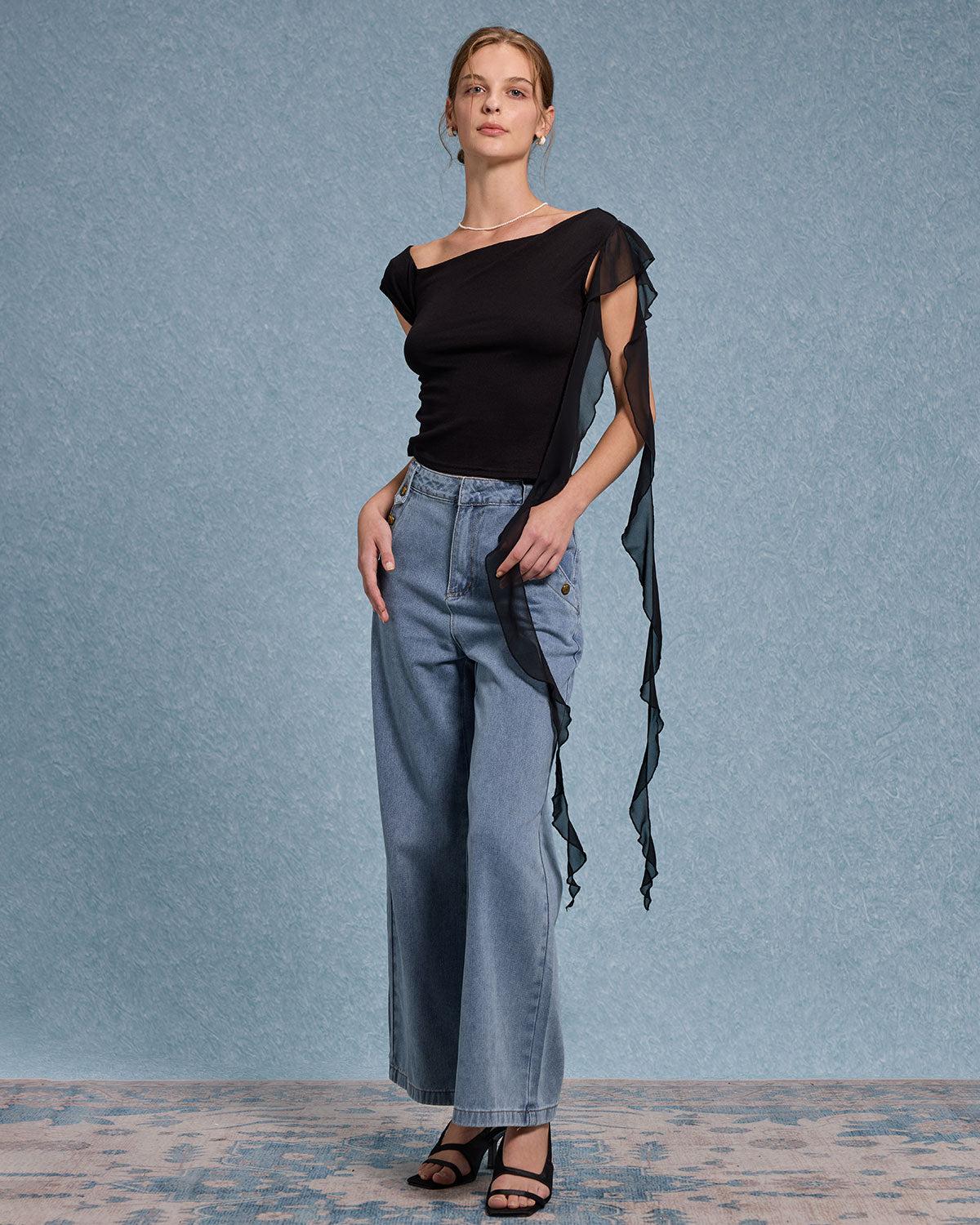 - Occasion: Daily - Style: Casual - Fabric Stretch: Medium Stretch - Sleeve Length: Short Sleeves - Sleeve Type: Cap Sleeve - Pattern Type: Solid - Embellishment: Ruffle - Neckline: Asymmetrical - Fit: Slim - Fabric: Polyester 34.0%, Nylon 19.0%, Spandex 4.0%, Viscose 43.0%