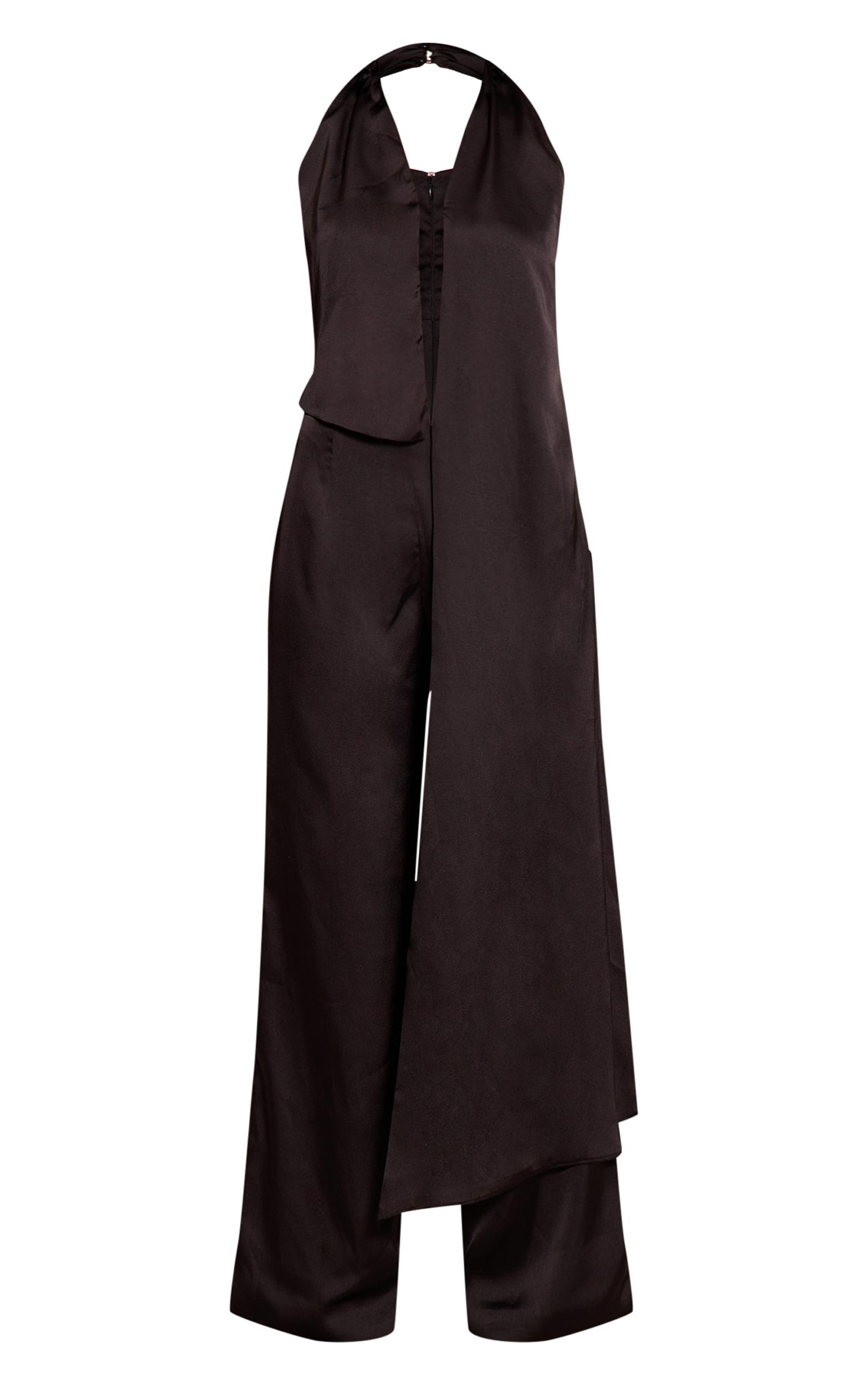 The evening calls for a truly distinctive aesthetic. The black satin drape wide leg jumpsuit embodies modern drama, featuring a plunging halter neckline that melts into an expertly draped bodice. An extended sash panel creates an intriguing, flowing silhouette, complementing the wide leg cut that moves with refined nonchalance. Complete the ensemble by pairing this with towering high heels and a selection of bold silver jewelry for a self-assured presence, ideal for any elevated evening.Length approx 155cm/61inch (Based on sample size US 4)Model wears size UK 8/ EU 36/ AUS 8/ US 4Model Height - 5ft 8inchp]:!mb-4inch>Brand: PrettyLittleThingCategory: DressesProduct type: Wide Leg JumpsuitColor: BlackMaterial: SatinOccasion: Evening