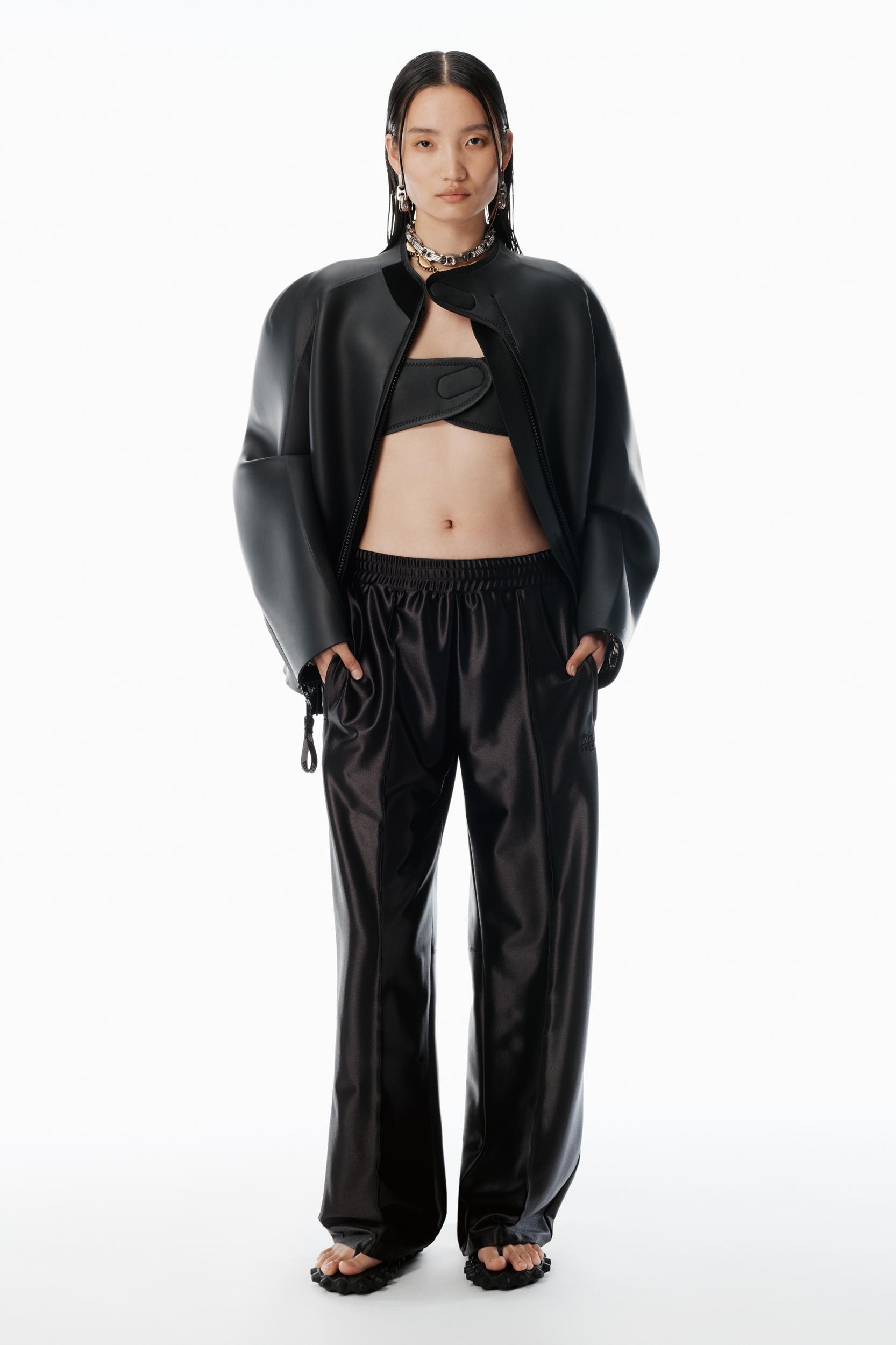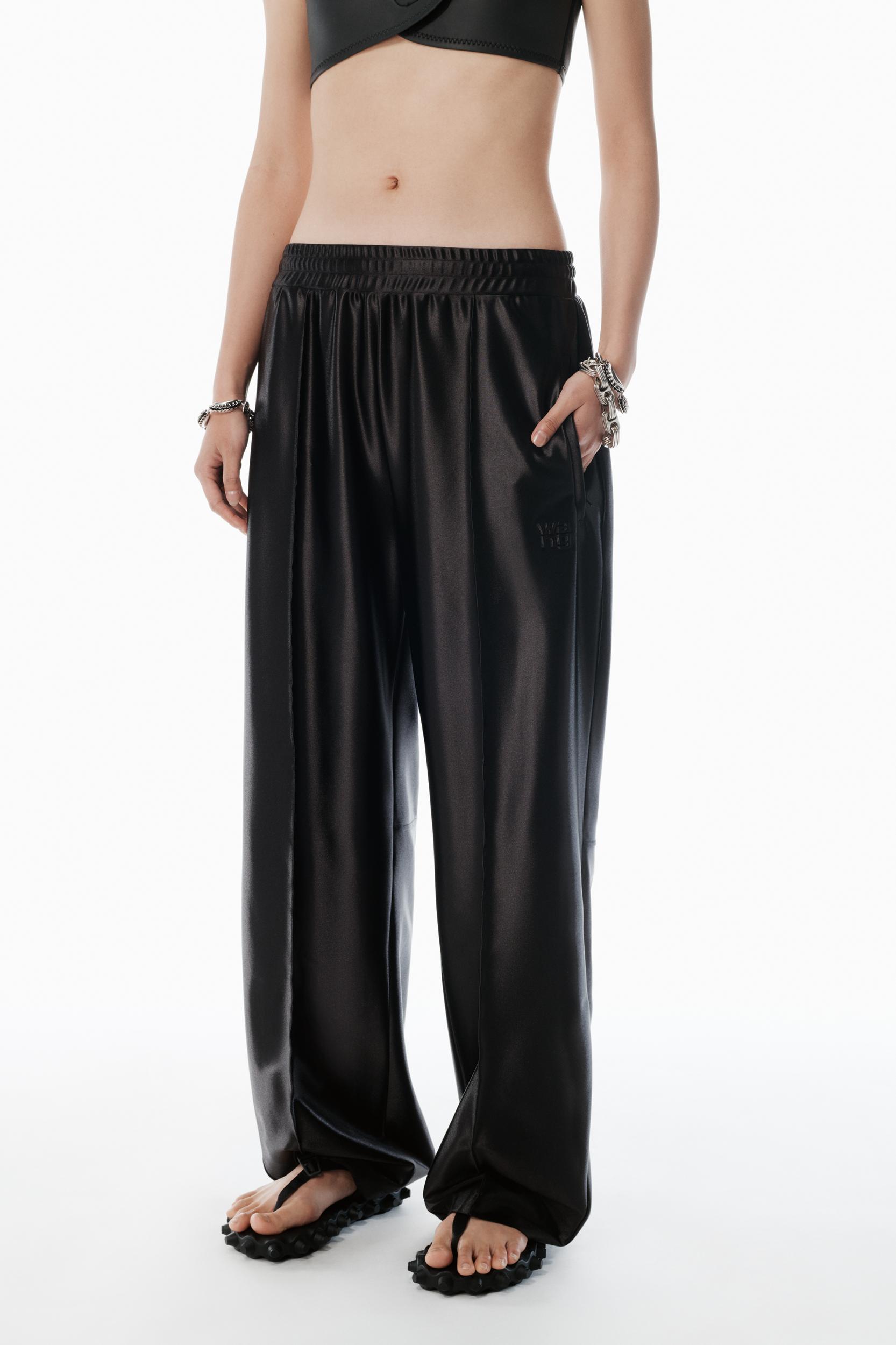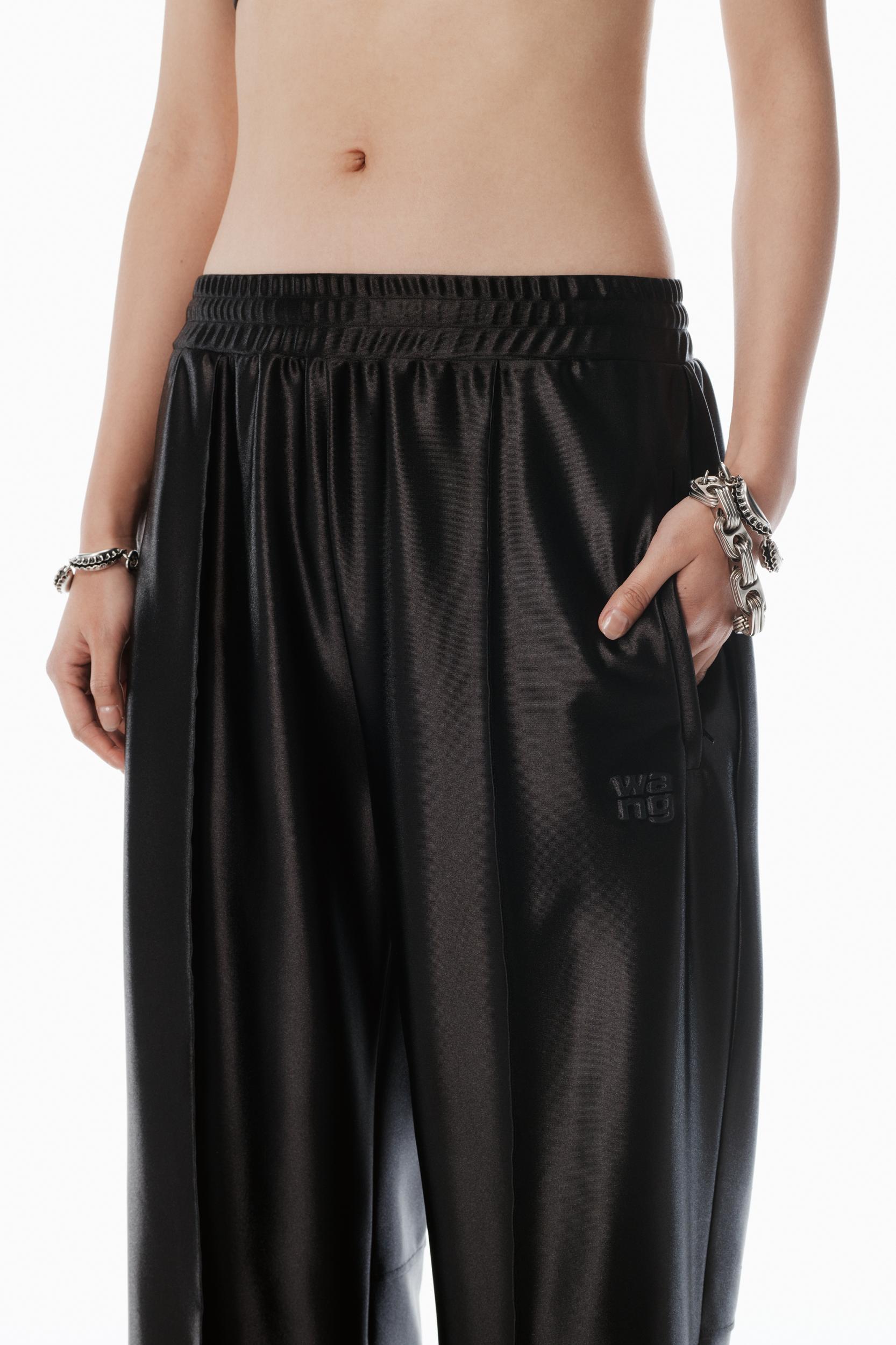 cut with an articulated leg, these satin faille sweatpants in Black feature side-zip welt pockets, an interior drawcord waistband, and showcase a stacked logo at the thigh.